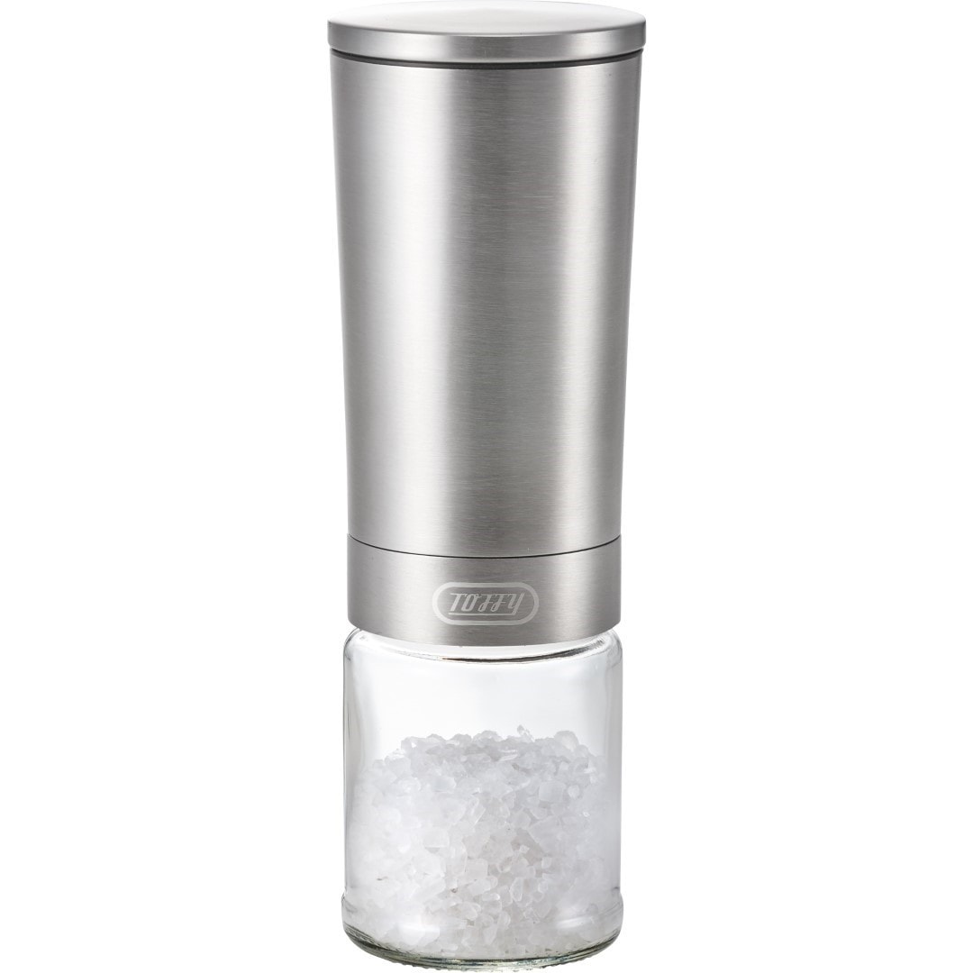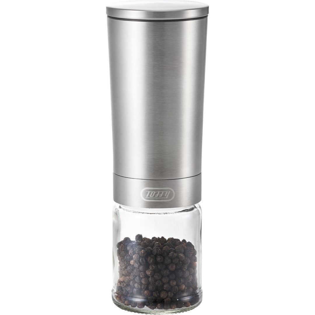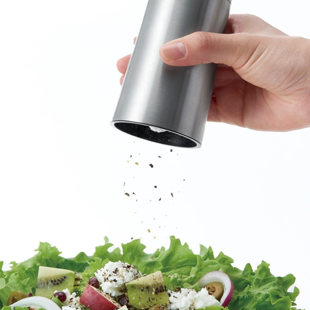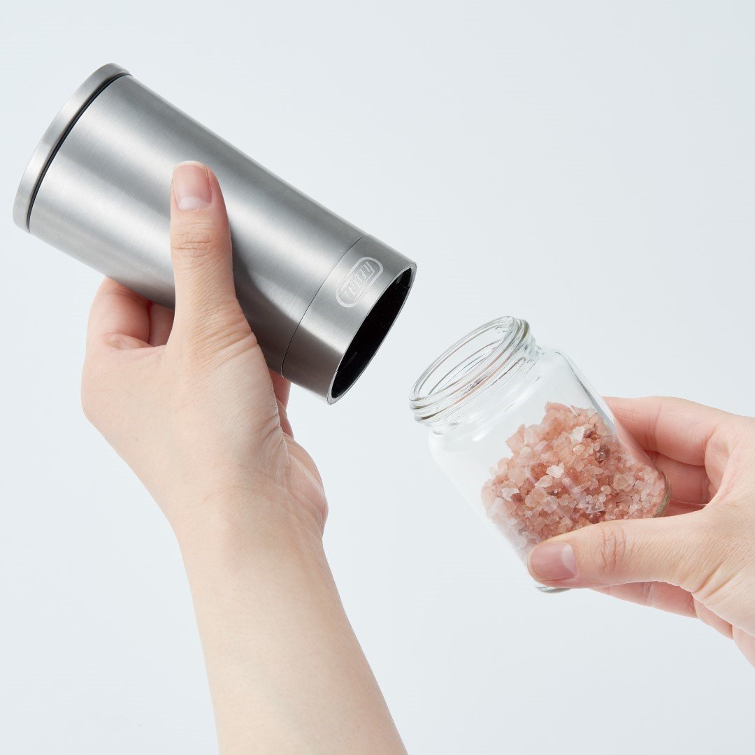 簡単操作がうれしい。傾けるだけの電動自動ミル傾けるだけで挽ける自動ミルです。手動で回さなくていいので片手で簡単に使用できます。丈夫なセラミック製の刃なので切れ味が鋭く、錆びにくいのが特徴です。ダイヤルを合わせてお好みの粗さに調整が可能。ホコリを防ぐフタつき。調理中にもサッと使える使い勝手のいいサイズ片手で持てていつでもサッと使いやすいサイズ感です。調理台にもダイニングテーブルに置いても邪魔にならないスリムさ。セラミック刃で指などを切らないようご使用の際はご注意ください。調味料を充填する際は、ボトル全体の8割ほどを目安にしてください。挽きたてスパイスで料理の完成度を格上げ片手で傾けると自動で挽くので手が疲れません。挽きたての調味料は風味が豊か。同じ量の調味料を使用しても、挽きたてかそうでないかでお料理の完成度にも違いが。岩塩やブラックペッパーなどの粒胡椒にご使用いただけます。大容量の広口ガラスボトルで使い勝手GOOD調味料の詰め替えがしやすい広口のボトル。容量も100mlとたっぷり入ります。ガラス製のボトルは匂いや色が移りにくいので、異なる調味料を入れ替えても気になりません。出し口を上にして立てて保管。フタ付きなので、ホコリの混入や挽き残りの調味料がこぼれにくいです。中身の変更が簡単。料理好きな方へのギフトにもボトルは簡単に付け替えが可能。調味料やペッパーごとに別売りのボトルを複数用意しておき、使いたい時に本体に取りつけて使えます。ボトルの変更が簡単なので、一つの本体で何通りもの調味料が使えるのがうれしい。お料理好きな相手へのプレゼントにも最適です。