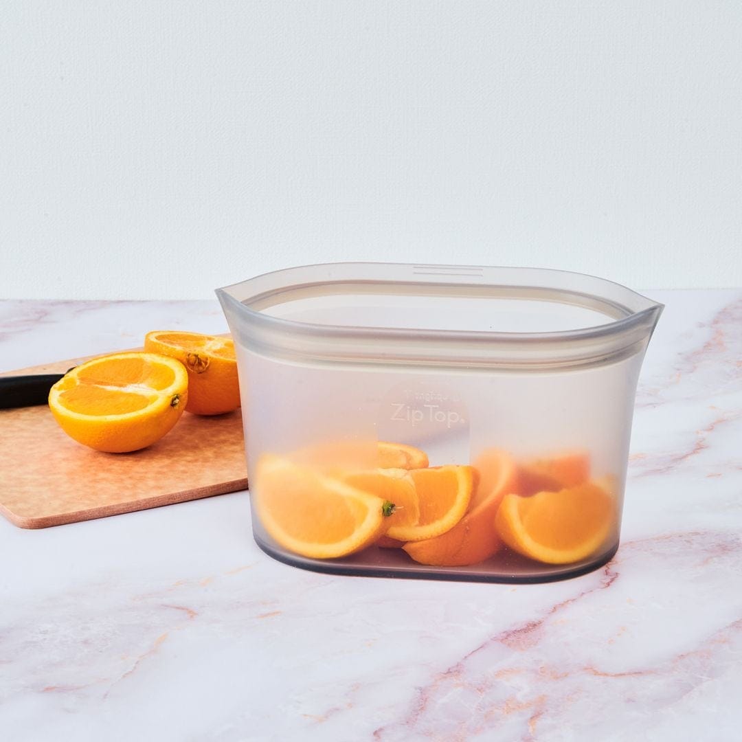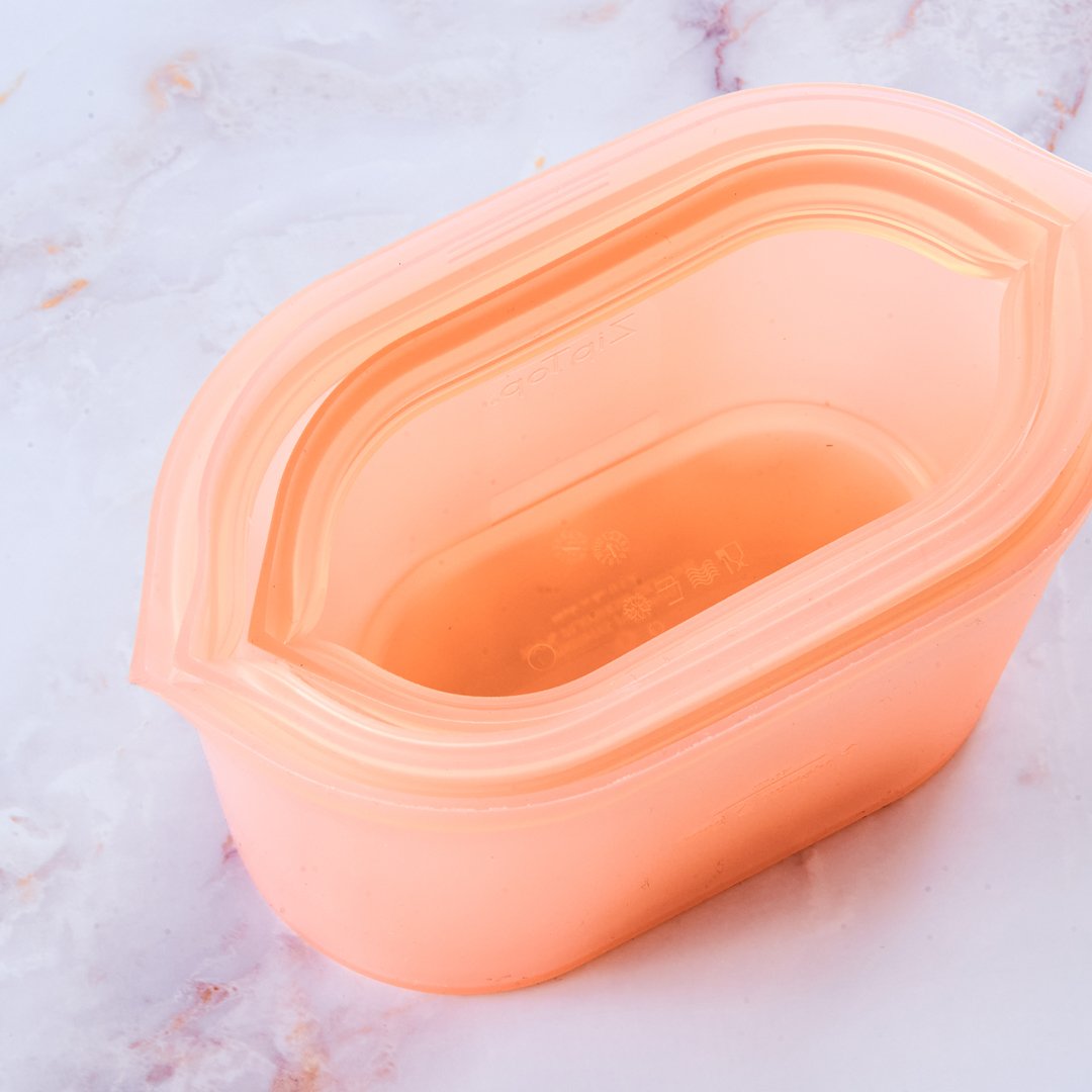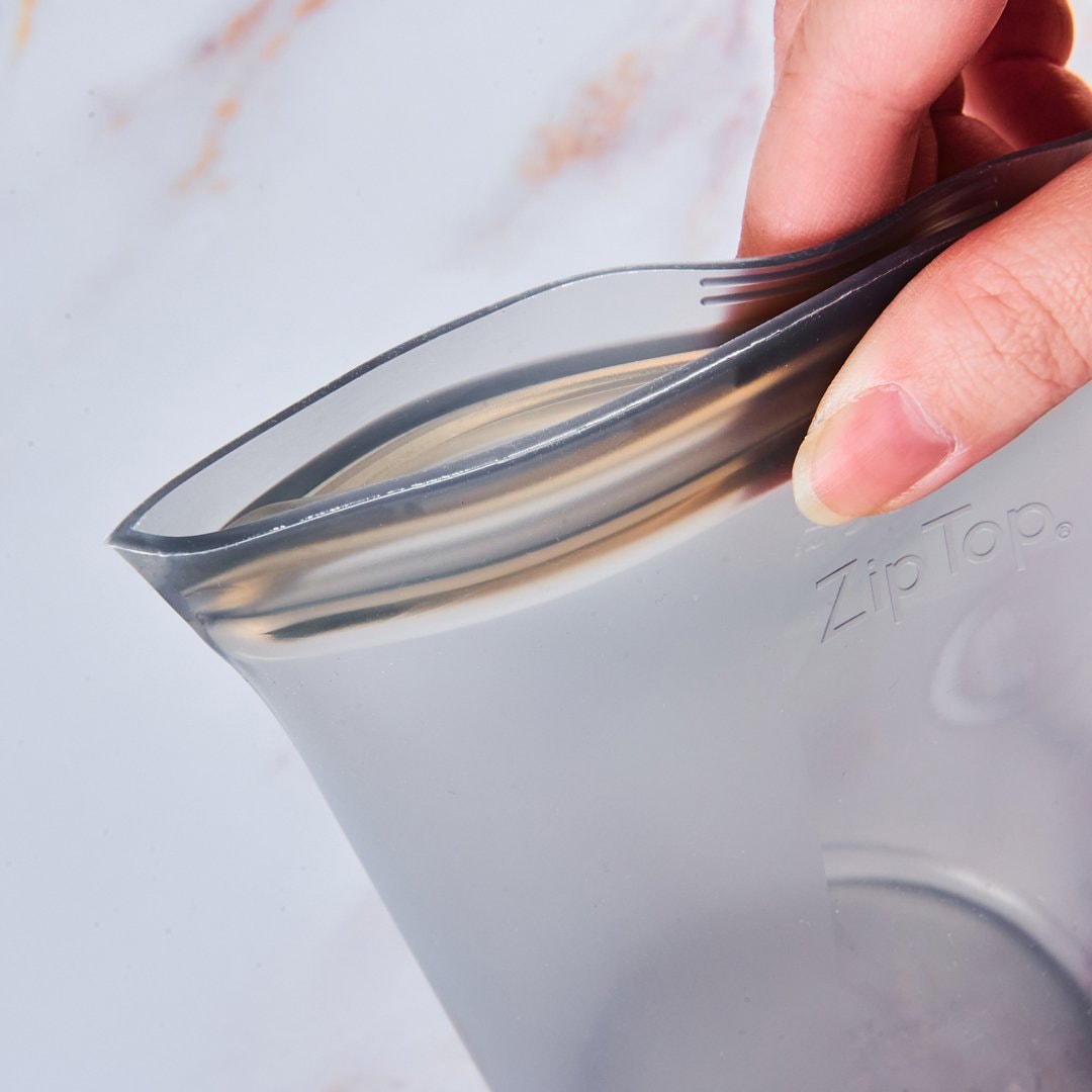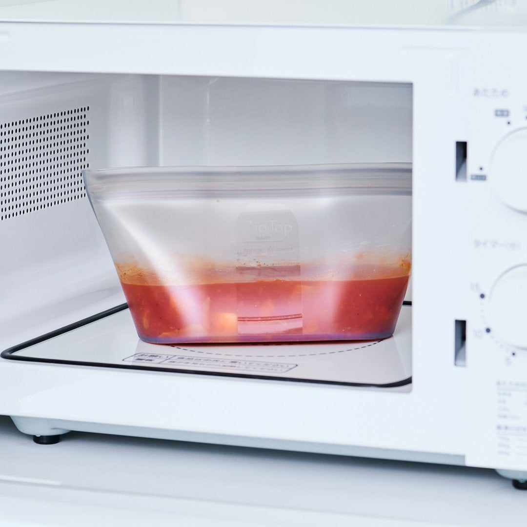 洗って繰り返し使える、ジップトップ 耐久性が高く繰り返し使えるシリコンバッグです。ディッシュシリーズは容器の口が広いので、食材を入れやすく混ぜやすいのが特徴。電子レンジ対応なので、作り置きのおかずやスープもジップトップに入れたまま温められます。好みに合わせえて選べる、5色のカラーバリエーション カラーは、女性的なラベンダー、爽やかなティール、スタイリッシュなグレー、明るくクリアな印象のフロスト、温かみがありかわいいピーチをご用意しました。好みのカラーをセレクトするのも、色違いで複数個揃えて、食材・料理ごとに使い分けるのもおすすめです。肉まんだってすっぽり。ディッシュ L まるごとの玉ねぎや肉まんがそのまますっぽり収まるようなサイズ感です。ランチボックス代わりに使ったり、食べかけのお菓子やナッツの保存にも活躍。食材の保存や調理以外の用途にも。イヤリングやネックレスなどのアクセサリー、旅行の際のバスグッズやスマートフォンの充電器を入れるのにも活躍します。サラダからスープまで幅広く。温めはジップトップに入れたまま レタスやスライス玉ねぎなどの野菜から作ったサラダもまとめて一括保存。煮物などの温菜なら電子レンジはもちろん、湯せんでの温めもOK。冷蔵庫に入れておいたスープも、ジップトップごと温めておいしく味わっていただけます。ゴミを減らしたい。環境にも健康にもやさしく 使い捨てることなく洗って何度でも使えるシリコンバッグです。ゴミを減らすため環境に配慮して作られました。このジップトップは100%プラチナシリコン製で、プラスチックと違い、燃やしても有害ガスやダイオキシンが発生しない素材です。一世帯で年間平均2000枚消費されているというプラスチックバッグが一つのジップトップに変われば、地球環境がぐっと良くなるのではないでしょうか。