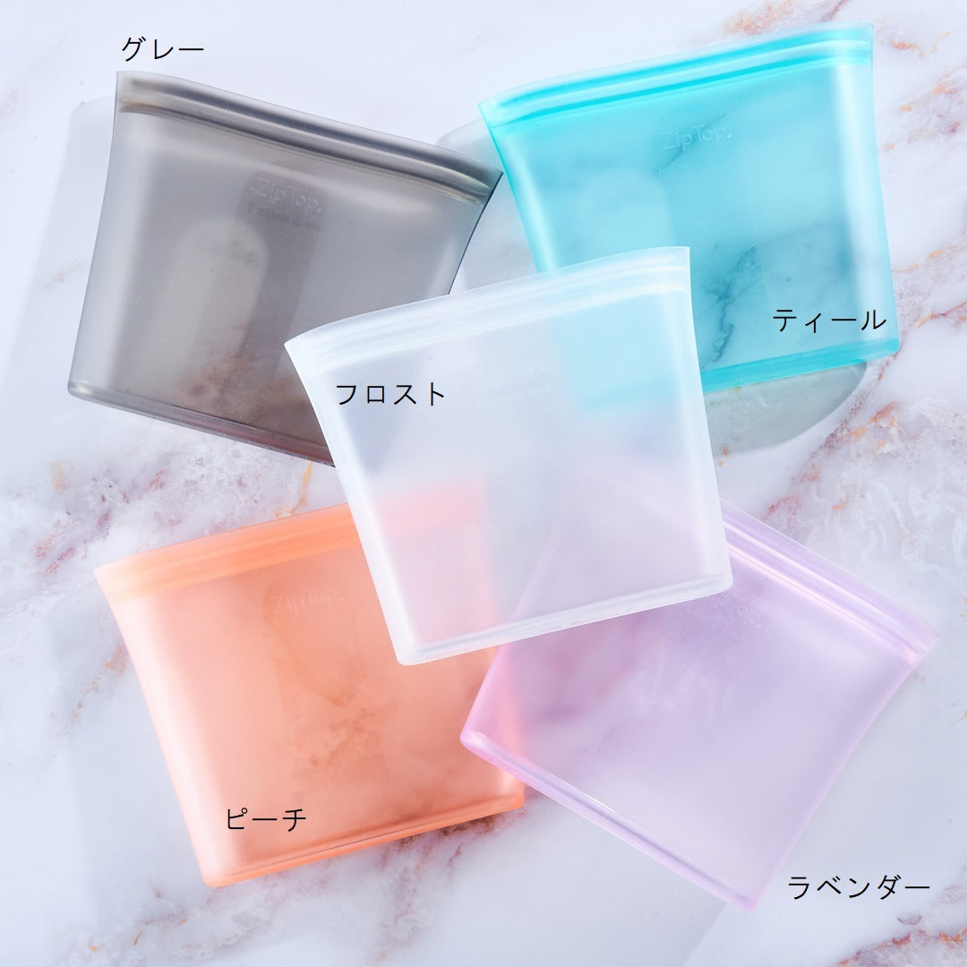 洗って繰り返し使える、ジップトップ 耐久性が高く繰り返し使えるシリコンバッグです。マチの狭いスリムなフォルムはサンドイッチの保存にぴったり。ホットサンドなら、冷えてしまったチキンやチーズも電子レンジで再度温めておいしくお召し上がりいただけます。好みに合わせえて選べる、5色のカラーバリエーション カラーは、女性的なラベンダー、爽やかなティール、スタイリッシュなグレー、明るくクリアな印象のフロスト、温かみがありかわいいピーチをご用意しました。好みのカラーをセレクトするのも、色違いで複数個揃えて、食材・料理ごとに使い分けるのもおすすめです。サンドイッチ用のランチボックスにぴったり。マチが狭いので食材が詰まった冷蔵庫の中でもスリムに保存が可能です。サンドイッチや、ハムやチーズなどの厚みの少ない食材を入れるのに最適。ランチボックス代わりに使ったり、食べかけのお菓子やナッツの保存にも活躍。食材の保存や調理以外の用途にも。イヤリングやネックレスなどのアクセサリー、旅行の際のバスグッズやスマートフォンの充電器を入れるのにも活躍します。蒸し野菜も電子レンジで簡単調理。湯せんも対応可能 煮物などの温菜なら電子レンジはもちろん、湯せんでの温めもOK。火が通りにくいじゃがいもなどの根菜も、少量の水と一緒に電子レンジにかければホクホクの蒸し野菜があっという間に完成。冷蔵庫に入れておいたスープも、ジップトップごと温めておいしく味わっていただけます。ゴミを減らしたい。環境にも健康にもやさしく 使い捨てることなく洗って何度でも使えるシリコンバッグです。ゴミを減らすため環境に配慮して作られました。このジップトップは100%プラチナシリコン製で、プラスチックと違い、燃やしても有害ガスやダイオキシンが発生しない素材です。一世帯で年間平均2000枚消費されているというプラスチックバッグが一つのジップトップに変われば、地球環境がぐっと良くなるのではないでしょうか。