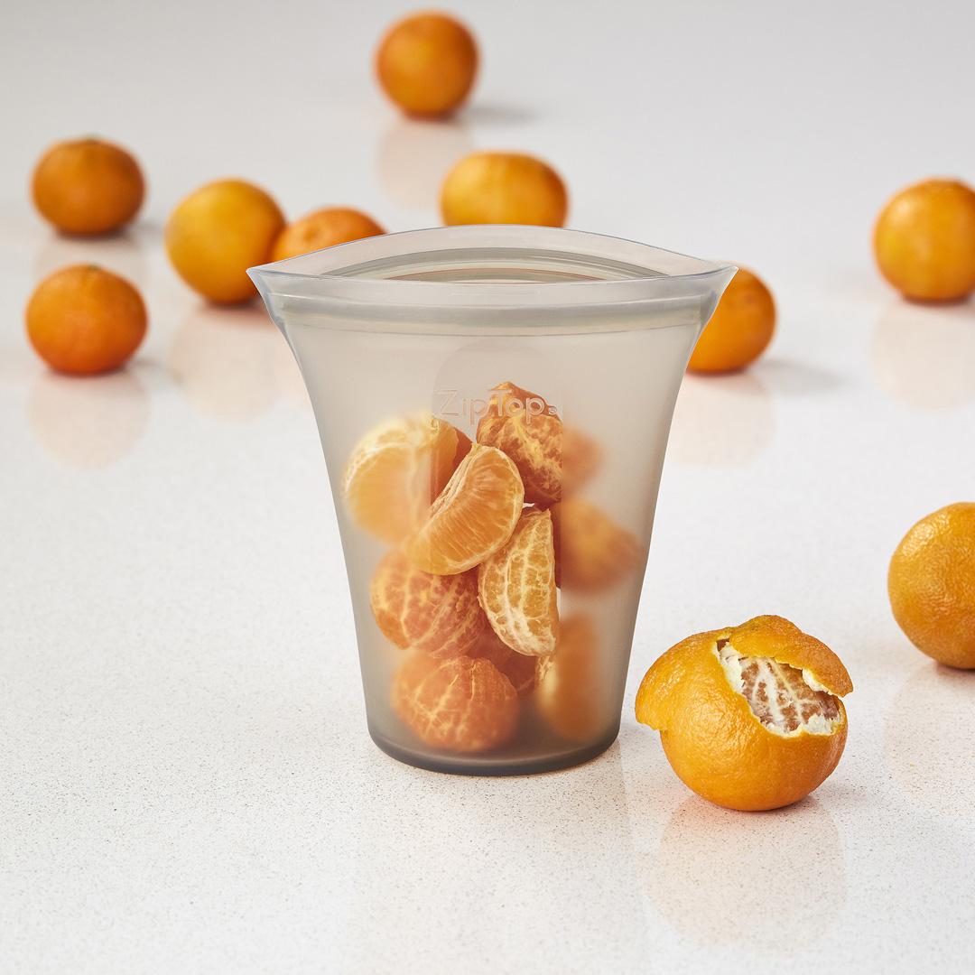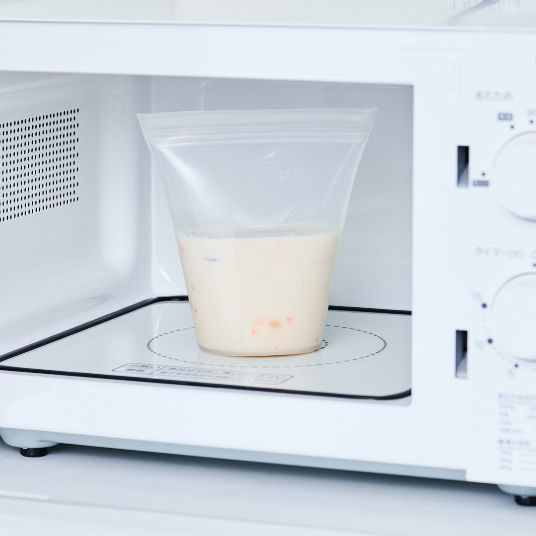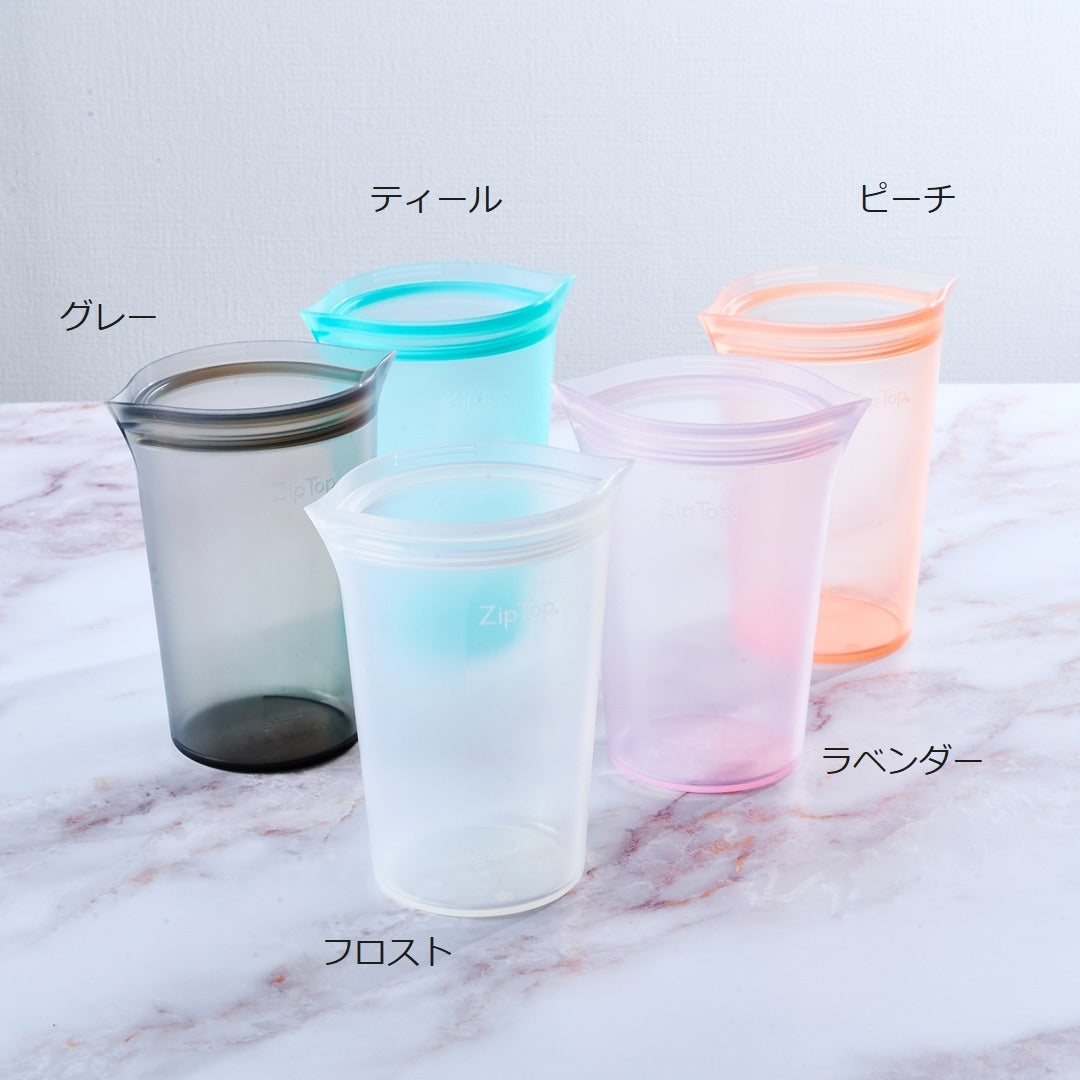 洗って繰り返し使える、ジップトップ 耐久性が高く繰り返し使えるシリコンバッグです。カップシリーズは深さがあるので、長さのある野菜もすっぽりと収まる。電子レンジ対応なので、作り置きのおかずやスープもジップトップに入れたまま温められます。好みに合わせえて選べる、5色のカラーバリエーション カラーは、女性的なラベンダー、爽やかなティール、スタイリッシュなグレー、明るくクリアな印象のフロスト、温かみがありかわいいピーチをご用意しました。好みのカラーをセレクトするのも、色違いで複数個揃えて、食材・料理ごとに使い分けるのもおすすめです。グラノーラなどもOK。ランチボックスとしても ヨーグルトやグラノーラも入れるのも便利なサイズ感です。ランチボックス代わりに使ったり、食べかけのお菓子やナッツの保存にも活躍。食材の保存や調理以外の用途にも。イヤリングやネックレスなどのアクセサリー、旅行の際のバスグッズや日用品を入れるのにも活躍します。スープもジップトップで保存、そのまま電子レンジでチン 蓋がしっかりと閉まるので、お味噌汁やミネストローネなどのスープ類もジップトップに入れて保存ができちゃいます。冷蔵庫に入れておいたスープも、電子レンジでジップトップごと温めておいしく味わっていただけます。ゴミを減らしたい。環境にも健康にもやさしく 使い捨てることなく洗って何度でも使えるシリコンバッグです。ゴミを減らすため環境に配慮して作られました。このジップトップは100%プラチナシリコン製で、プラスチックと違い、燃やしても有害ガスやダイオキシンが発生しない素材です。一世帯で年間平均2000枚消費されているというプラスチックバッグが一つのジップトップに変われば、地球環境がぐっと良くなるのではないでしょうか。