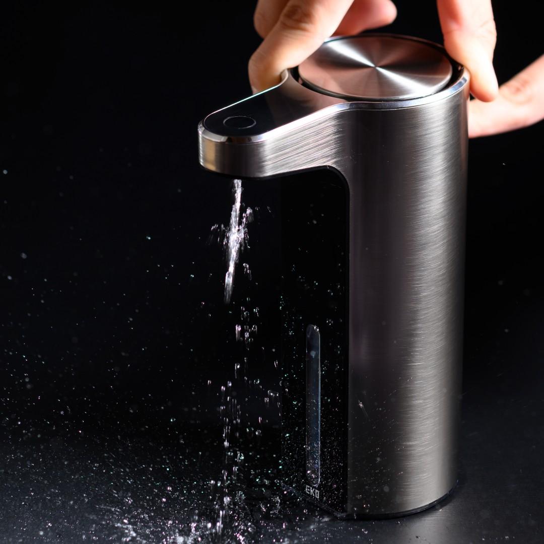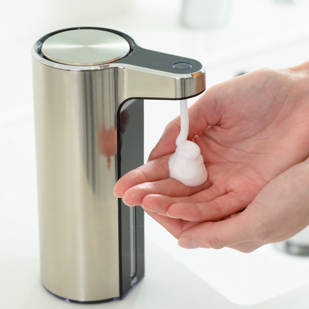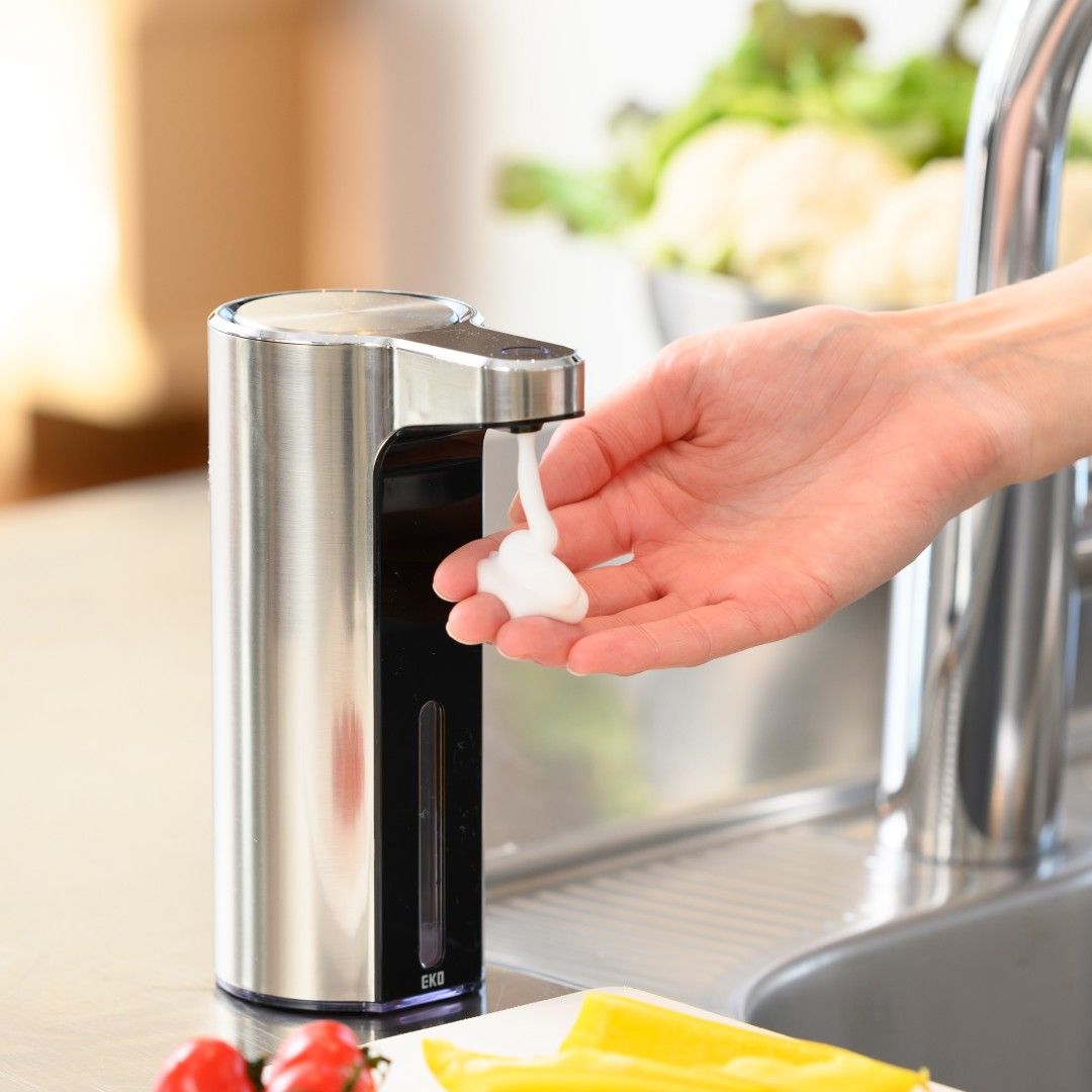 かざすだけで自動で出てくる、泡ソープディスペンサー 手をかざすと濃密な泡ソープが自動で出てくる、ソープディスペンサーです。デザイン性・機能性にすぐれたごみ箱を数多く展開してきたEKOならではの、ワンランク上のオートディスペンサー。ハンドソープにも台所用洗剤にも対応しています。どんなお部屋にも合う、2色のカラーバリエーション カラーは、スタイリッシュなシルバー、清潔感のあるホワイトをご用意しました。どちらもキッチン、洗面所、トイレなどに設置しやすいカラーラインナップです。お好みに合わせてお好きなカラーをお選びください。乾電池不要の充電式 約3時間の充電で約930回のご使用が可能です。1日10回使用したとしても約3ヶ月間充電なしで使い続けられます。1シーズンに1回のペースでたった3時間充電するだけで済んじゃいます。お出かけ中や、就寝中に充電しておけば充電待ちをする必要がありません。ボタン一つで使用量を設定 ディスペンサー上部の蓋を外しソープの原液を入れるだけのお手軽充填。ソープの量は0.3g・0.6g・0.9gと3段階で自由に設定が可能です。電源ボタンを押すごとに切り替えられるので、「今日は多めの泡で洗いたい」なんて希望も簡単に叶えられます。自動メンテナンス機能、高い防水性 タンクに水を入れてクリーニングモードにセットすれば、自動でお手入れしてくれるので面倒な手洗いが必要ありません。防水規格IPX4(あらゆる方向からの水の飛沫を受けても有害な影響を受けない)に対応しているため、安心して水回りでご使用いただけます。