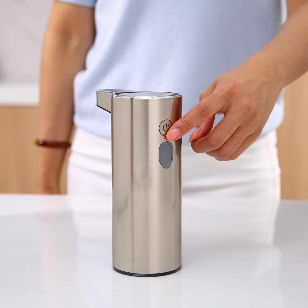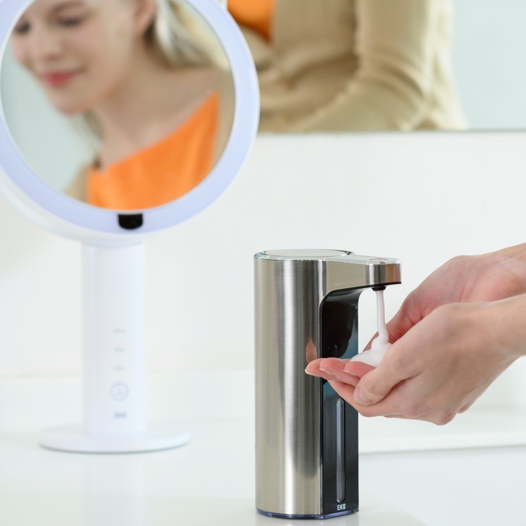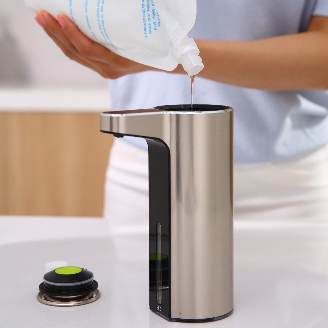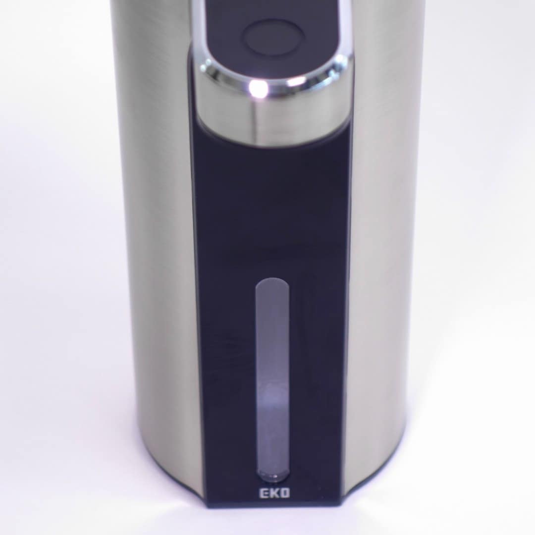 かざすだけで自動で出てくる、泡ソープディスペンサー 手をかざすと濃密な泡ソープが自動で出てくる、ソープディスペンサーです。デザイン性・機能性にすぐれたごみ箱を数多く展開してきたEKOならではの、ワンランク上のオートディスペンサー。ハンドソープにも台所用洗剤にも対応しています。どんなお部屋にも合う、2色のカラーバリエーション カラーは、スタイリッシュなシルバー、清潔感のあるホワイトをご用意しました。どちらもキッチン、洗面所、トイレなどに設置しやすいカラーラインナップです。お好みに合わせてお好きなカラーをお選びください。乾電池不要の充電式 約3時間の充電で約930回のご使用が可能です。1日10回使用したとしても約3ヶ月間充電なしで使い続けられます。1シーズンに1回のペースでたった3時間充電するだけで済んじゃいます。お出かけ中や、就寝中に充電しておけば充電待ちをする必要がありません。ボタン一つで使用量を設定 ディスペンサー上部の蓋を外しソープの原液を入れるだけのお手軽充填。ソープの量は0.3g・0.6g・0.9gと3段階で自由に設定が可能です。電源ボタンを押すごとに切り替えられるので、「今日は多めの泡で洗いたい」なんて希望も簡単に叶えられます。自動メンテナンス機能、高い防水性 タンクに水を入れてクリーニングモードにセットすれば、自動でお手入れしてくれるので面倒な手洗いが必要ありません。防水規格IPX4(あらゆる方向からの水の飛沫を受けても有害な影響を受けない)に対応しているため、安心して水回りでご使用いただけます。