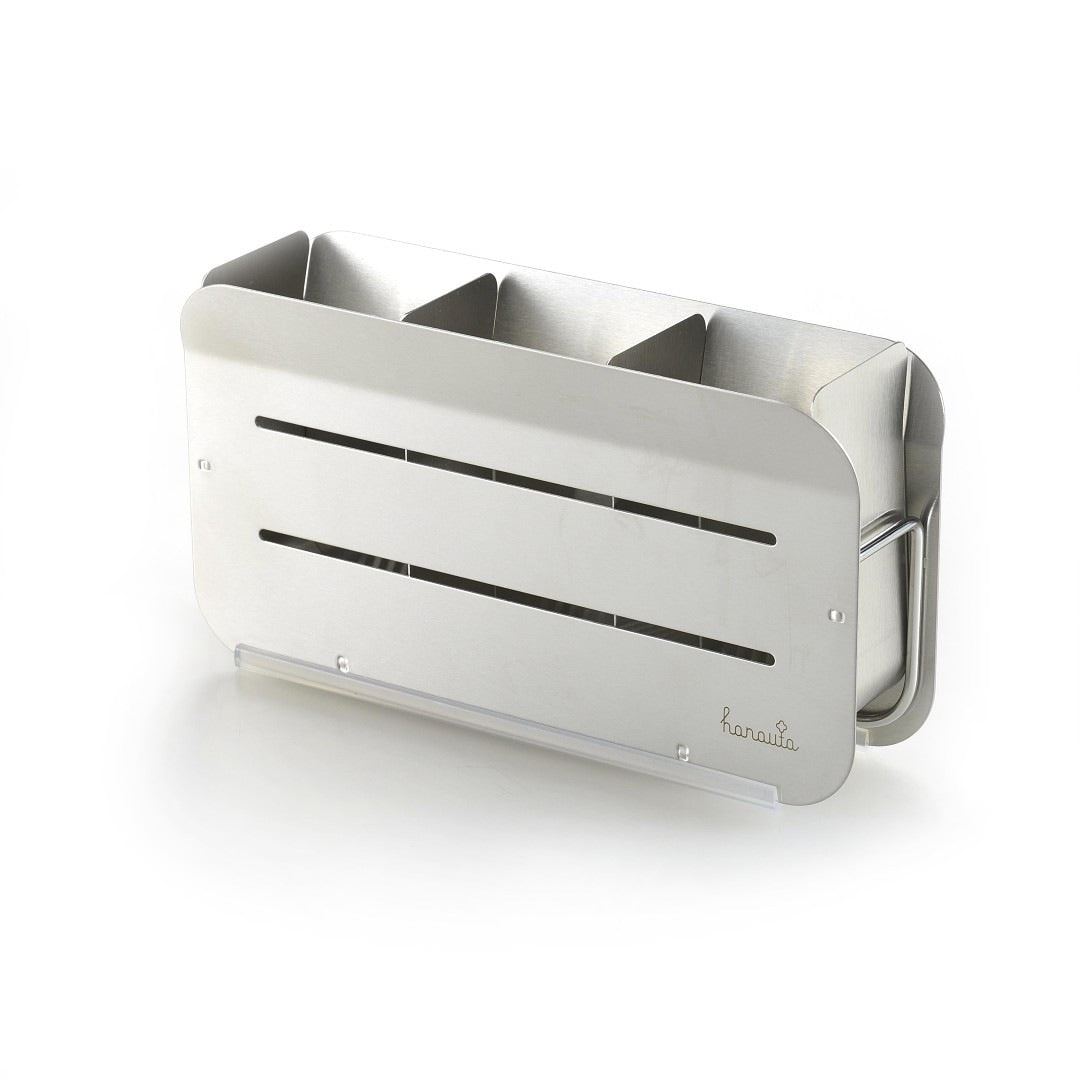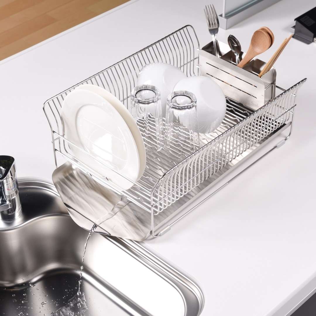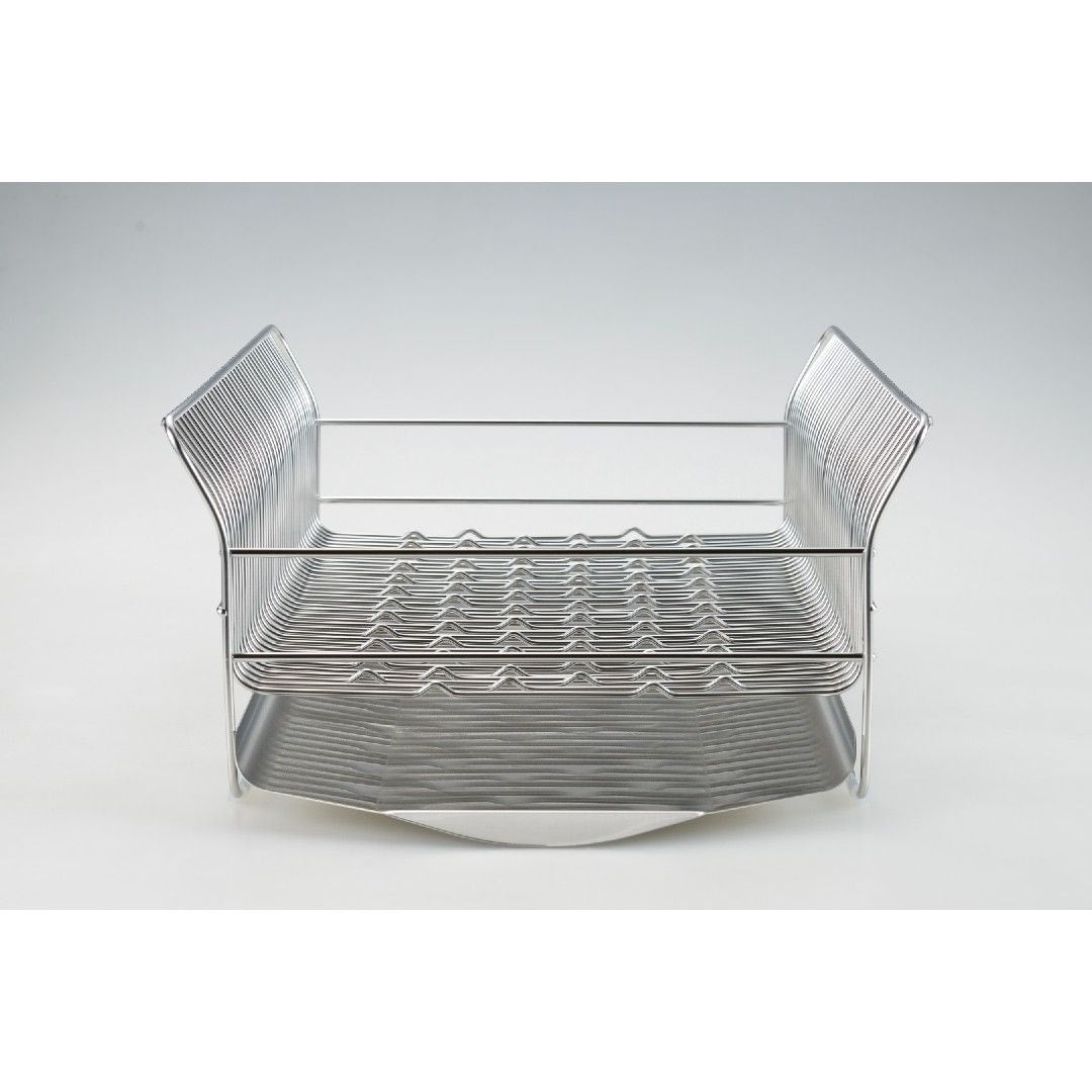 洗い終わった食器を水切りラックに置くとき、お皿を立てても滑ってしまったり、重なってしまい取り出す時にがちゃがちゃと音がなってしまったりと多少のストレスを感じることはあるもの。ビーワーススタイルの『hanauta』シリーズの水切りラックはそんなストレスを軽減できるようたくさんの工夫をされた水切りラックです。職人さんが一点一点丁寧につくられているので、細かいパーツや、磨き部分までこだわった水切りラックをご紹介します。カラーバリエーションはスタイリッシュなステンレスらしさを感じるシルバーと、上品な美しさを醸し出すローズゴールドの2色。キッチンの雰囲気に合わせて選べます。※こちらは『水切りラック横置き シルバー』のページとなり、色違いのローズゴールドは別ページより購入が可能です。お皿を置くときにすべらないポイントがビーワース独自の『たてよこウェーブ』。8cm間隔で並んでいる波型ワイヤーがどの向きに食器を置いても安定してくれます。さらに、鳥の羽のように湾曲した背もたれに立てかければしっかりホールドしてくれ、食器のサイズや置く場所を考えず適当に入れてもスッキリ納まるところがストレス軽減につながります。シンク横の形状やスペース、置く場所に合わせて水切りの位置を選びたいもの。Hanautaの水切りラックの形状は3タイプあり、ラックの横から水切りをする「横置き」、広い面から水切りをする「縦置き」、シンク横の狭いスペースでも置きやすい「縦置きロング」があります。水切りトレイも職人さんの丁寧な作業により、スルスルと水が流れやすいよう一つ一つ磨きあげられています。形状は設置場所にあわせて選んでみて下さい。水切りラックに合わせて、ステンレスのシルバー、ローズゴールドの素材に合わせた箸立てがセットに。ユーザーさんからの意見をもとに改良された箸立ては、工夫がたくさん。箸が水切り穴から飛び出してしまうことから隙間を減らし、仕分けを多くすることで、箸、スプーン、フォークなど細かく分けることができます。また、箸立て単体で使用できるように、箸立てにもシリコーンゴムの脚がついています。
