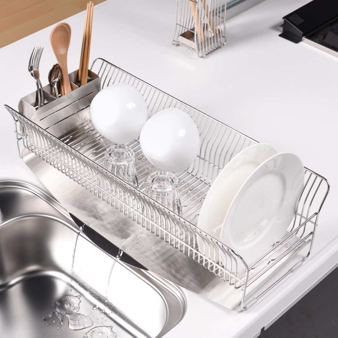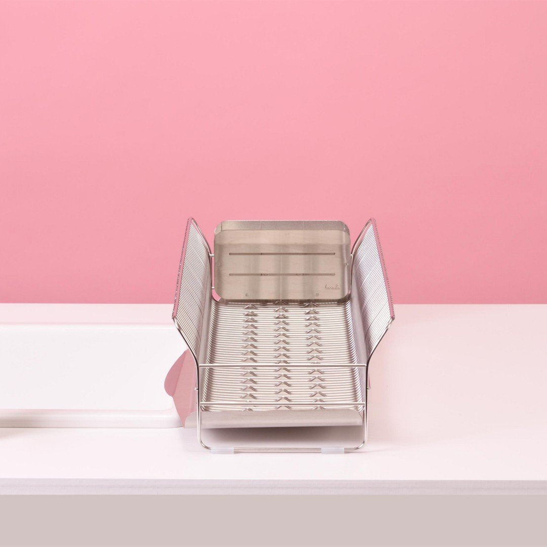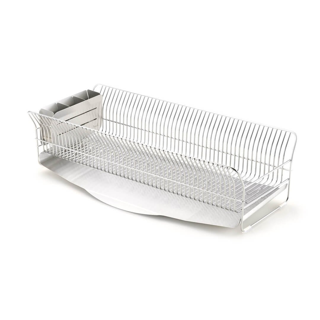 キッチンに水切りラックを置くにもスペースが限られてしまうもの。こちらの水切りラックはスリムでロングタイプなので、シンク横のスペ―スが狭い方におすすめです。他にはない特徴的なデザインと、職人さんが一点一点丁寧につくられているので、細かいパーツや、磨き部分までこだわったビーワーススタイルの水切りラックの特徴をご紹介します。カラーバリエーションはスタイリッシュなステンレスらしさを感じるシルバーと、上品な美しさを醸し出すローズゴールドの2色。キッチンの雰囲気に合わせて選べます。※こちらは『水切りラック縦置きロング シルバー』のページとなり、色違いのローズゴールドは別ページより購入が可能です。お皿を置くときにすべらないポイントがビーワース独自の『たてよこウェーブ』。8cm間隔で並んでいる波型ワイヤーがどの向きに食器を置いても安定してくれます。さらに、鳥の羽のように湾曲した背もたれに立てかければしっかりホールドしてくれ、食器のサイズや置く場所を考えず適当に入れてもスッキリ納まるところがストレス軽減につながります。シンク横の形状やスペース、置く場所に合わせて水切りの位置を選びたいもの。Hanautaの水切りラックの形状は3タイプあり、ラックの横から水切りをする「横置き」、広い面から水切りをする「縦置き」、シンク横の狭いスペースでも置きやすい「縦置きロング」があります。水切りトレイも職人さんの丁寧な作業により、スルスルと水が流れやすいよう一つ一つ磨きあげられています。形状は設置場所にあわせて選んでみて下さい。水切りラックに合わせて、ステンレスのシルバー、ローズゴールドの素材に合わせた箸立てがセットに。ユーザーさんからの意見をもとに改良された箸立ては、工夫がたくさん。箸が水切り穴から飛び出してしまうことから隙間を減らし、仕分けを多くすることで、箸、スプーン、フォークなど細かく分けることができます。また、箸立て単体で使用できるように、箸立てにもシリコーンゴムの脚がついています。