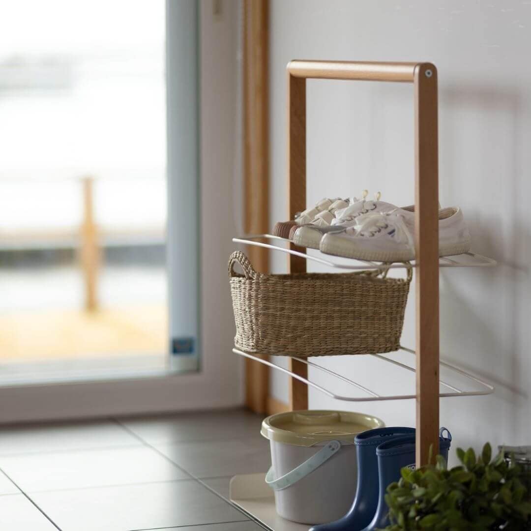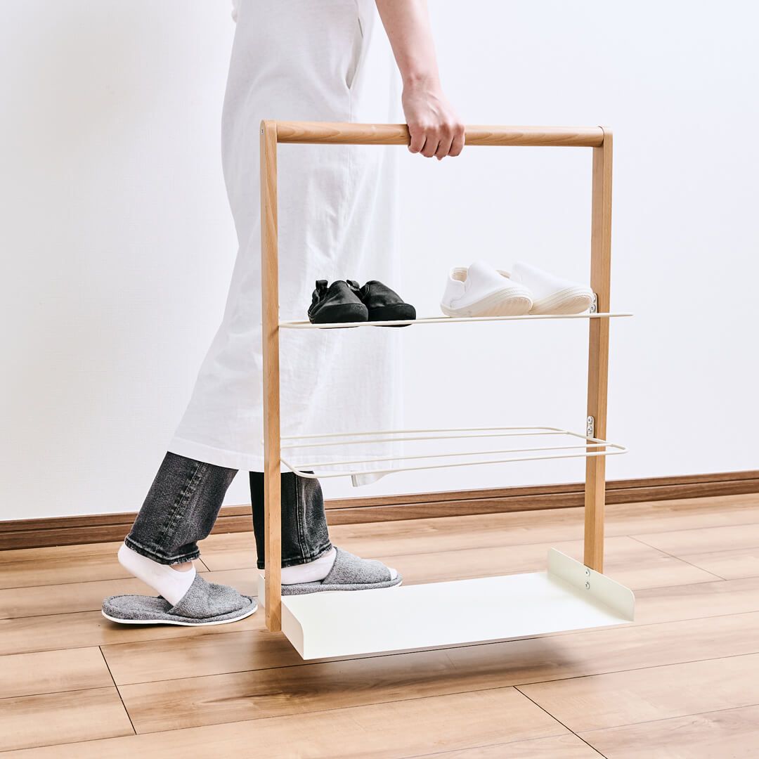 よく使うアイテムだけを収納するのに便利なラック 靴や小物など普段使いのアイテムを3段に分けて収納する、北欧風インテリアのエントランスラックです。コンパクトなサイズ感が、限られたスペースの玄関にぴったりです。オープンなシューズラックは空気が出入りし、湿気やこもった匂い、カビの発生を防ぎます。普段使いする靴をラックに入れるだけで見た目もすっきりし、収納しながら乾燥させることで靴のダメージを最小限に抑えてくれます。柔らかい色合いの2色展開 カラーバリエーションはクリームがかった色合いの「ホワイト」と、圧迫感を感じさせない「グレー」の2色展開。天然木とスチールの組み合わせはインテリアになじみやすいアイテムです。玄関の雰囲気に合わせてお選びください。玄関小物も収納しやすいマルチラック 3段に分けて収納できるから、家族ごとに収納したり、仕事とプライベート用のシーン別に収納するのも〇。靴のメンテナンス用品を置いたり、お子さまが外で遊ぶ砂場セットやボールといった収納に困っていたアイテムを収納する使い方もおすすめです。楽に持ち運べる取っ手 エントランスラックの上部には取っ手がついていいるので、ラック周りの掃除や靴を陰干ししたいときに楽に持ち運びできます。よく使う靴は湿気が溜まりやすいので、上の2段に収納するのがおすすめです。同シリーズを合わせて統一感ある玄関に LIV(リヴ)シリーズで別売りの「アンブレラハンガー」を合わせて設置することで、統一感のあるおしゃれなインテリアを楽しめます。LIVはMashブランドの中で、可愛らしい北欧テイストが人気のシリーズです。アンブレラハンガーも天然木とスチールが組み合わさり、優しい雰囲気を感じられるのが特長です。