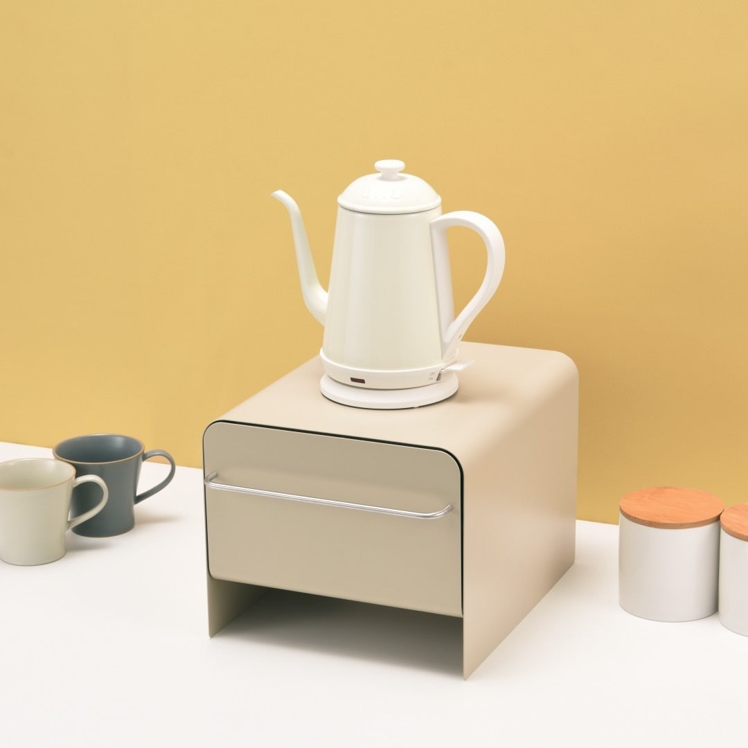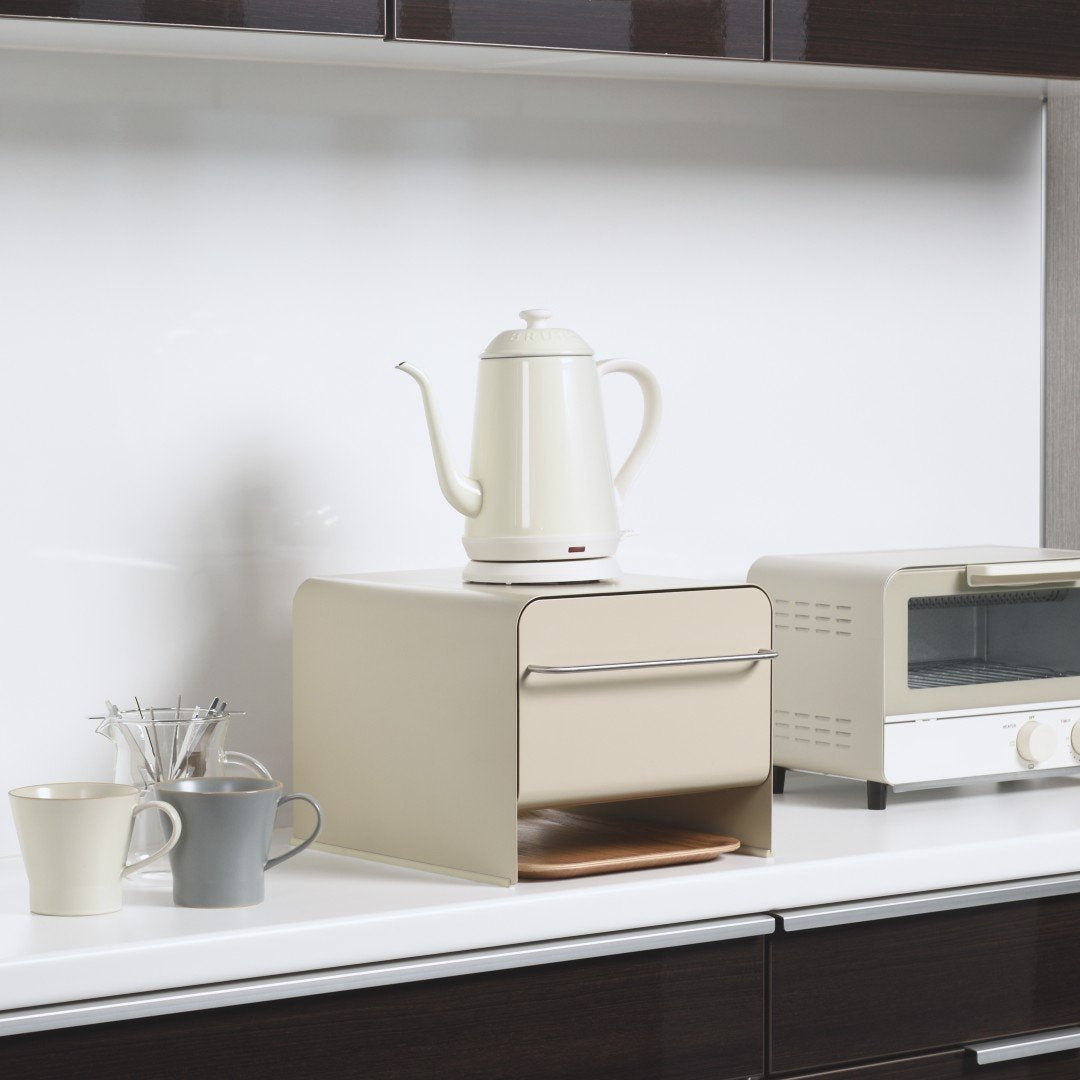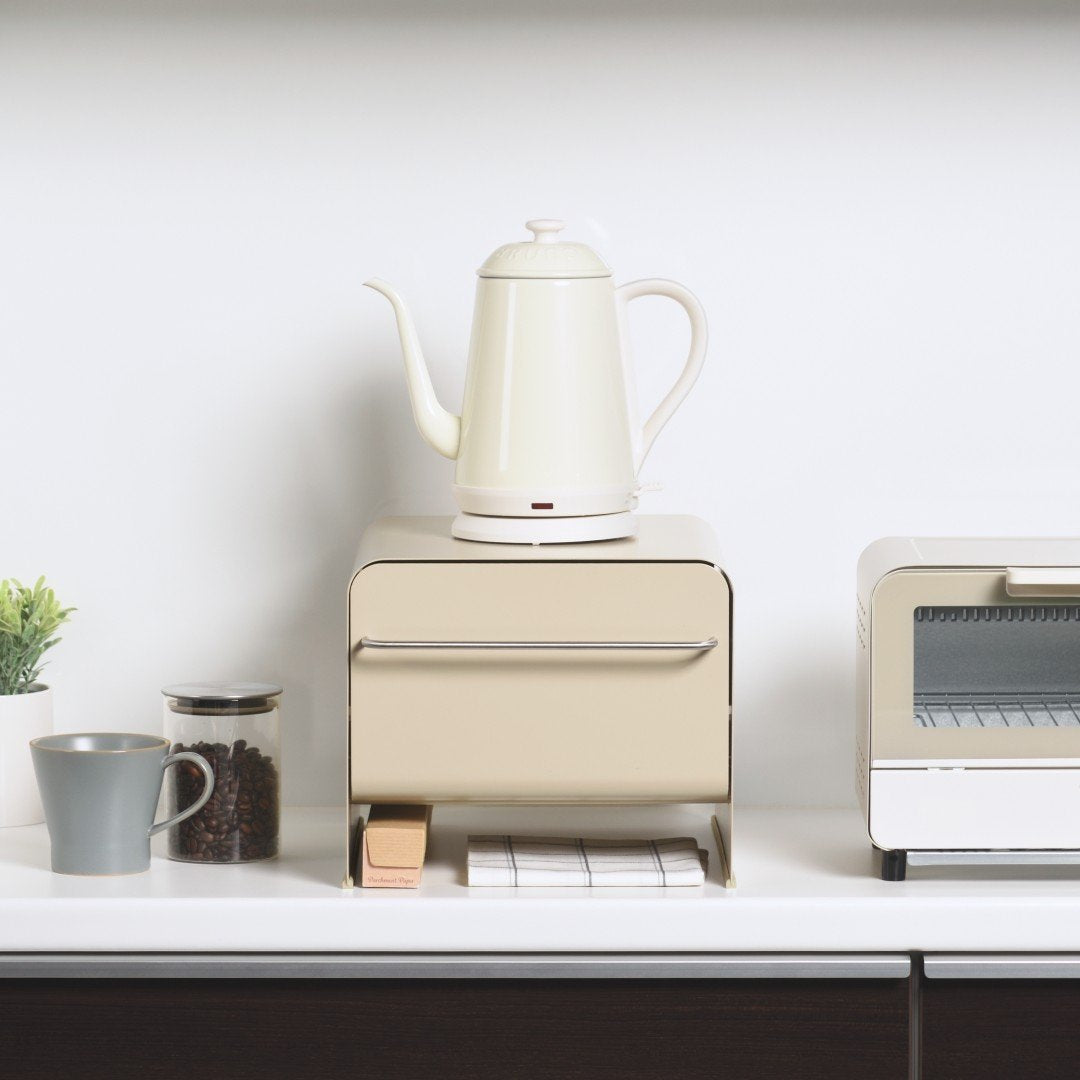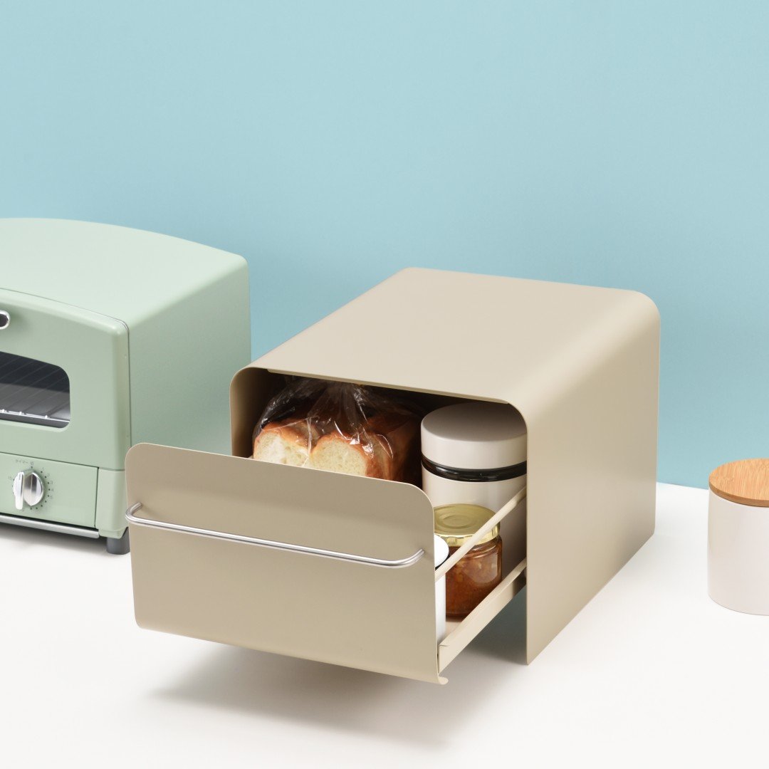 キッチンが片付くコンパクトなブレッドドロワー コンパクトなのに、パンやジャム、紅茶などもしっかりと収納できる『ブレッドドロワースリム』。幅が約28cmとスリムながら食パン1本もすっぽりと収まる収納力。使い勝手に優れたブレッドドロワーは、パン好きの方やキッチンをスッキリさせたい方におすすめです。やさしいカラーの『ファインベージュ』が登場。シンプルでどんなお家のキッチンにも馴染みやすいホワイトとカームグレーの他に『ファインベージュ』が加わりました。やさしいパステルカラーで白い壁紙やタイルのキッチンにはもちろん、カラーの家電や壁紙と合わせても馴染みます。重ね置き可能で省スペースをうまく利用 サイズは約幅27.7×奥行35×高さ23.2cmとコンパクトで、電子レンジや炊飯器と並べてキッチンボードに収まりやすい大きさ。パンはもちろん、常温保存の食材や小物もまとめてIN。上に電気ケトルやポップアップトースターなどのキッチン家電を置くことも可能なので、限りあるスペースを有効的に使用できます。食パンの1本買いもOK。すっぽり縦にしまえる パン屋さんで買ってきた食パン1本を丸ごと収納できるパン好き注目のサイズ感です。食パンの厚みの好みが家族で違っても、それぞれ好みの厚さでカットできるのが1本買いの醍醐味。食事の時間以外はブレッドドロワーにしまっておけばキッチンもスッキリとして見えます。キッチンに似合うシンプル設計。シンプルで洗練されたデザインはキッチン空間ともよくマッチ。出し入れの際の多少の衝撃からもガードできるので、中に入れるものが傷つかず、また引き出し内部を傷つけるのを防ぎます。取っ手はふきん掛けとして、ブレッドドロワー下部は小さめのトレーやラップなどを収納するのにもちょうど良いです。