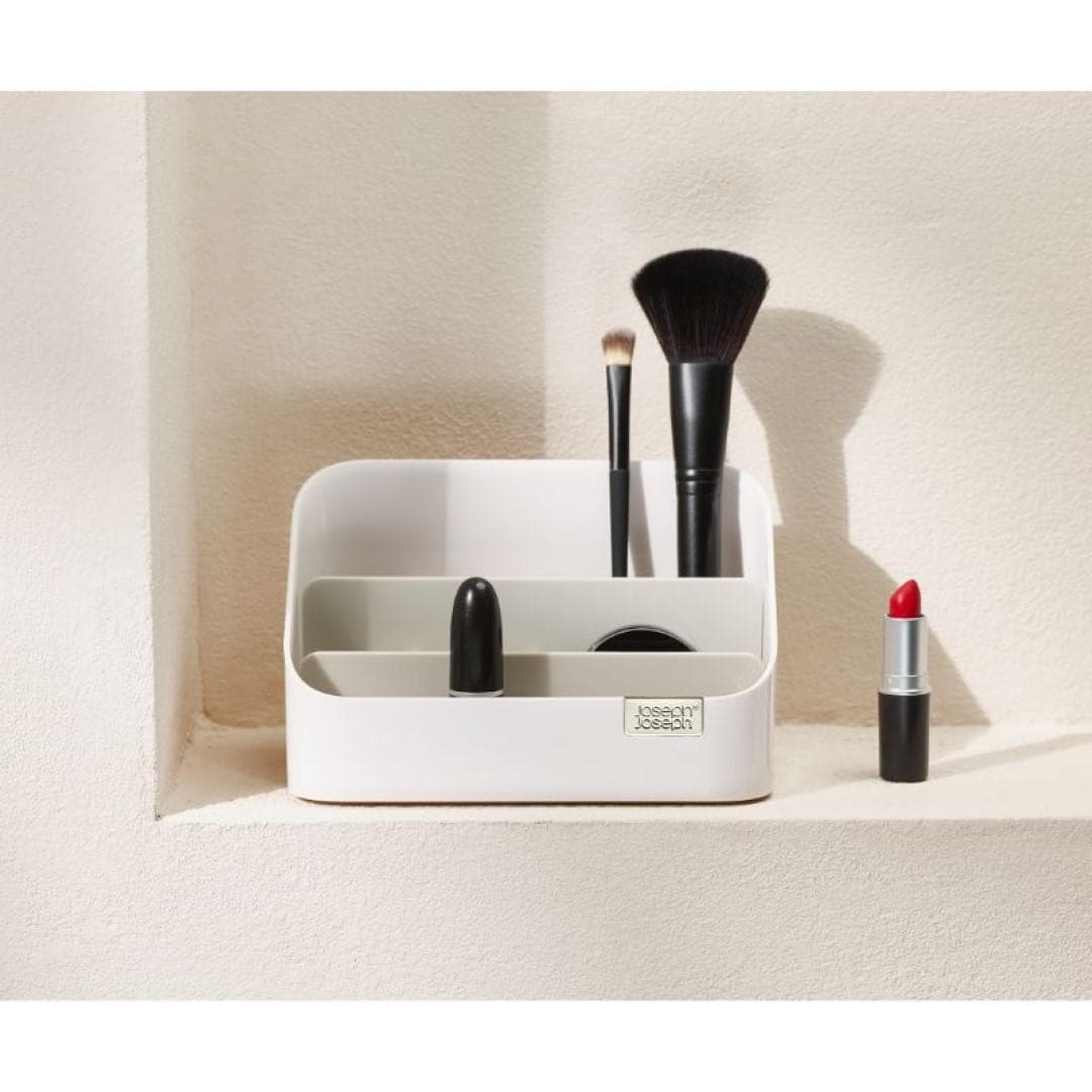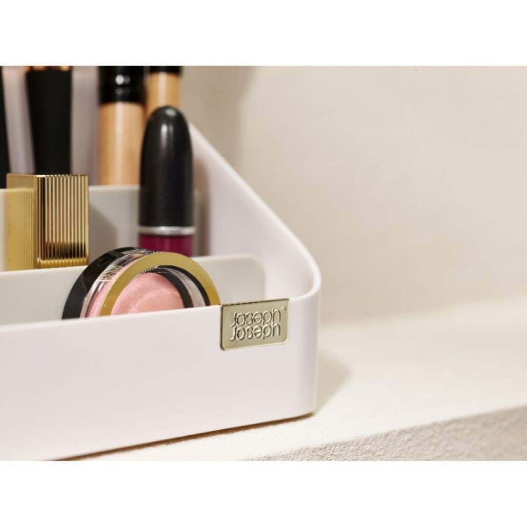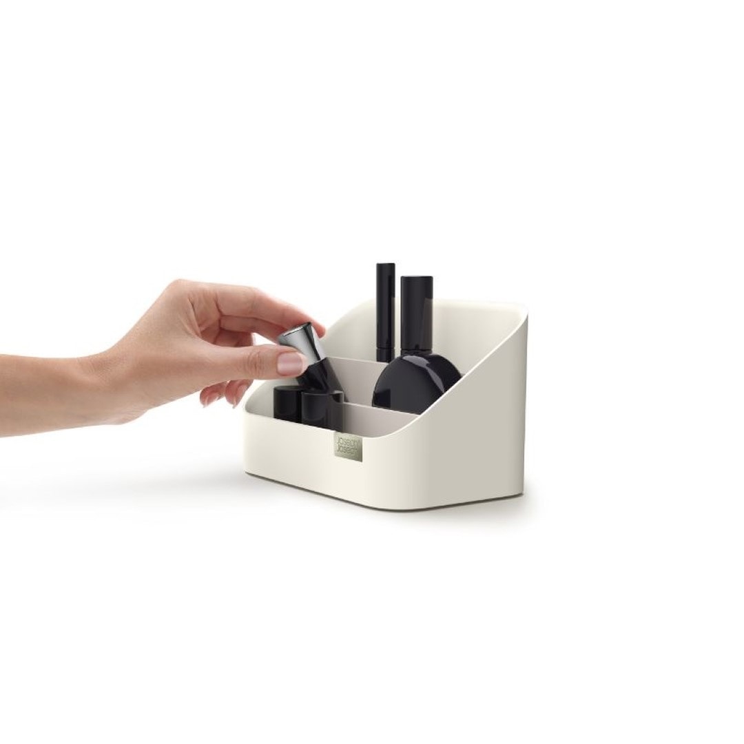 毎日使うコスメ用品をおしゃれに使いやすく収納 お手持ちの化粧品をすっきりとコンパクトに収納できるコスメオーガナイザーです。見つけやすく取り出しやすい階段形状なので、コスメのサイズに合わせて定位置を決められます。洗練された美しいデザインに加え、使い勝手を良くする仕切り付きがうれしいポイントです。サイズ違いのコスメもメイクツールもまとめて収納 高さのあるマスカラやアイライナー、メイクブラシは奥に。真ん中にリップカラー、手前にコンパクトタイプのアイシャドウやチークカラーなどを配置。奥から手前に向かって、背の高い物→低いものとすると、見栄えも使い勝手も良く収納できます。普段使い用、休日用、ネイル用品…目的別に使い分け コスメオーガナイザーを二つ並べて、片方にはお仕事にも使える普段使いのコスメ。もう片方には休日用やちょっと冒険して買ってみたカラーのコスメなど、分けて収納するのも◎。マニキュアやネイルオイルなど、爪のお手入れに特化したアイテムと使い分けるのもおすすめです。場所を選ばず置ける、メイクできる チェストからテーブルへ、洗面所からリビングへなどお部屋間の移動をさせやすいコンパクトさが魅力です。寒暖差の激しい季節にはいつもの洗面所ではなく、快適な空調を維持しているリビングでメイク…など気分次第でどこでも朝の支度をはじめられます。仕切りを取り外してお手入れ簡単 コスメの粉やブラシの抜け毛、ホコリなどケース内の汚れが気になったらいつでもサッとお手入れ。仕切りが取り外せるので、細かいところまで簡単にお掃除できちゃいます。やわらかい布などで汚れを拭き取ってください。