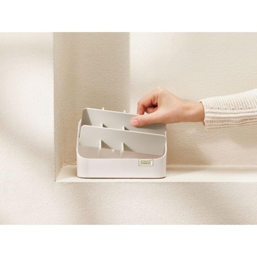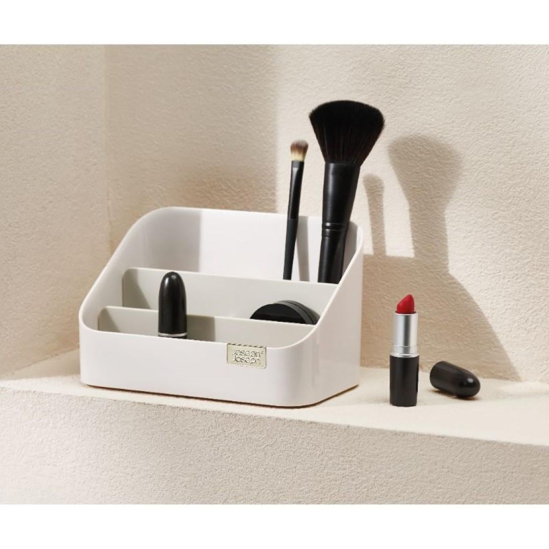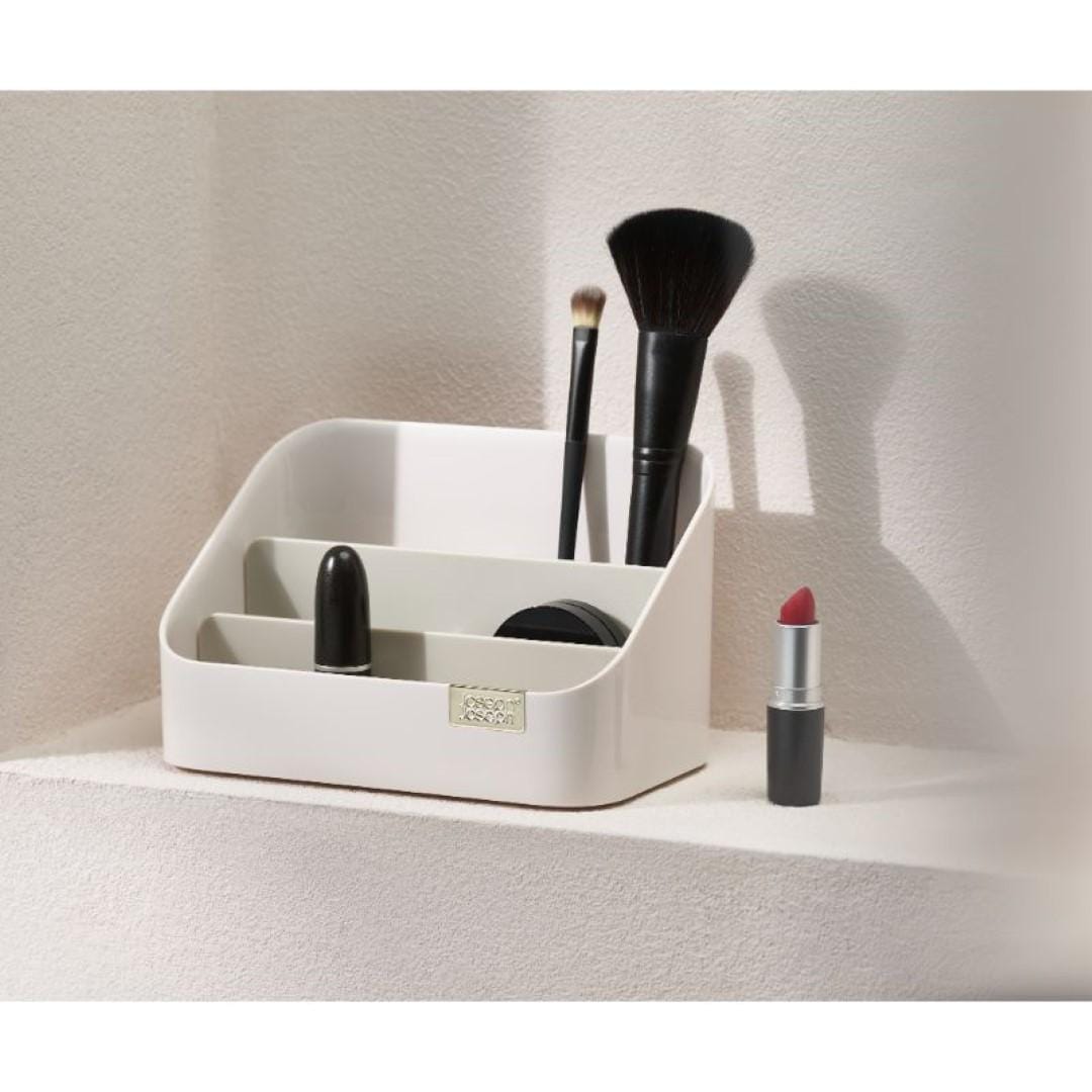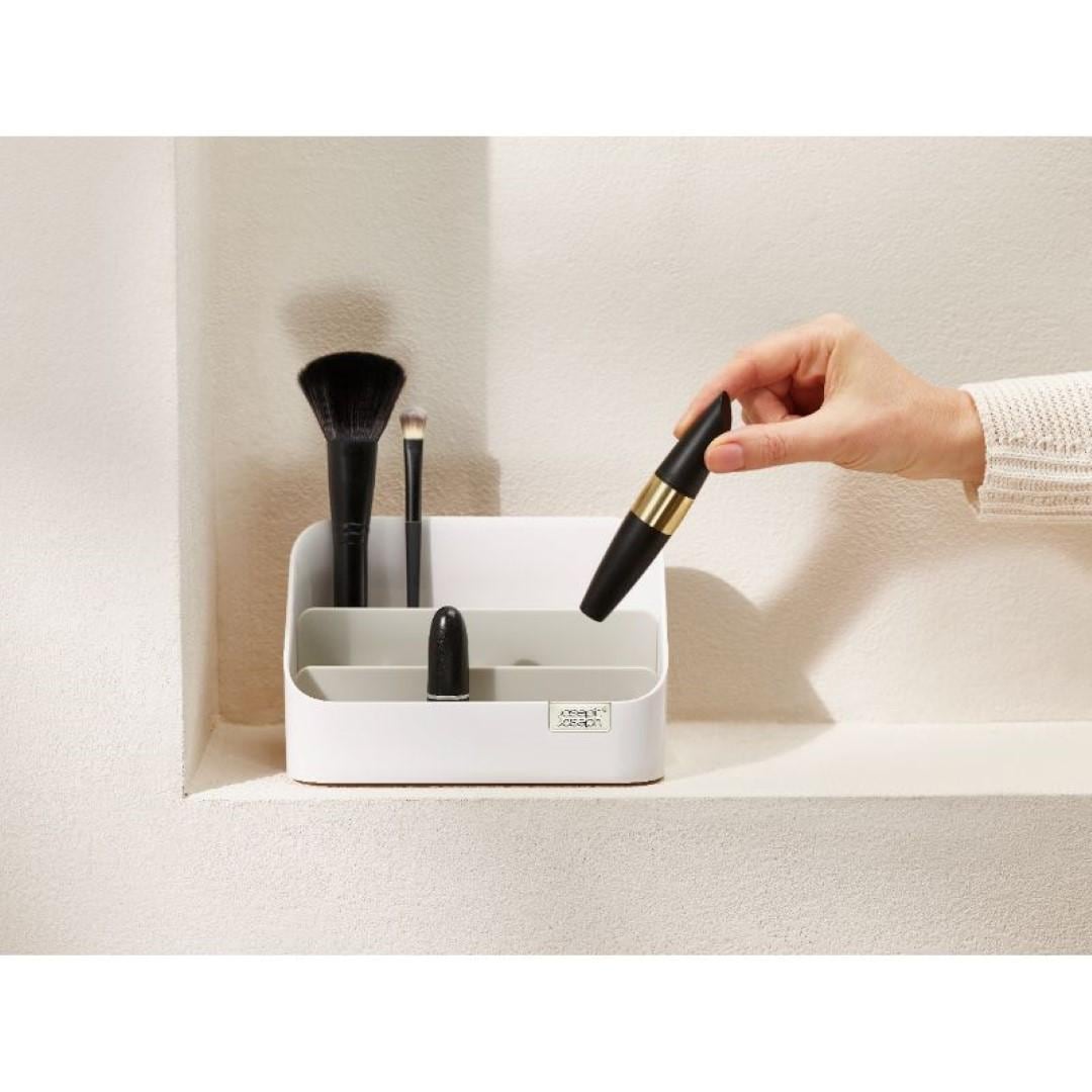 毎日使うコスメ用品をおしゃれに使いやすく収納 お手持ちの化粧品をすっきりとコンパクトに収納できるコスメオーガナイザーです。見つけやすく取り出しやすい階段形状なので、コスメのサイズに合わせて定位置を決められます。洗練された美しいデザインに加え、使い勝手を良くする仕切り付きがうれしいポイントです。サイズ違いのコスメもメイクツールもまとめて収納 高さのあるマスカラやアイライナー、メイクブラシは奥に。真ん中にリップカラー、手前にコンパクトタイプのアイシャドウやチークカラーなどを配置。奥から手前に向かって、背の高い物→低いものとすると、見栄えも使い勝手も良く収納できます。普段使い用、休日用、ネイル用品…目的別に使い分け コスメオーガナイザーを二つ並べて、片方にはお仕事にも使える普段使いのコスメ。もう片方には休日用やちょっと冒険して買ってみたカラーのコスメなど、分けて収納するのも◎。マニキュアやネイルオイルなど、爪のお手入れに特化したアイテムと使い分けるのもおすすめです。場所を選ばず置ける、メイクできる チェストからテーブルへ、洗面所からリビングへなどお部屋間の移動をさせやすいコンパクトさが魅力です。寒暖差の激しい季節にはいつもの洗面所ではなく、快適な空調を維持しているリビングでメイク…など気分次第でどこでも朝の支度をはじめられます。仕切りを取り外してお手入れ簡単 コスメの粉やブラシの抜け毛、ホコリなどケース内の汚れが気になったらいつでもサッとお手入れ。仕切りが取り外せるので、細かいところまで簡単にお掃除できちゃいます。やわらかい布などで汚れを拭き取ってください。
