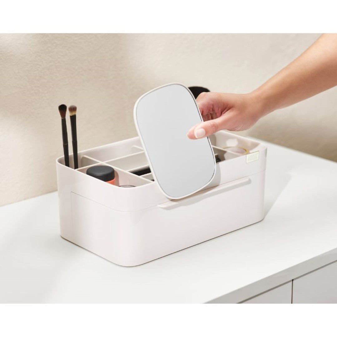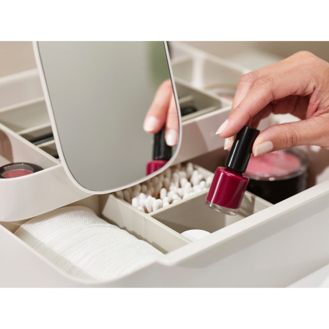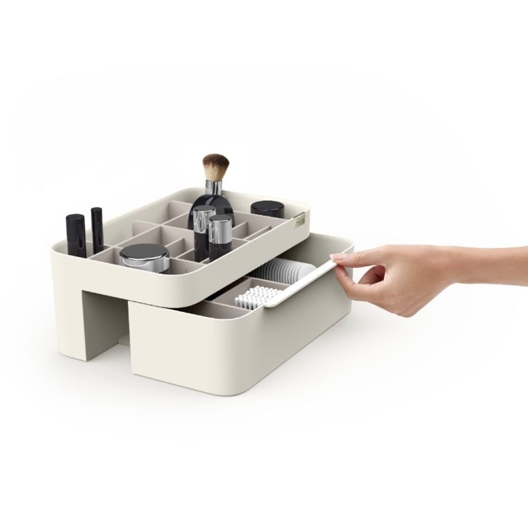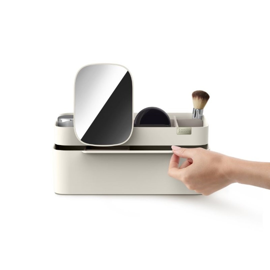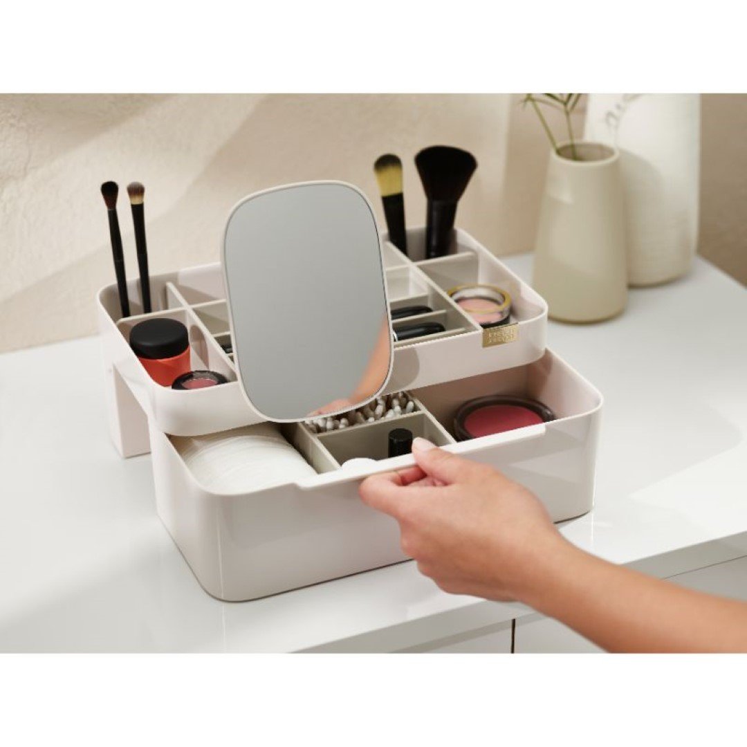 毎日使うコスメ用品をおしゃれに使いやすく収納 お手持ちの化粧品をすっきりとコンパクトに収納できるコスメオーガナイザーです。ミラー付きで洗面台まで行かなくてもその場でメイクが完了しちゃう。洗練された美しいデザインに加え、使い勝手を良くする仕切り付きがうれしいポイントです。2種類のミラーでメイクがしやすく 取り外し可能な鏡は、標準ミラーとポイントメイクにぴったりな3倍拡大鏡の両面仕様。拡大鏡はマスカラやアイライナーを引くときなどに大活躍します。ケースのふちに取り付ければハンズフリーで使え、使わないときには後ろのスロットに収納してスマートに。浅い&深いポケット+ホコリを避けて収納できる引き出し 上部の浅いポケットにはシングルアイシャドウやクリーム、奥には長さのあるアイライナーやメイクブラシを収納できます。たっぷり容量の仕切り付きの引き出しには、コットン、綿棒、スポンジ、パフなどを入れておくのに最適です。ツマミ付きで引き出しやすくぴったりと閉まるので、蓋なしで置いておくのに抵抗のあるものも心配せずに収納できそう。場所を選ばず置ける、メイクできる チェストからテーブルへ、洗面所からリビングへなどお部屋間の移動をさせやすいコンパクトさが魅力です。寒暖差の激しい季節にはいつもの洗面所ではなく、快適な空調を維持しているリビングでメイク…など気分次第でどこでも朝の支度をはじめられます。仕切りを取り外してお手入れ簡単 コスメの粉やブラシの抜け毛、ホコリなどケース内の汚れが気になったらいつでもサッとお手入れ。仕切りが取り外せるので、細かいところまで簡単にお掃除できちゃいます。やわらかい布などで汚れを拭き取ってください。