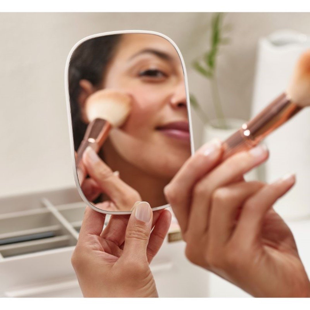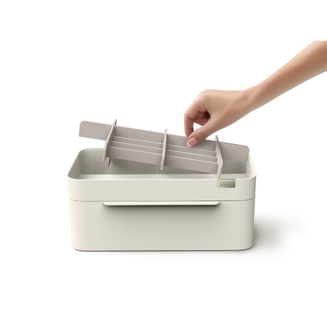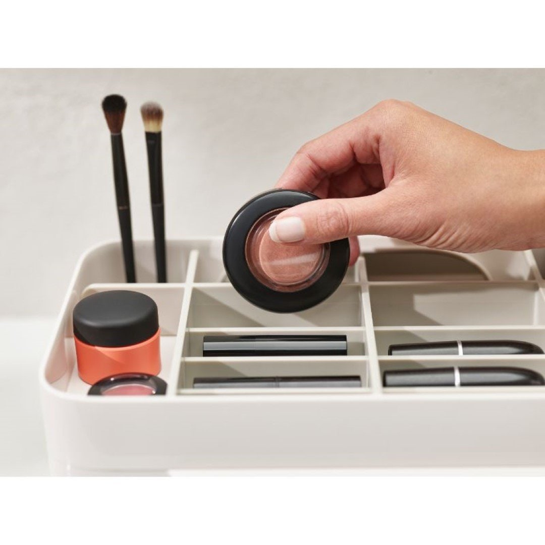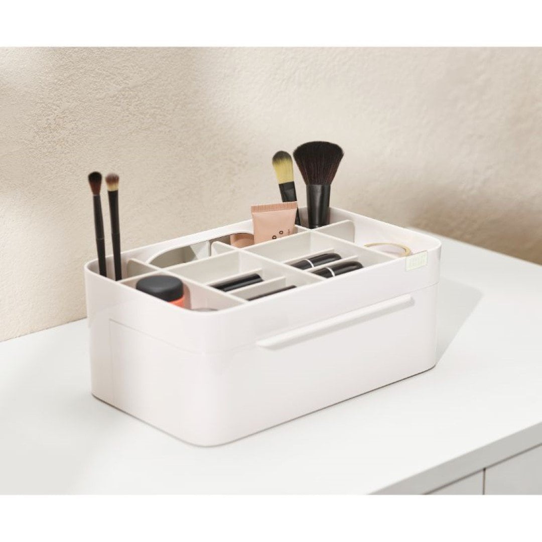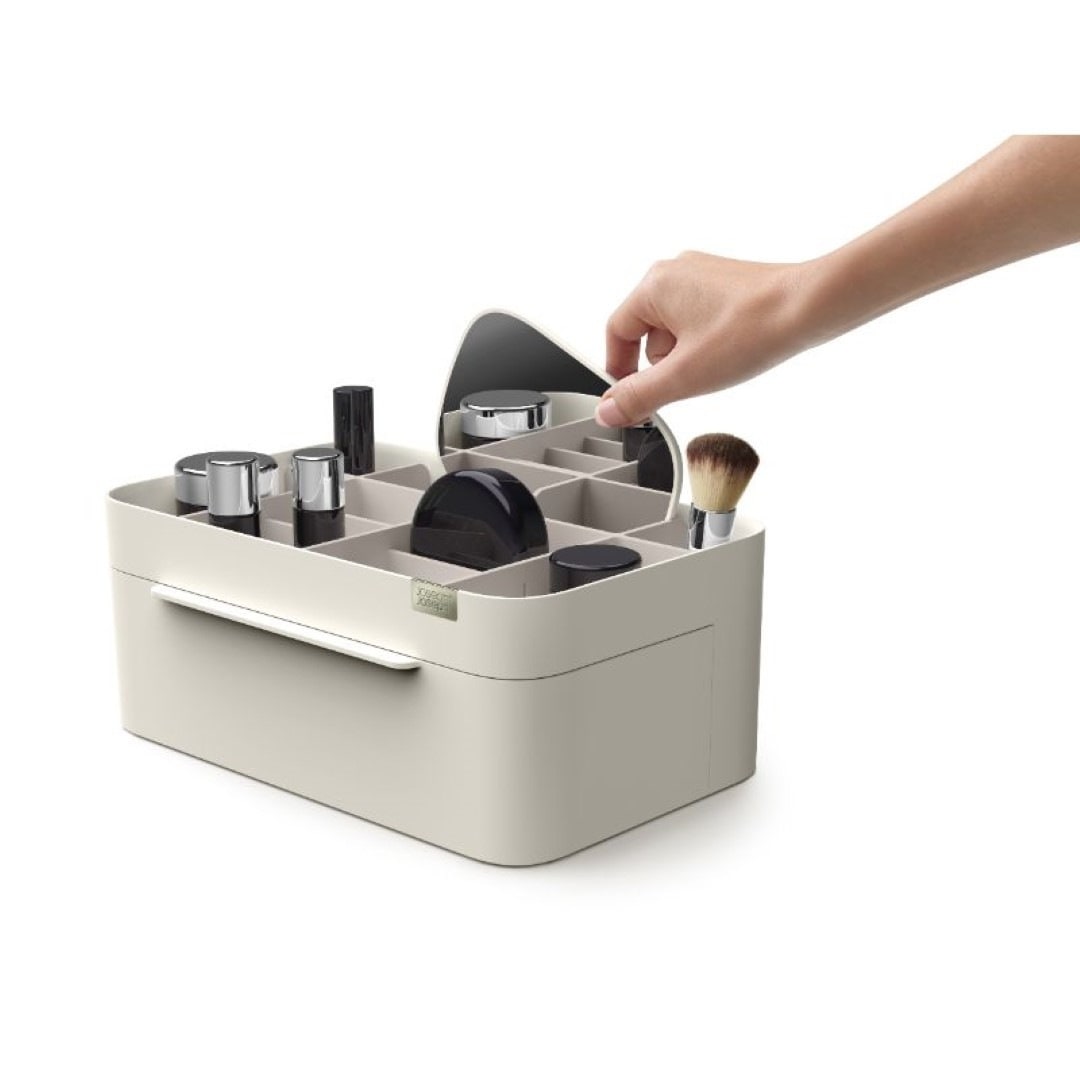 毎日使うコスメ用品をおしゃれに使いやすく収納 お手持ちの化粧品をすっきりとコンパクトに収納できるコスメオーガナイザーです。ミラー付きで洗面台まで行かなくてもその場でメイクが完了しちゃう。洗練された美しいデザインに加え、使い勝手を良くする仕切り付きがうれしいポイントです。2種類のミラーでメイクがしやすく 取り外し可能な鏡は、標準ミラーとポイントメイクにぴったりな3倍拡大鏡の両面仕様。拡大鏡はマスカラやアイライナーを引くときなどに大活躍します。ケースのふちに取り付ければハンズフリーで使え、使わないときには後ろのスロットに収納してスマートに。浅い&深いポケット+ホコリを避けて収納できる引き出し 上部の浅いポケットにはシングルアイシャドウやクリーム、奥には長さのあるアイライナーやメイクブラシを収納できます。たっぷり容量の仕切り付きの引き出しには、コットン、綿棒、スポンジ、パフなどを入れておくのに最適です。ツマミ付きで引き出しやすくぴったりと閉まるので、蓋なしで置いておくのに抵抗のあるものも心配せずに収納できそう。場所を選ばず置ける、メイクできる チェストからテーブルへ、洗面所からリビングへなどお部屋間の移動をさせやすいコンパクトさが魅力です。寒暖差の激しい季節にはいつもの洗面所ではなく、快適な空調を維持しているリビングでメイク…など気分次第でどこでも朝の支度をはじめられます。仕切りを取り外してお手入れ簡単 コスメの粉やブラシの抜け毛、ホコリなどケース内の汚れが気になったらいつでもサッとお手入れ。仕切りが取り外せるので、細かいところまで簡単にお掃除できちゃいます。やわらかい布などで汚れを拭き取ってください。