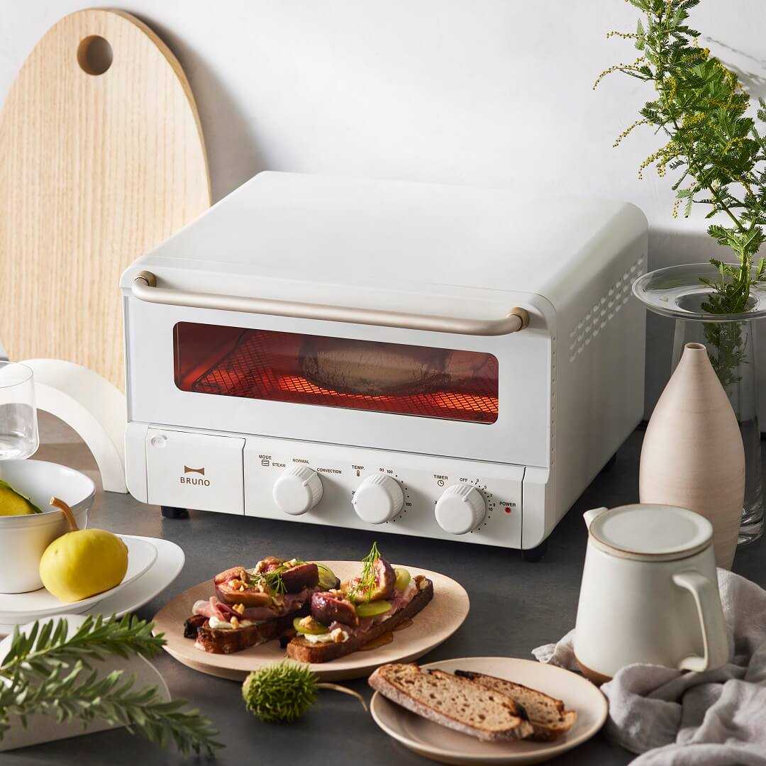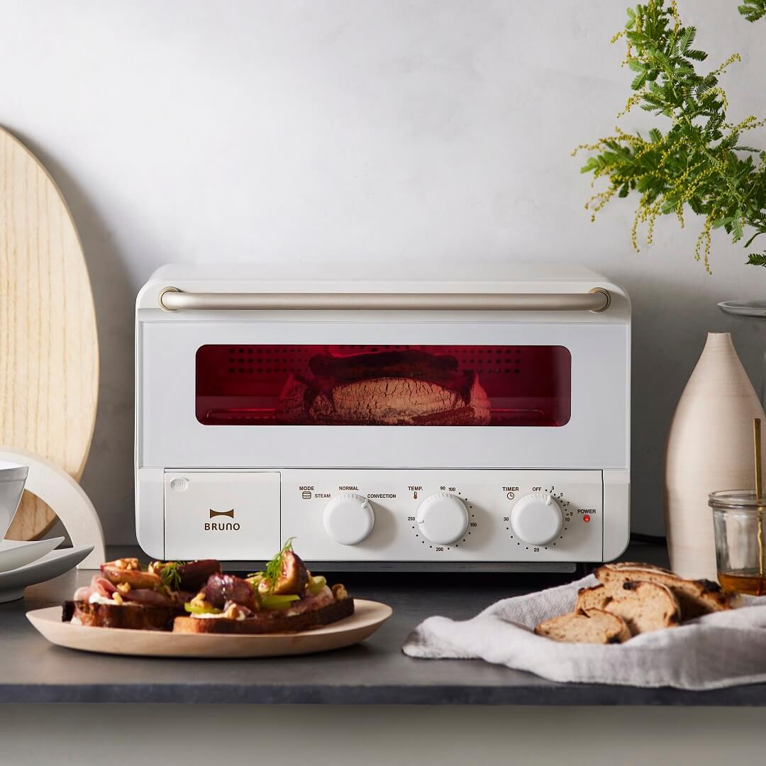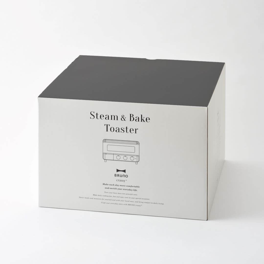 朝食から夕食まで大活躍。毎日でも使いたくなるトースター 「朝ご飯に、カリッとモチモチのトーストが食べたい。」 そんな望みを簡単に叶えてくれるのが、『BRUNO crassy+』から登場したこちらのトースターです。スリムなサイズ感ながら食パン4枚を1度に焼けるので、忙しい朝でも家族みんなで贅沢な味わいのトーストを楽しむことができます。スイーツやグラタン、肉・魚料理などの調理もできる他、お総菜も温め直せば出来立ての味に仕上がるので、夕食時にも重宝する1台です。毎日でも使いたくなるおしゃれで便利なトースターで、食卓を豊かにしてみませんか? 新色のホワイトカラーが登場 定番色のブラック、グレージュに加えて、キッチンをワントーン明るくしてくれるホワイトが登場しました。洗練された佇まいでさまざまなスタイルのキッチン、ダイニングに溶け込みます。3つのモード搭載で幅広い料理に対応可能 3つのモードを使い分けることで、さまざまな料理に利用できます。スチームモードでは水を5ml入れて焼くだけで、簡単に美味しいトーストが味わえます。コンベクションモードでは食材のうまみを閉じ込め、均一に焼き上げます。ピザやグラタンなど、こんがり焼き目を付けたい料理にはノーマルモードがぴったりです。レシピブック付きでお料理のレパートリーも増やせます。注目ポイントは、「パワースチーム機能」と「うまみ包み焼き製法」 普段の料理をぐっと美味しくする秘訣は、『パワースチーム機能』と『うまみ包み焼き製法』にあります。『スチームモード』の特徴は、食パンの表面を薄い水蒸気のベールで包み込み、水分を保ったまま高温で一気に焼き上げること。これにより、外はカリカリ・中はもちもちな食感に。食パン4枚がわずか4分で焼き上がる、パワフルさも大きな魅力です。『コンベクションモード』では、ファンを使用してヒーターの熱を庫内に循環させることで、食材を均一な熱で包み込み焼き上げます。焼きムラも少なく、食材のうまみを逃さずジューシーに仕上げてくれるでしょう。スイーツ作りも余熱いらずで、ノンフライ調理にも対応できる便利な機能です。おしゃれで機能的、お手入れも簡単 シンプルで高級感漂うデザインのトースターは、キッチンのインテリアにもなり、洗練された空間を演出してくれます。食パン4枚を同時に焼ける庫内の広さを確保しつつも、コンパクトなサイズで置き場所を選びません。焼き網やくず受けトレイが簡単に取り外せるのでお手入れも楽々です。