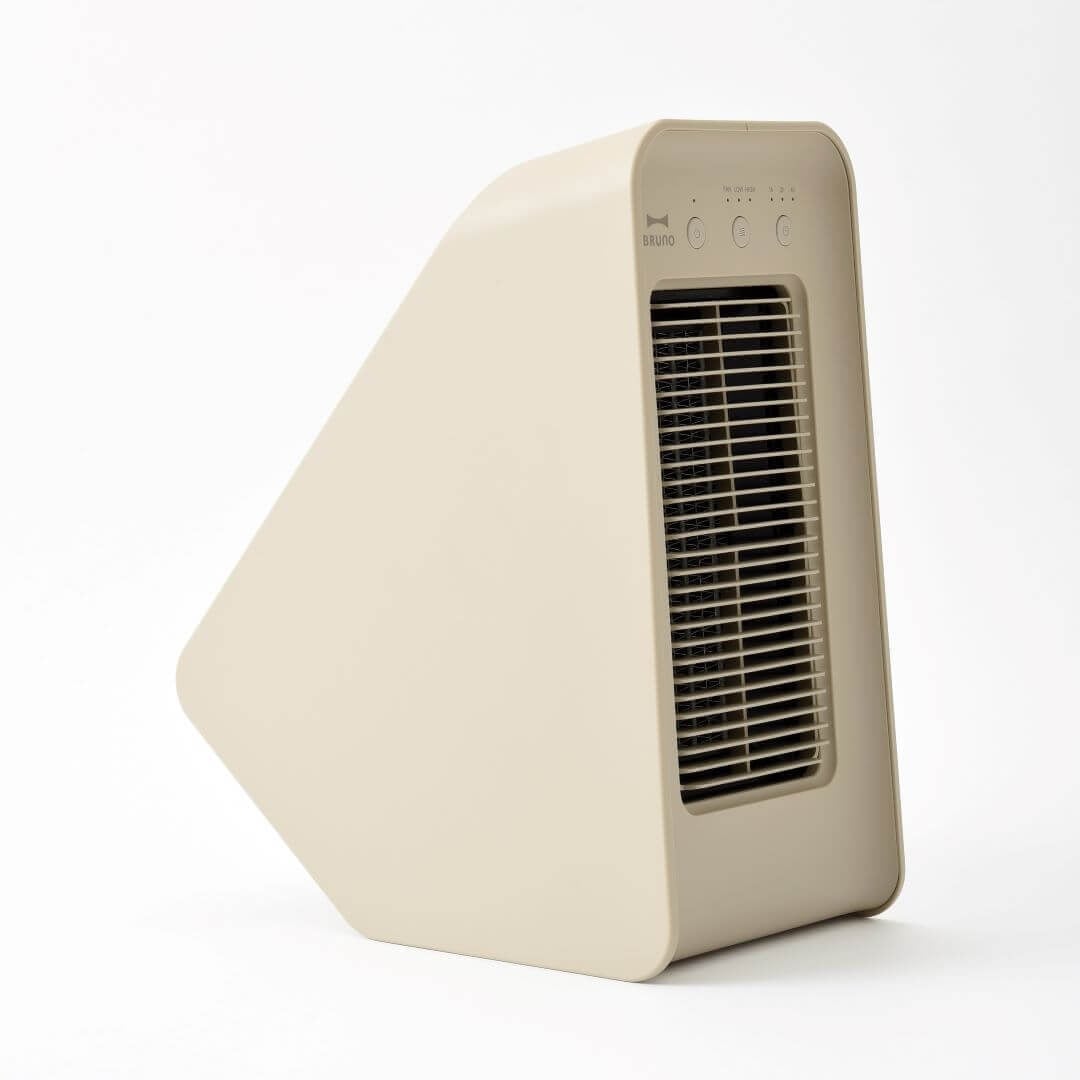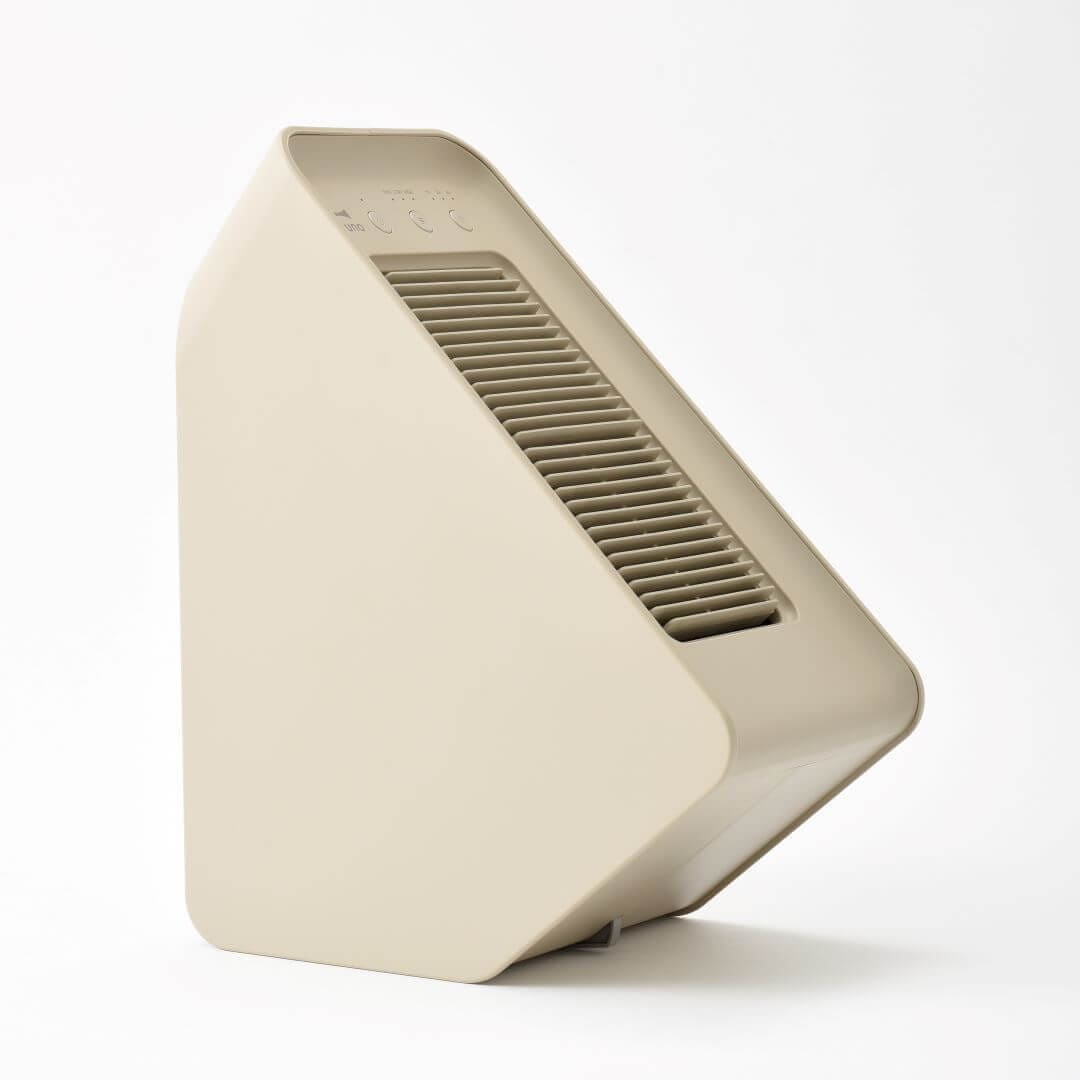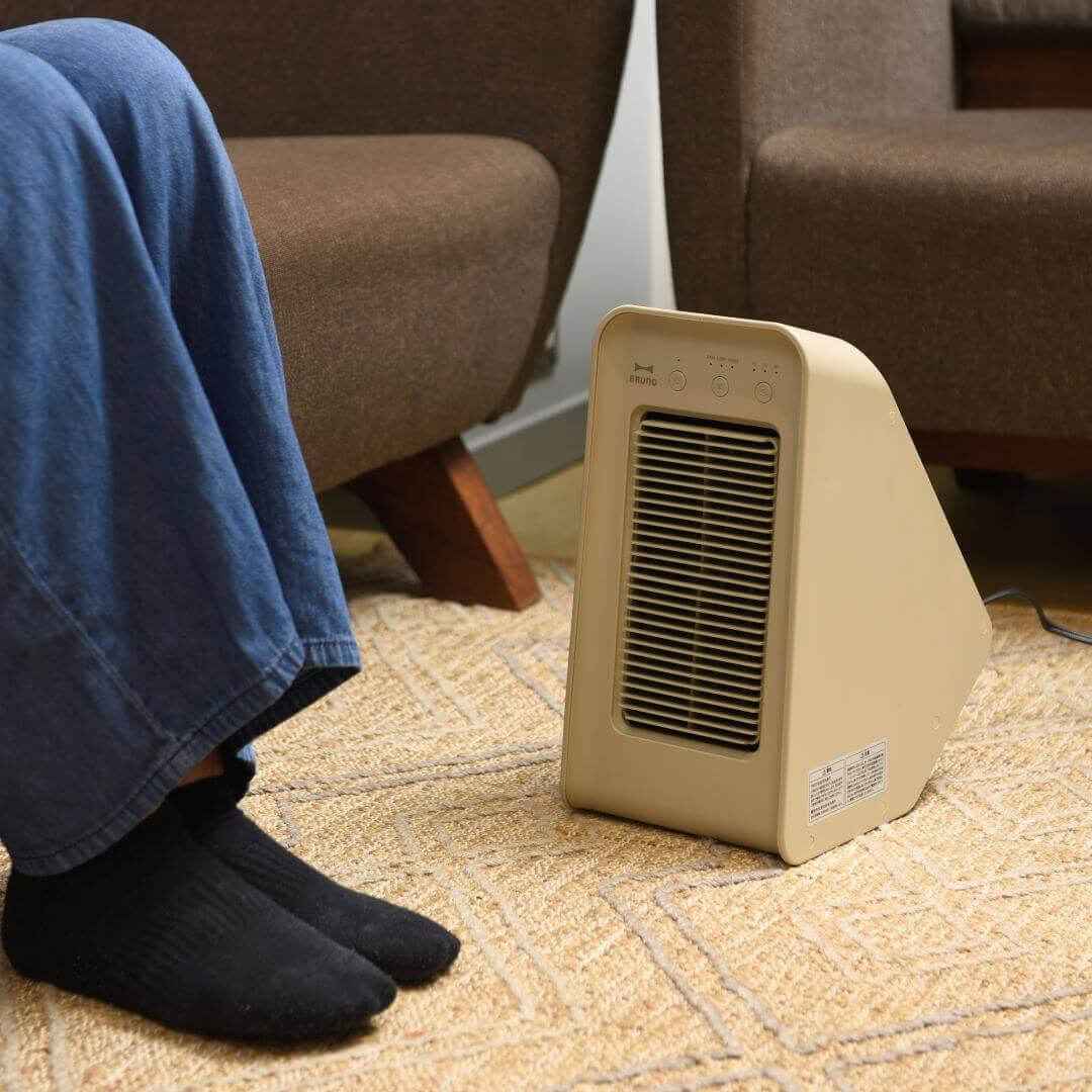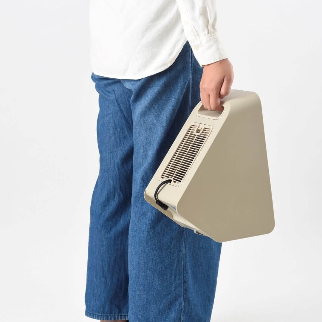 好みの角度と温度で使い分けるファンヒーター 2方向に角度調整可能な、送風機能付きファンヒーターです。スイッチをオンにすると弱・強の温風がすぐ出る1200Wのパワフルさと、シーン別で角度が調整できるデザインが魅力です。リビング、キッチン、脱衣所、デスク下におすすめです。送風モードにすることでエアコンの循環や部屋干しにも活躍します。好みで選べる、2色のカラー展開 カラーは落ちつきのあるグレージュ、ネイビーの2色をご用意しました。シンプルなカラーなので、どんなインテリアにも合わせやすいカラーリングです。お部屋の雰囲気に合わせてお好みのカラーをお選びください。温めたい箇所で変えられる、2つの角度調整 本体を傾けるだけで、簡単に2通りの角度に変えられる独自のデザインです。通常向き(5度)はソファの近くやデスク下などで足元を温めたいときに最適です。上向き(45度)はキッチンや脱衣所で身体全体を温めたいときにぴったり。ガードは上下に可動するので、細かな向きの調整もできます。安心安全の高機能付き 1時間、2時間、4時間のタイマー設定や8時間の連続運転後も、自動で電源が切れる仕組みです。「転倒時オートオフ機能」や「温度過昇停止機能」も搭載しています。小さなお子様やペットがいるご家庭、消し忘れにも安心して使用できます。簡単に持ち運べる便利なハンドル 背面の上部にはくぼみがあるので、簡単に持ち運びができて便利です。くぼみの下にある吸気口カバーの内部には、電源コードを収納できるスペースがあります。保管時にはコンパクトにしまえるだけでなく、使う分の長さだけだしておける設計も魅力です。