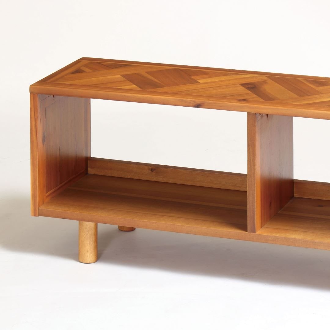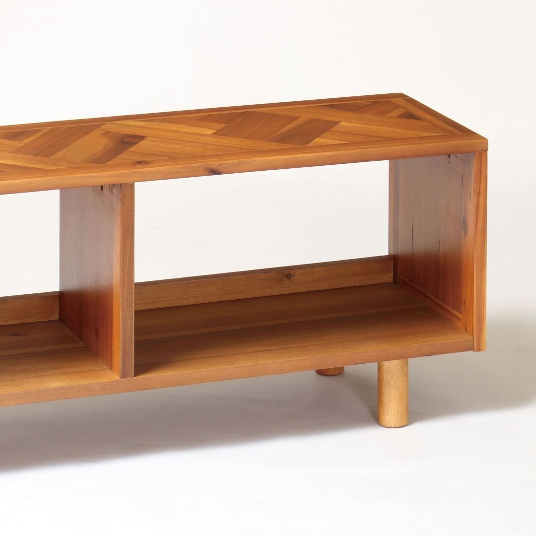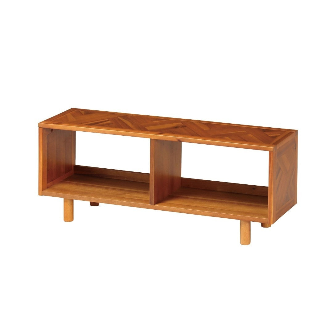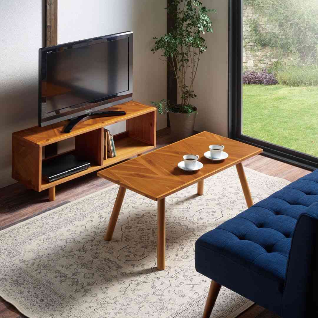 幅広いインテリアに合わせやすい、fintシリーズのテレビ台 天板に幾何学的な模様のデザインを使用した、おしゃれなテレビボードです。無駄のないシンプルなデザインと他の家具とも合わせやすい色合いだから、ビンテージ風、西海岸風、アジアンテイストなど、幅広いインテリアにも合います。インテリアの雰囲気を変えても長く愛用できるのが嬉しいポイント。圧迫感を感じさせないオープンタイプ 19~40Vまでのテレビに適したサイズ感です。扉が付いていないタイプなので、見せる収納をしたい方や開け閉めが面倒という方におすすめです。オープンタイプは通気性がいいからAV機器の熱がこもりにくいだけでなく、コンパクトなお部屋でも圧迫感を感じさせません。シンプルなのに存在感もあるヘリンボーン柄 短くカットした木材をV字につなぎあわせて作られたヘリンボーン柄。派手になりすぎないのに個性を感じられるから、インテリアにちょっとしたこだわりをプラスするのにぴったりのアイテムです。天然木ならではの風合いも一緒にお楽しみいただけます。