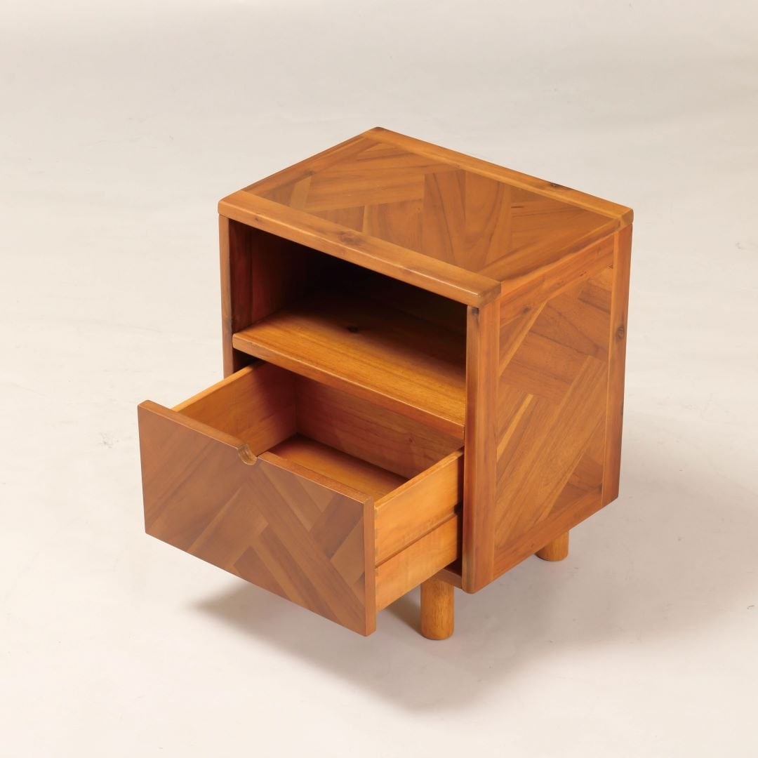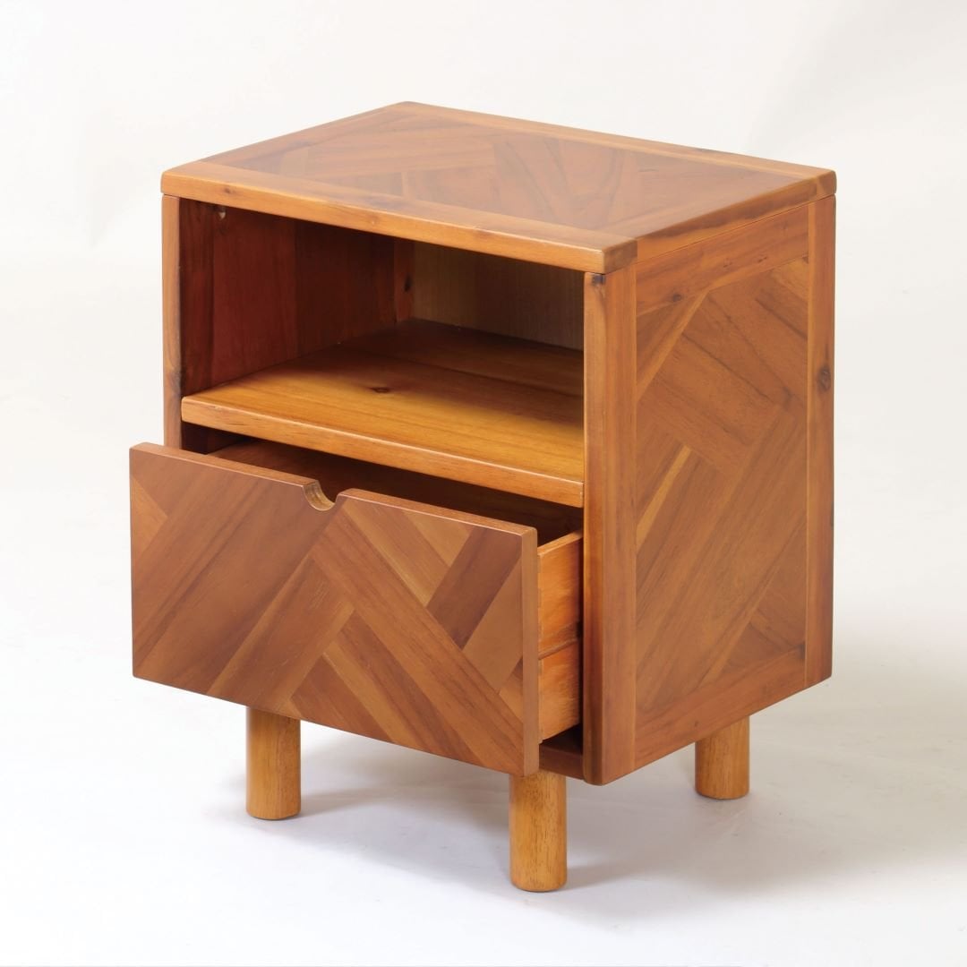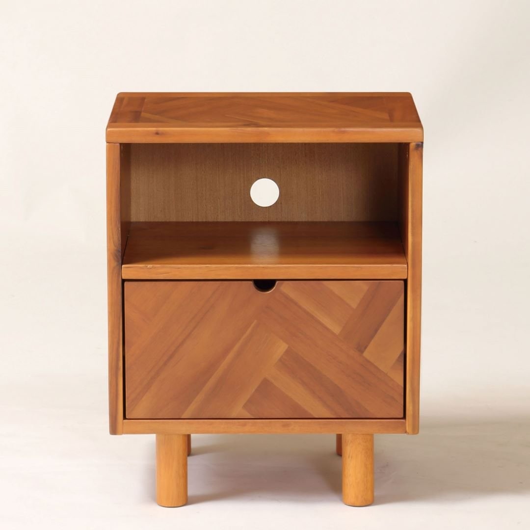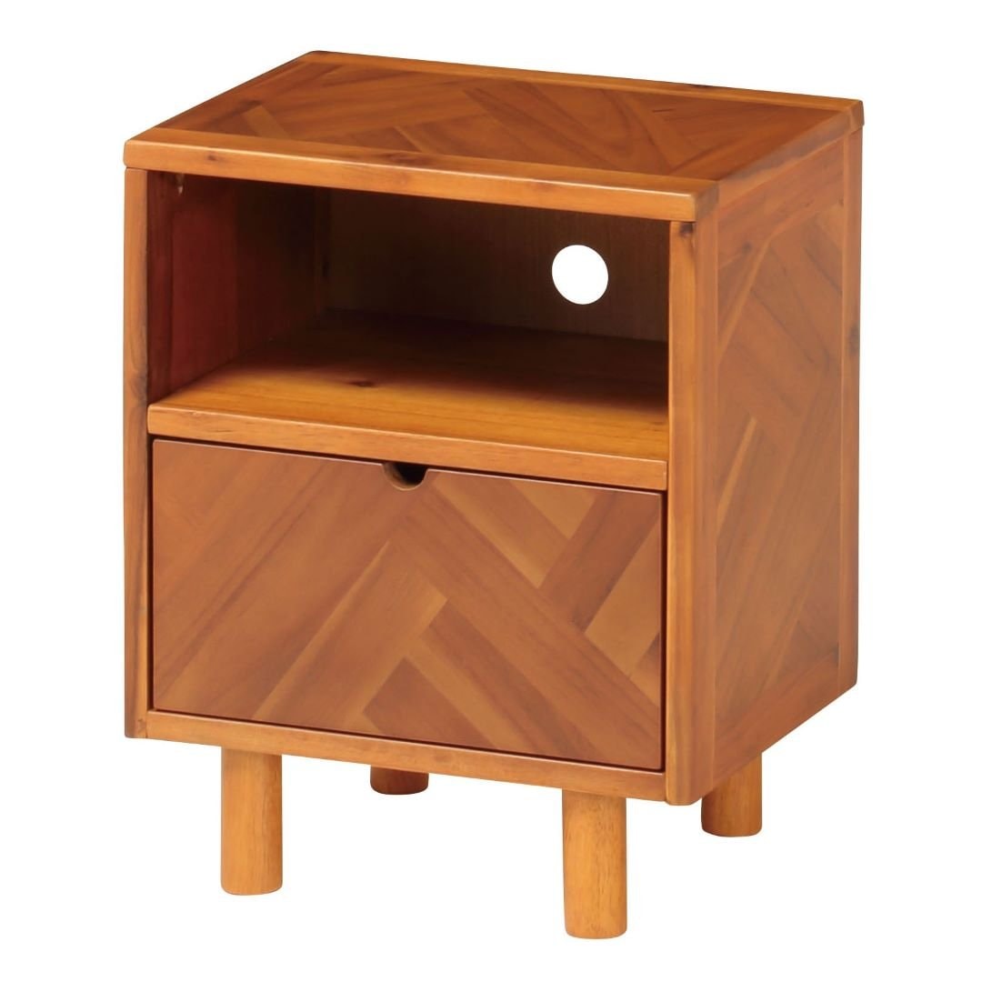 小物の収納に便利な、コンパクトなサイドチェスト お部屋の主役になる個性的なデザインのサイドチェストです。無駄のないシンプルなデザインだから、ビンテージ風、西海岸風、アジアンテイストなど、さまざまなインテリアにも合わせやすいのが魅力です。幅広いシーンの収納に便利 コンパクトなサイズなので、雑貨や本などのちょっとした小物を収納するのにぴったりです。リビングなら毎日の日用品置きに、ベッド横に置いてナイトテーブルに、仕事デスクの下に配置してサイドチェストにしたりと、いろいろな場所で大活躍できるアイテムです。シンプルなのにほどよく存在感のあるヘリンボーン柄 短くカットした木材をV字につなぎあわせて作られたヘリンボーン柄。コンパクトなサイズ感でありながらほどよく存在感を与えるデザインなので、インテリアのポイントとして置くのにおすすめです。天然木ならでは、使い込むごとに味わいが深くなるのをお楽しみいただけます。