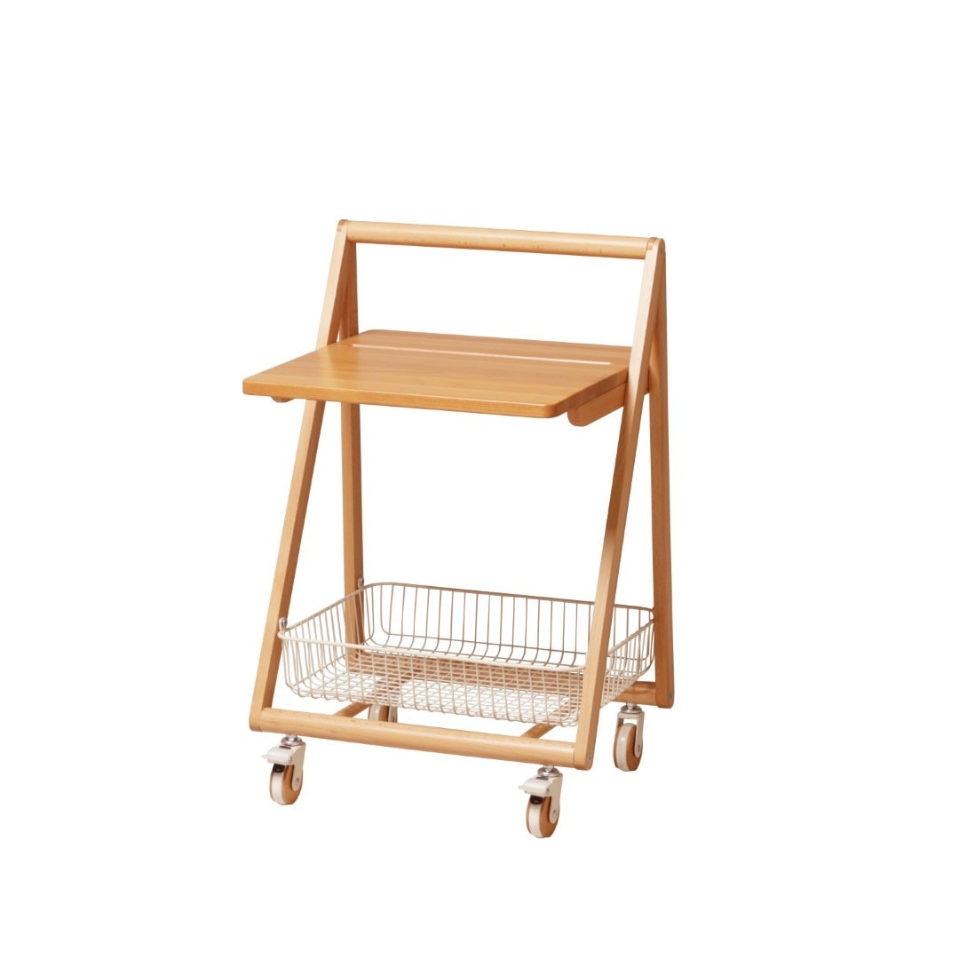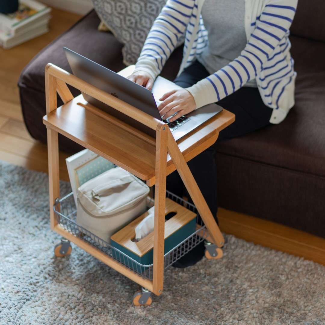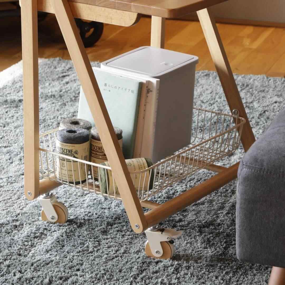 コンパクトで使い勝手◎なテーブルワゴン リビングや寝室などで使い勝手のいいテーブルワゴンです。ベッドのサイドテーブルとしてや、カフェテーブルとしてぴったり。天然木で作られたテーブルワゴンは木目が美しく、木製ならではのぬくもりを与えてくれます。使わないときは隅に寄せておけるコンパクトさも魅力の一つです。木製ワゴンとマッチする2つのナチュラルカラー カラーは、木の色に対してアクセントになるグレー、なじみのいいホワイトをご用意しました。それぞれワゴン下部のカゴとキャスターの色味に違いがあります。どちらも木製ワゴンとの相性がいいカラーなので、お好みに合わせてお選びください。パソコンも楽に置ける広々テーブル ソファに座ってのパソコン作業や、ちょっとした書き物をするのにちょうどいいデスクです。おうちでのリモートワークにもぴったり。キャスターで楽に移動できるので、使いたいときにいつでもサッと手元に引き寄せられます。お茶とお菓子を準備して読書タイム 家事や育児の合間の休憩に、お休みの日のリラックスタイムにリビングでのんびりとしながらカフェタイム。ドリンクや読みかけの本を置くのに最適なコーヒーテーブルです。天板に引かれた一本の溝は、本を立て掛けられるようにといった工夫が。ノートやメイクボックスも収まるたっぷり容量のカゴ テーブルの下部には物を収納できるようにカゴが付いています。コンパクトながらたっぷりと入るので、ゴミ箱やボックスティッシュ、家計簿やメイクボックス、赤ちゃんのおむつ替えセットなど、ライフスタイルに合わせていろいろなものを収納可能です。