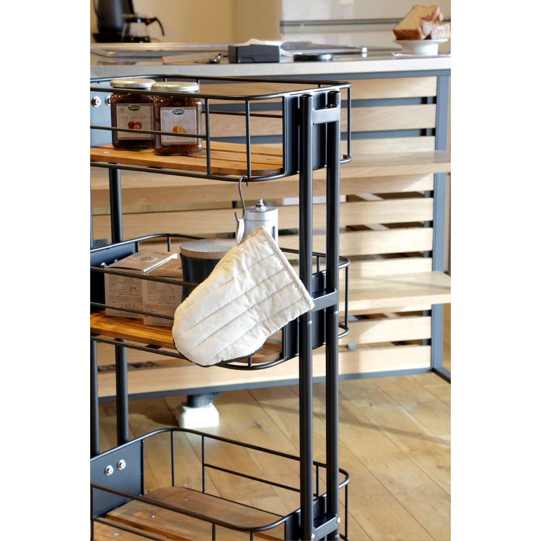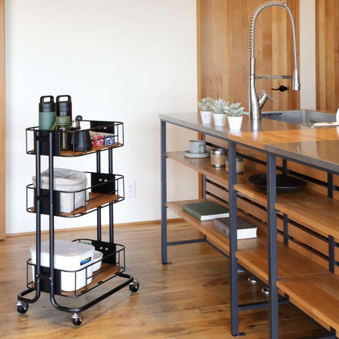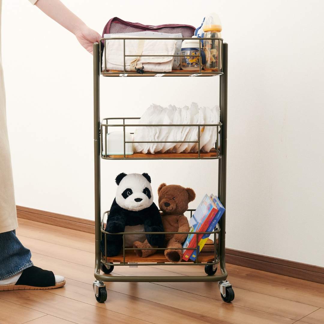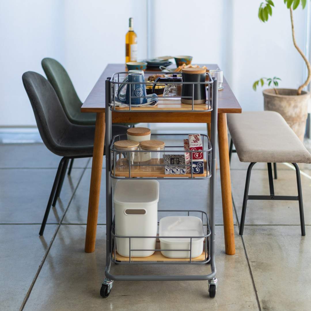シーンを選ばない万能ワゴン 棚を設置するまでもないけど、ちょっとした収納場所が欲しいときにぴったりな万能ワゴンです。キッチンのパントリー代わりや食器入れとして、リビングではベビー用品の収納、子ども部屋はランドセルや習い事のグッズなどをまとめて収納できます。キャスター付きで移動もらくらく。ヴィンテージテイストを含む3色のカラー カラーは、板部分がオイルステイン塗装がされたヴィンテージテイストのブラック、カーキとナチュラルな木にフレーム部分がグレーの3色が登場。男性でも、男の子の部屋でも使いやすいカラーが登場したので、部屋使いはもちろんガレージでの使用、アウトドア用品の収納にもおすすめです。キッチンカウンターの高さを利用して 高めのキッチンカウンターがあるご家庭ではカウンター下のフリースペースを活用してワゴン収納を。ワゴンの高さは約85.5cmなのでカウンター下にワゴンを入れれば邪魔にならず収納スペースも増やせます。また、来客時用にティーセットをまとめて収納して置けば、ワゴンごとテーブル横に移動させられ、何度も行き来する手間もありません。フックを使用してキッチン小物の収納にも フレーム部分にはお手持ちのS字フックなどを引っ掛けられるので、ミトンやエコバッグなどを一緒に収納もできます。よく使用するものはワンアクションで取り出せる位置に収納するのが◎。用途に合わせて選べる2サイズ Mashの「ビーワイケージワゴン」はこちらの奥行約35cmのタイプとスリムタイプの奥行約20cmのご用意がございます。並べて使用するのもおすすめです。使用場所や用途、ご家族の人数に合わせて使い分けなどご家庭に合わせてサイズを選んでみてください。※サイズ違いのスリムタイプは別ページよりご確認いただけます。