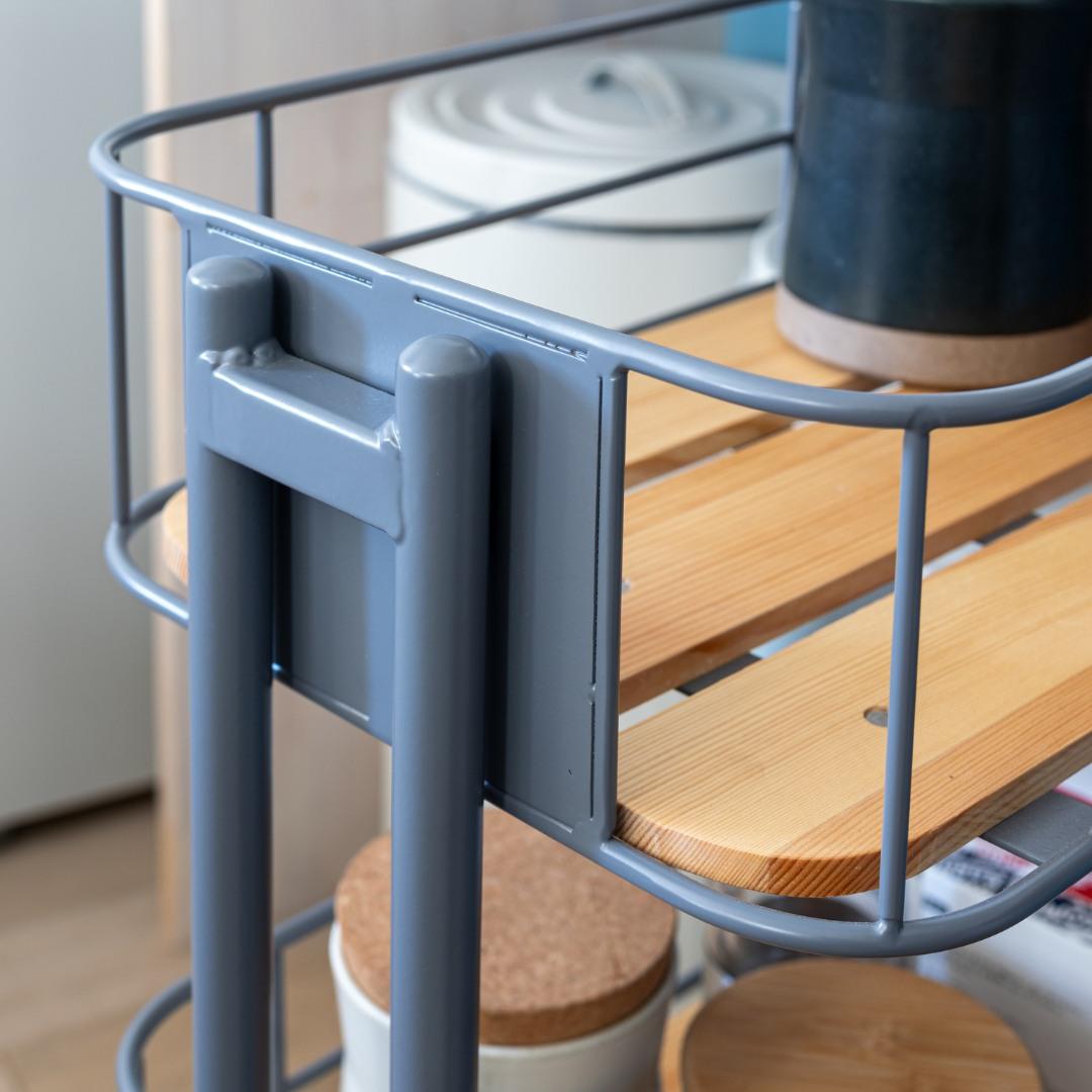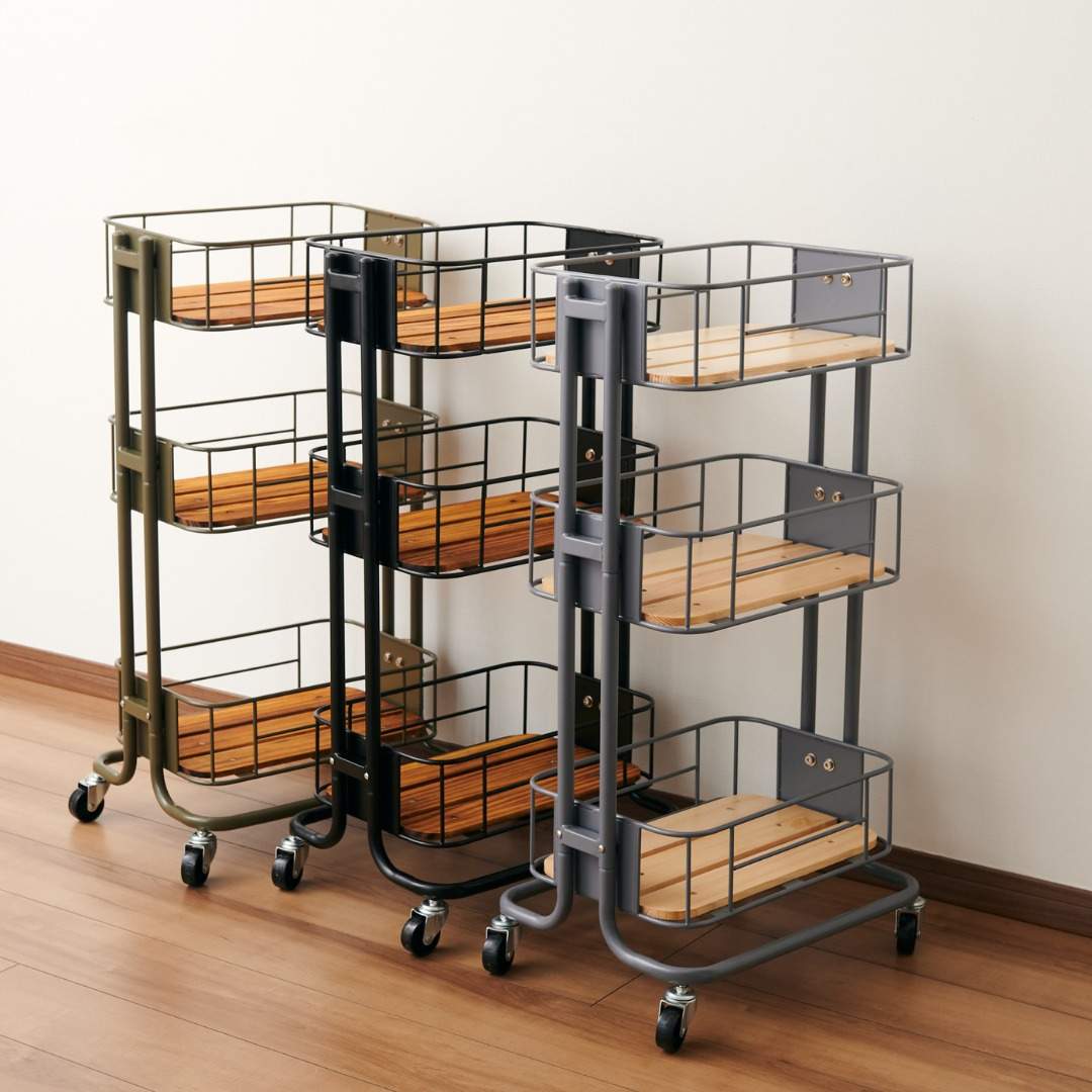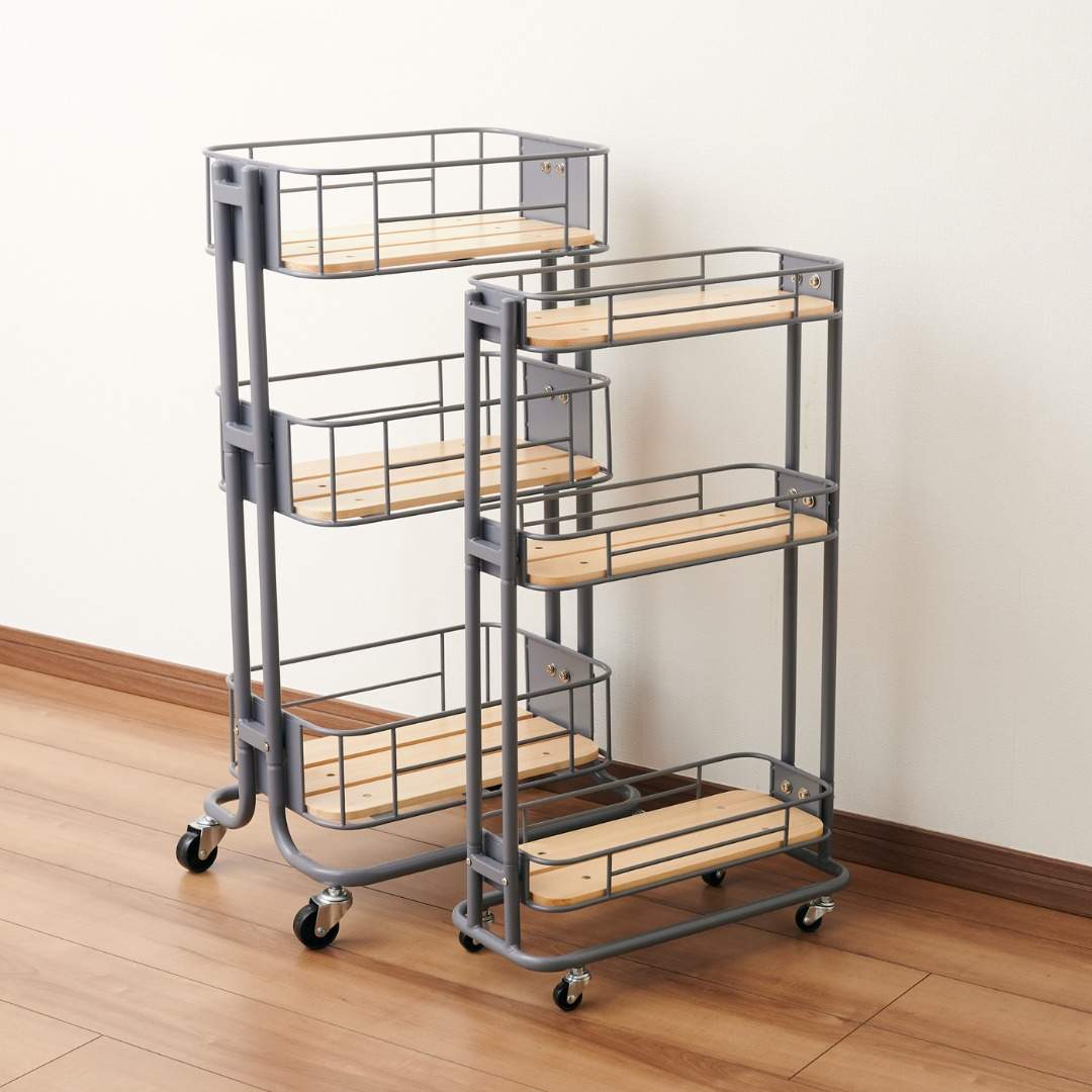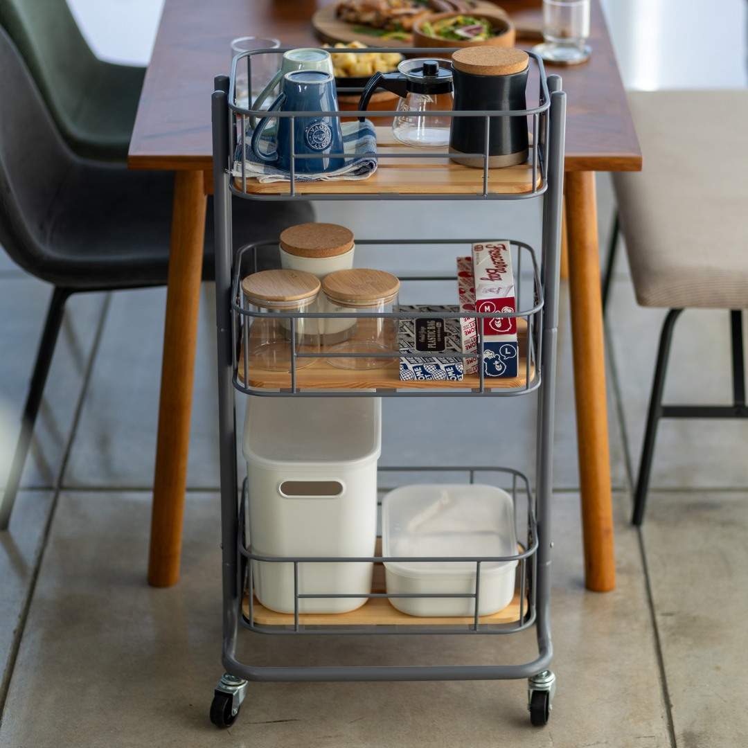 シーンを選ばない万能ワゴン 棚を設置するまでもないけど、ちょっとした収納場所が欲しいときにぴったりな万能ワゴンです。キッチンのパントリー代わりや食器入れとして、リビングではベビー用品の収納、子ども部屋はランドセルや習い事のグッズなどをまとめて収納できます。キャスター付きで移動もらくらく。ヴィンテージテイストを含む3色のカラー カラーは、板部分がオイルステイン塗装がされたヴィンテージテイストのブラック、カーキとナチュラルな木にフレーム部分がグレーの3色が登場。男性でも、男の子の部屋でも使いやすいカラーが登場したので、部屋使いはもちろんガレージでの使用、アウトドア用品の収納にもおすすめです。キッチンカウンターの高さを利用して 高めのキッチンカウンターがあるご家庭ではカウンター下のフリースペースを活用してワゴン収納を。ワゴンの高さは約85.5cmなのでカウンター下にワゴンを入れれば邪魔にならず収納スペースも増やせます。また、来客時用にティーセットをまとめて収納して置けば、ワゴンごとテーブル横に移動させられ、何度も行き来する手間もありません。フックを使用してキッチン小物の収納にも フレーム部分にはお手持ちのS字フックなどを引っ掛けられるので、ミトンやエコバッグなどを一緒に収納もできます。よく使用するものはワンアクションで取り出せる位置に収納するのが◎。用途に合わせて選べる2サイズ Mashの「ビーワイケージワゴン」はこちらの奥行約35cmのタイプとスリムタイプの奥行約20cmのご用意がございます。並べて使用するのもおすすめです。使用場所や用途、ご家族の人数に合わせて使い分けなどご家庭に合わせてサイズを選んでみてください。※サイズ違いのスリムタイプは別ページよりご確認いただけます。