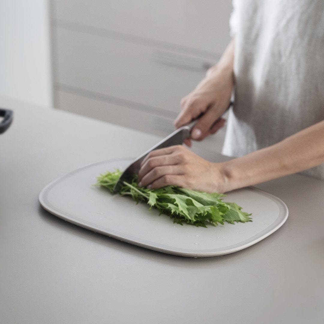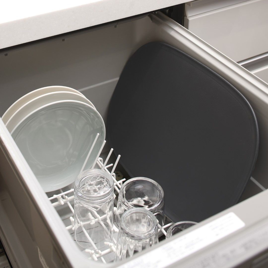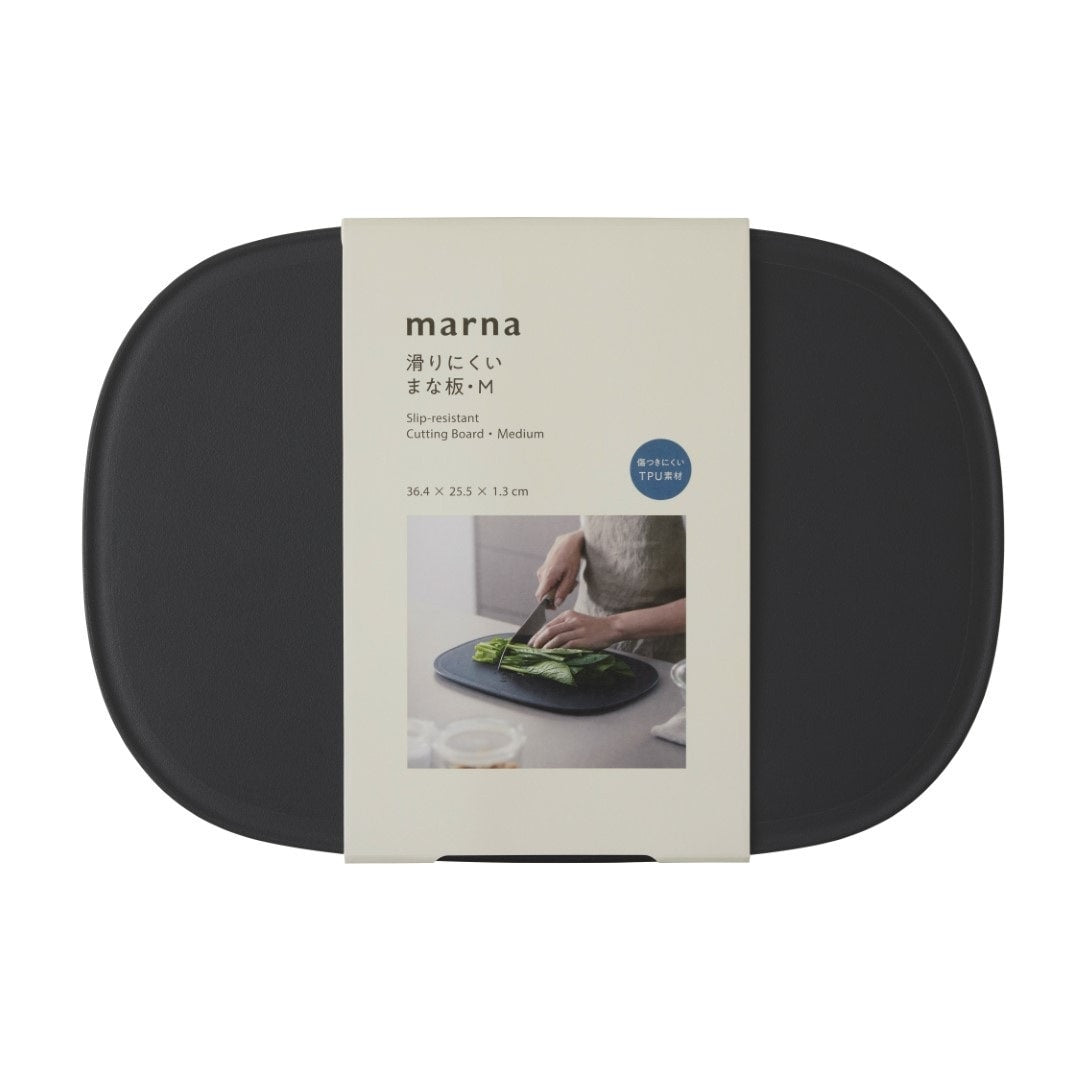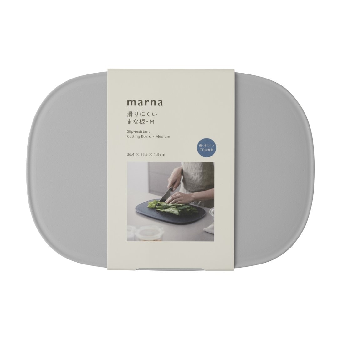 安定性&使い心地◎ こんなまな板欲しかった。切っているときも、立てかけているときもすべりにくい設計のまな板です。毎日使う調理ツールだからこそ、使い勝手の良いものを選びたい。復元性の高いTPU素材を採用したことで傷がつきにくく衛生的にお使いいただけます。トントンっとやさしい感覚で切れる刃当たりの良さも魅力です。キッチンになじみやすい、2色のカラーバリエーション カラーは、スタイリッシュなダークグレー、上品な印象のグレーをご用意しました。すでにお持ちのキッチンツールに合わせやすいシンプルなカラーです。キッチンの雰囲気に合わせてお好きなカラーをお選びください。お皿のようなフチ形状で持ち上げやすく 指がスッと差し込めて持ち上げやすいフチ形状をしています。調理台が濡れていてもまな板が張り付かず、スムーズに移動が可能です。軽すぎず、重すぎない適度な重さのまな板は食材を切っているときもズレにくく、使用前後の取り回しがしやすいです。食洗機の使用◎ お手入れ簡単で洗い残しの心配なし。食器と一緒に食洗機にかけられるのでお手入れがラクちんです。特別な手入れをせずとも、毎日食洗機にセットするだけでいつでも清潔。たわしまたは磨き粉を使用すると傷がつくことがあります。手洗いの際には食器用洗剤を含ませたスポンジで洗い、よく乾燥させてください。食卓にも便利なSサイズ、毎日使いにちょうどいいMサイズ 約23cm×23cmのSサイズ、約36.4cm×25.5cmのMサイズと2パターンをご用意しています。ちょっとした食材の切り分け、食卓で使いやすい大きさならSサイズ。キッチンで毎日の食事作りに使うならMサイズがおすすめです。※こちらの商品は『まな板 M』の商品となり、『まな板 S』の商品は別売です。