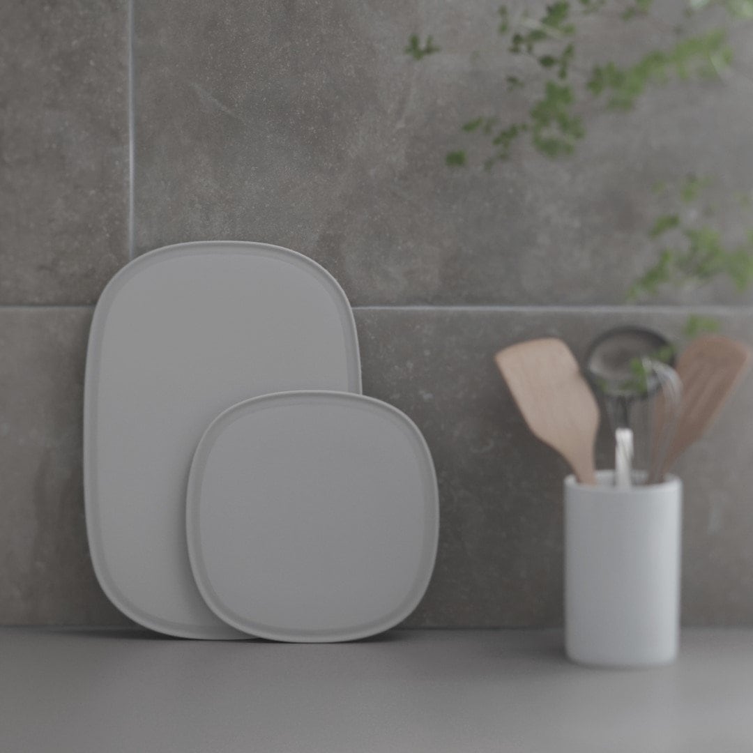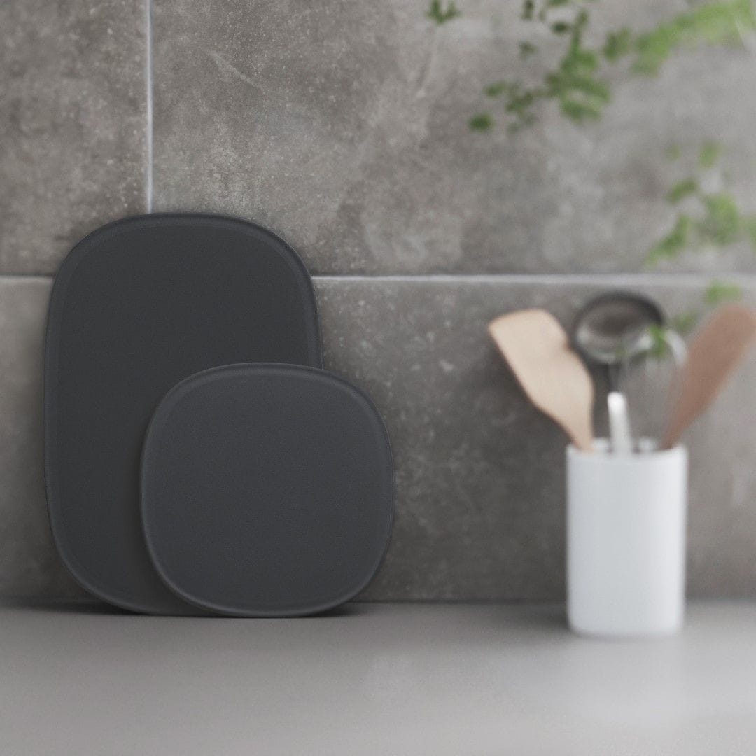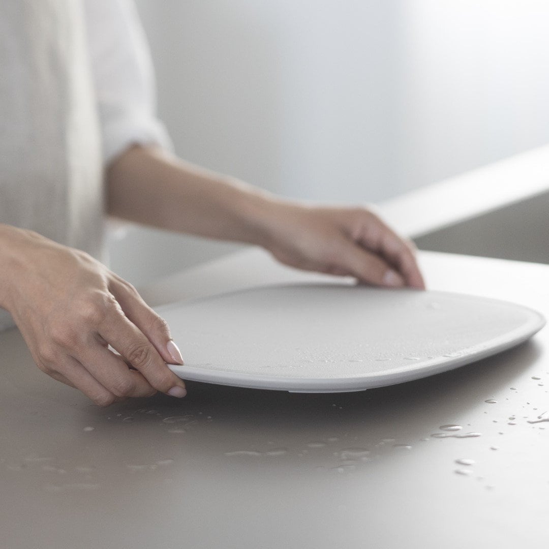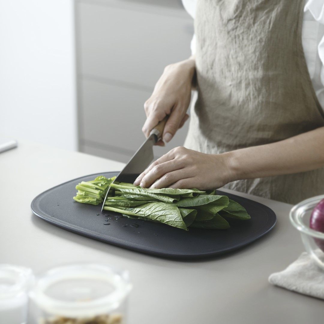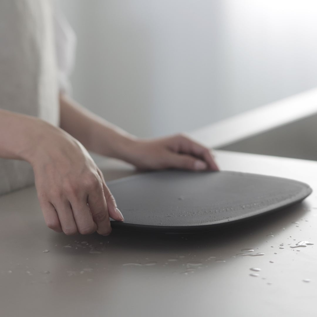 安定性&使い心地◎ こんなまな板欲しかった。切っているときも、立てかけているときもすべりにくい設計のまな板です。毎日使う調理ツールだからこそ、使い勝手の良いものを選びたい。復元性の高いTPU素材を採用したことで傷がつきにくく衛生的にお使いいただけます。トントンっとやさしい感覚で切れる刃当たりの良さも魅力です。キッチンになじみやすい、2色のカラーバリエーション カラーは、スタイリッシュなダークグレー、上品な印象のグレーをご用意しました。すでにお持ちのキッチンツールに合わせやすいシンプルなカラーです。キッチンの雰囲気に合わせてお好きなカラーをお選びください。お皿のようなフチ形状で持ち上げやすく 指がスッと差し込めて持ち上げやすいフチ形状をしています。調理台が濡れていてもまな板が張り付かず、スムーズに移動が可能です。軽すぎず、重すぎない適度な重さのまな板は食材を切っているときもズレにくく、使用前後の取り回しがしやすいです。食洗機の使用◎ お手入れ簡単で洗い残しの心配なし。食器と一緒に食洗機にかけられるのでお手入れがラクちんです。特別な手入れをせずとも、毎日食洗機にセットするだけでいつでも清潔。たわしまたは磨き粉を使用すると傷がつくことがあります。手洗いの際には食器用洗剤を含ませたスポンジで洗い、よく乾燥させてください。食卓にも便利なSサイズ、毎日使いにちょうどいいMサイズ 約23cm×23cmのSサイズ、約36.4cm×25.5cmのMサイズと2パターンをご用意しています。ちょっとした食材の切り分け、食卓で使いやすい大きさならSサイズ。キッチンで毎日の食事作りに使うならMサイズがおすすめです。※こちらの商品は『まな板 M』の商品となり、『まな板 S』の商品は別売です。