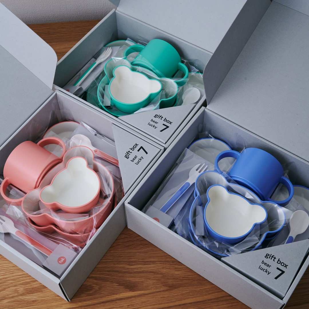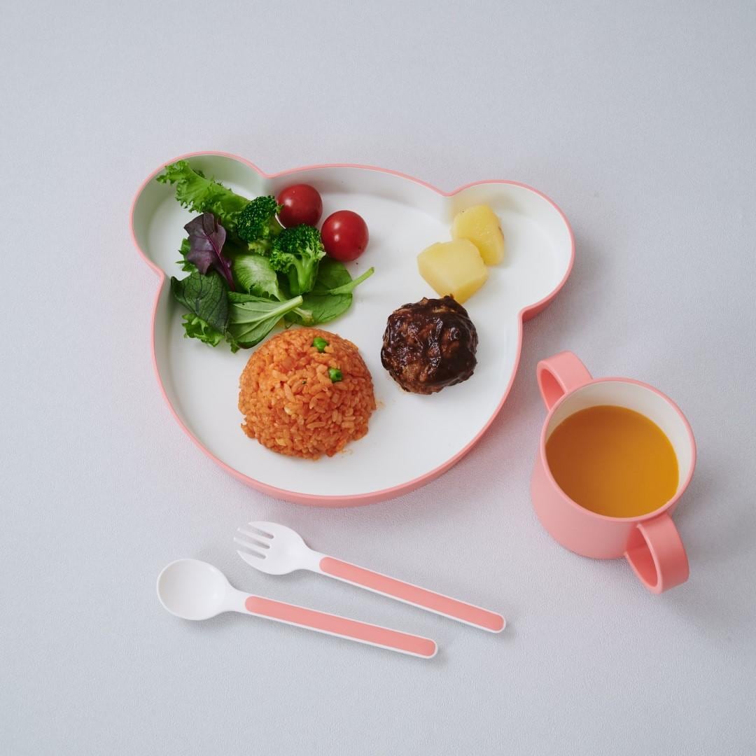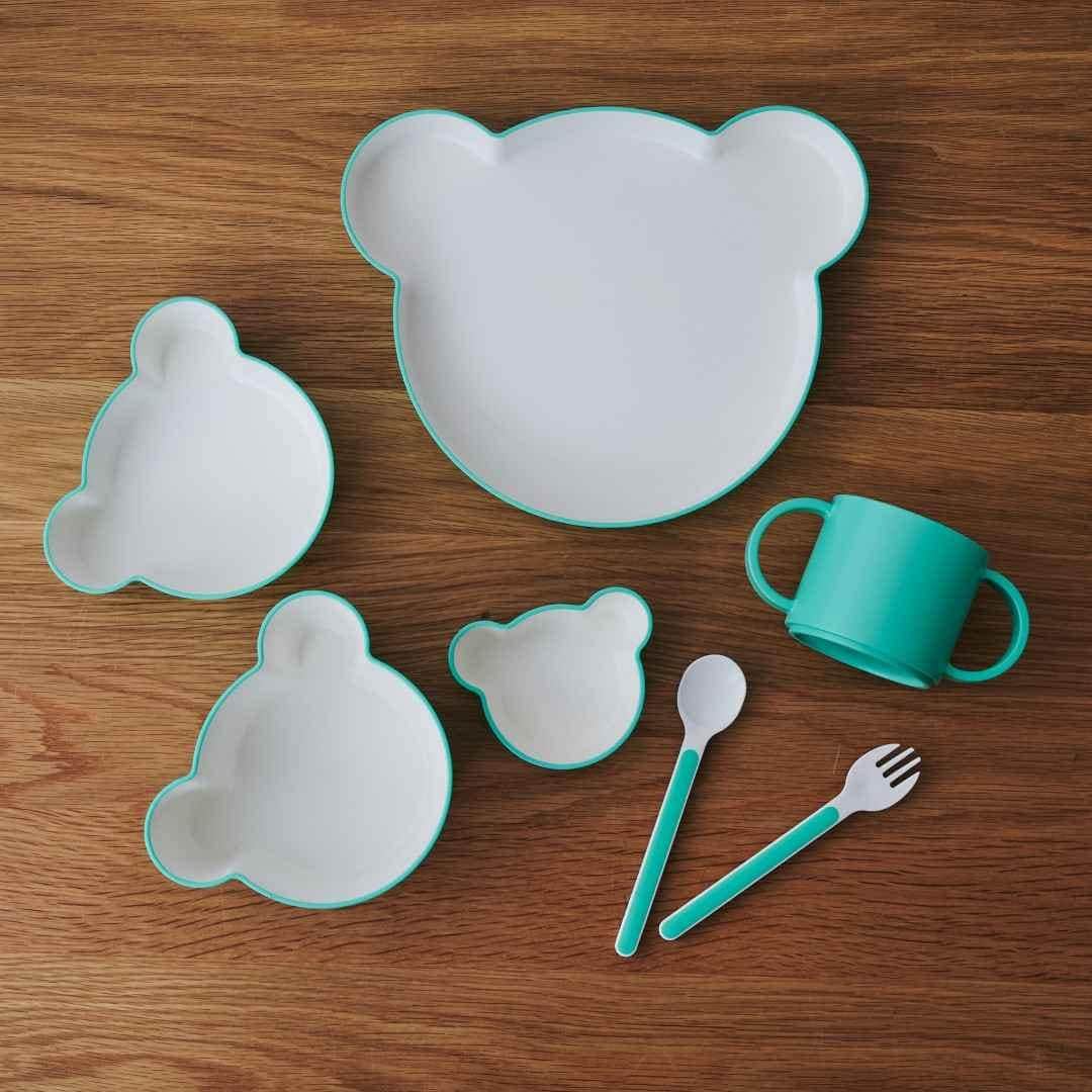 キッズディッシュプレートベア、ボウルベアM、ボウルベアS、ボウルベアSS、マグ、フォーク、スプーンの7点セットです。キッズディッシュ ベアをそろえて使いたいという方にぴったり。ボウルの内側やカトラリーの先端部分が白いので食材の色がわかりやすいです。カラーは、さわやかなミント、落ち着きのあるバイオレットブルー、明るいカラーのピーチをご用意しました。大人用のテーブルウェアとの相性が良かったり、お子さんが喜びそうなカラーのラインナップです。きょうだいで色違いにするなどもおすすめです。キッズディッシュプレートベアは、お子様ランチのように色々なおかずが乗せられて楽しく食べられます。ボウルベアMは深さがあるので大き目のおかずやスープもOK◎。ボウルベアSは、おにぎりやつかみ食べできるおかずを入れるのにぴったりなサイズ感です。フルーツ皿として使うのも◎。ボウルベアSSは、少量のおかゆ、プリンやゼリー型としてデザートに使ったり、ご飯をかわいくくまさん型にする抜き型としてもご使用いただけます。環境ホルモンの一つであるBPAを含まないので、お子さんの口に入るものに気を付けているご家庭でも安心してご使用いただけます。食洗機も使用が可能なので、大人用の食器と一緒に食後はパパッと食洗機へセット。ボウルは電子レンジにも対応しているので、おかずの温め直しもできます。ボックス入りなのでギフトとして贈っても見栄えがいいのが◎。出産祝いやお誕生日のお祝いなどにぴったり。ご友人のお子さんやお孫さん、甥っ子や姪っ子など、どのような間柄の相手でも送りやすいアイテムです。