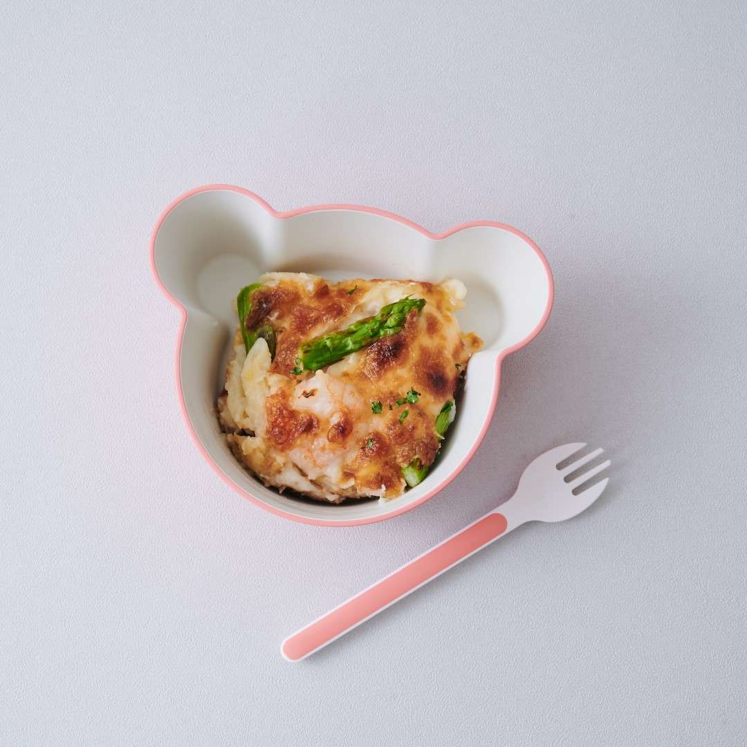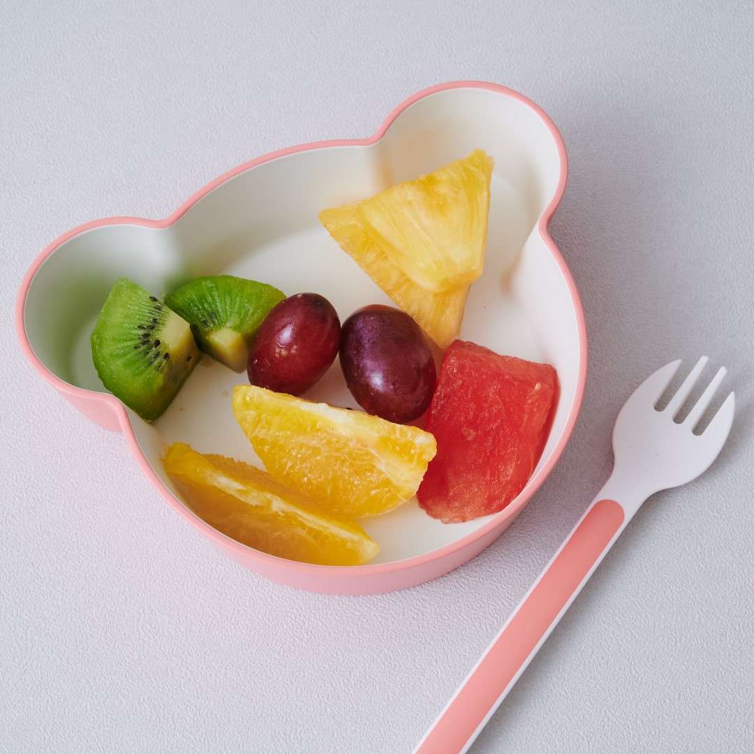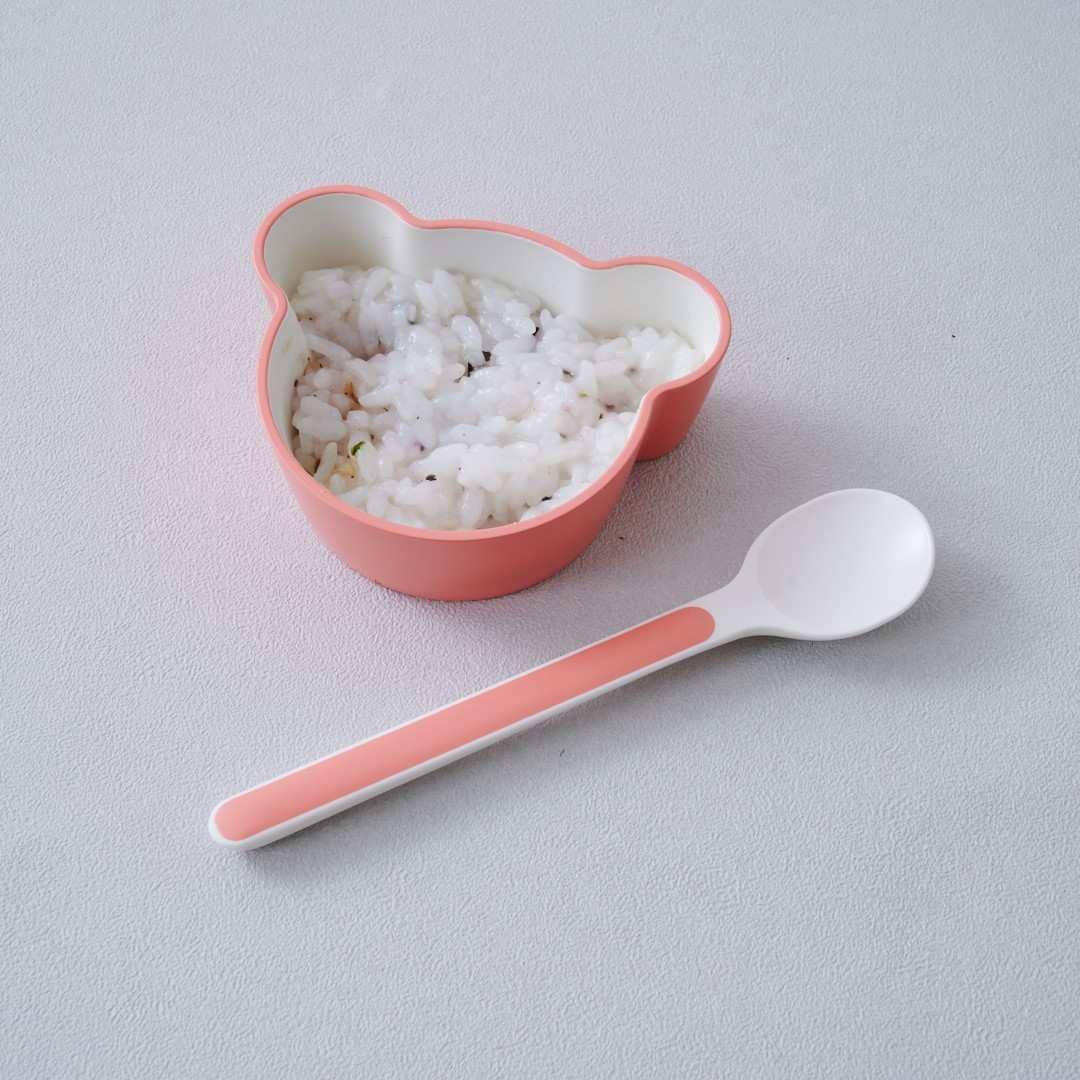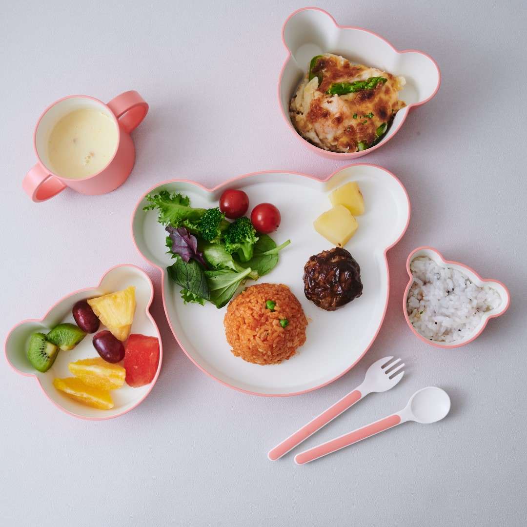 キッズディッシュプレートベア、ボウルベアM、ボウルベアS、ボウルベアSS、マグ、フォーク、スプーンの7点セットです。キッズディッシュ ベアをそろえて使いたいという方にぴったり。ボウルの内側やカトラリーの先端部分が白いので食材の色がわかりやすいです。カラーは、さわやかなミント、落ち着きのあるバイオレットブルー、明るいカラーのピーチをご用意しました。大人用のテーブルウェアとの相性が良かったり、お子さんが喜びそうなカラーのラインナップです。きょうだいで色違いにするなどもおすすめです。キッズディッシュプレートベアは、お子様ランチのように色々なおかずが乗せられて楽しく食べられます。ボウルベアMは深さがあるので大き目のおかずやスープもOK◎。ボウルベアSは、おにぎりやつかみ食べできるおかずを入れるのにぴったりなサイズ感です。フルーツ皿として使うのも◎。ボウルベアSSは、少量のおかゆ、プリンやゼリー型としてデザートに使ったり、ご飯をかわいくくまさん型にする抜き型としてもご使用いただけます。環境ホルモンの一つであるBPAを含まないので、お子さんの口に入るものに気を付けているご家庭でも安心してご使用いただけます。食洗機も使用が可能なので、大人用の食器と一緒に食後はパパッと食洗機へセット。ボウルは電子レンジにも対応しているので、おかずの温め直しもできます。ボックス入りなのでギフトとして贈っても見栄えがいいのが◎。出産祝いやお誕生日のお祝いなどにぴったり。ご友人のお子さんやお孫さん、甥っ子や姪っ子など、どのような間柄の相手でも送りやすいアイテムです。