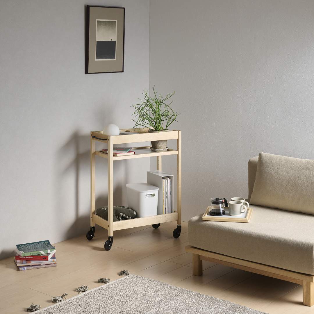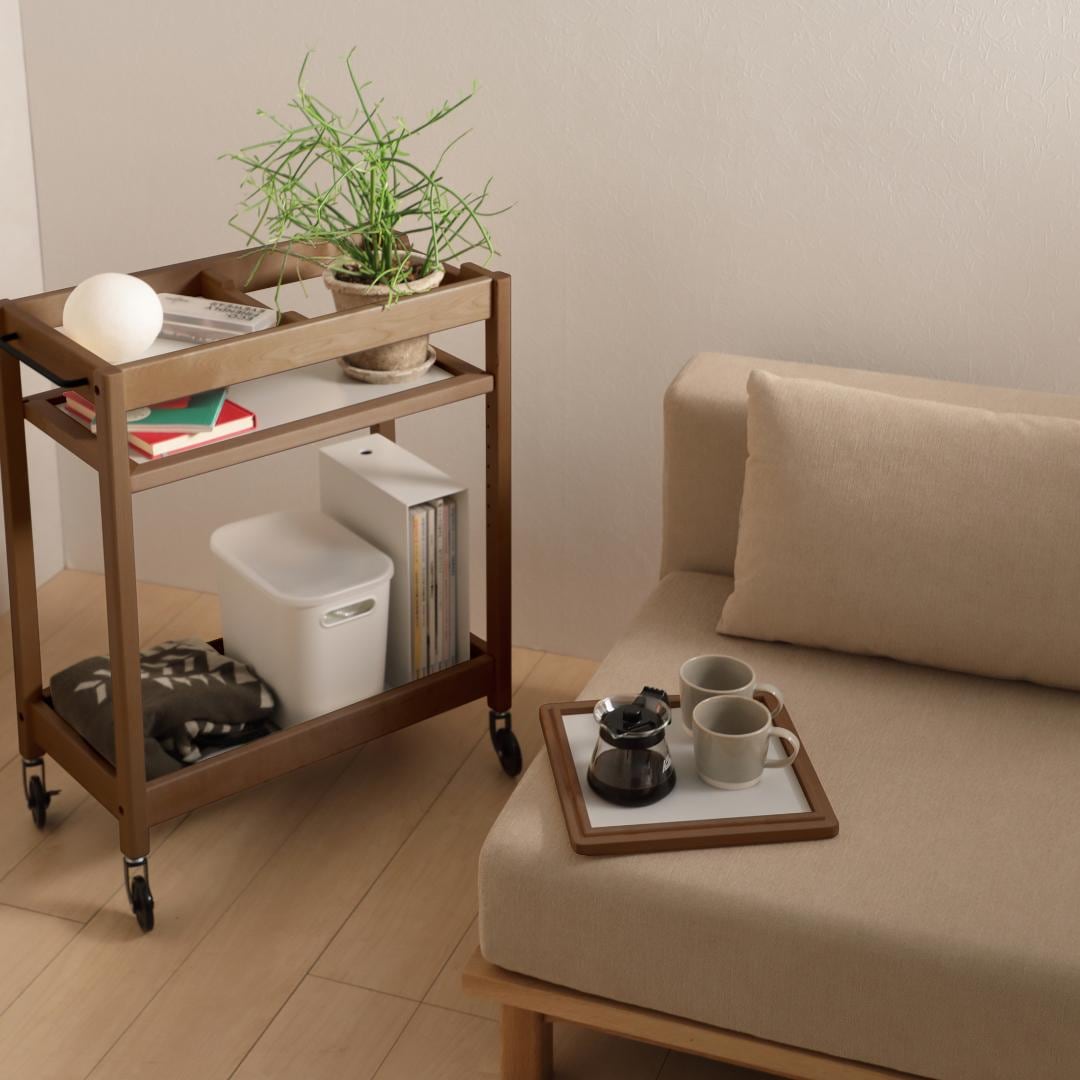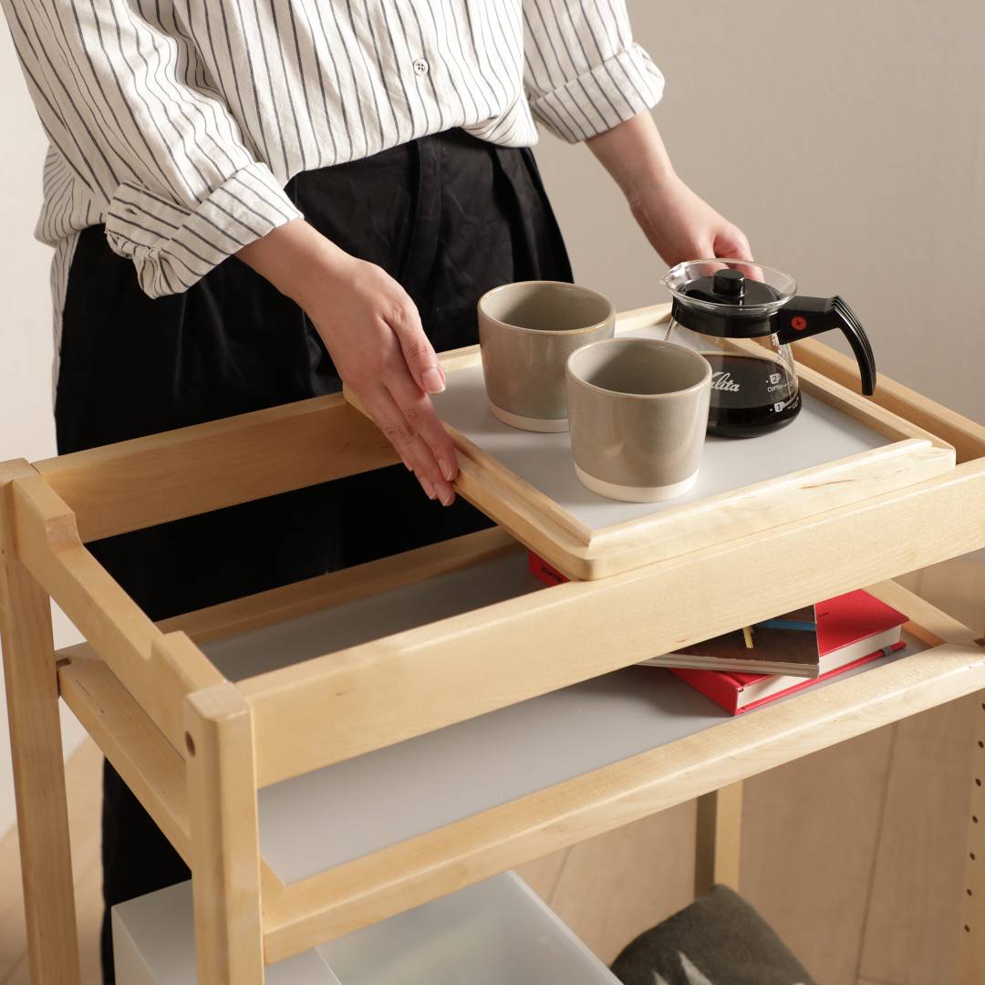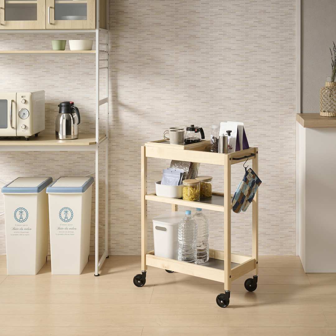 トレーが棚板代わりにもなるキッチンワゴン棚板三段タイプの木製キッチンワゴンです。一段目には半分しか棚板がないので、ワインなど背の高いボトルを置くのにぴったり。一段目のフレームが柵になり、移動時の衝撃でボトルが落下するのを防ぎます。トレーは一段目の左右どちらにでも取り付けられます。上質な空間を演出できる、2色のカラーバリエーションカラーは、天板がホワイト×天然木が白っぽい『ナチュラル』、天板がブラック×天然木が落ち着いた色味の『ブラウン』をご用意しました。キッチンやリビングの雰囲気に合わせてお好みのカラーをお選びください。ずっと触れていたくなる温もりあるワゴン枠手触りの良いさらっとした天然木のワゴンはどんなインテリアのお部屋にもよくなじみ、空間にあたたかみをプラスします。ハンドルはキャスターと同じブラックカラーで統一感も◎。キャスターにはストッパーが付いているので、その場で動かないようにもしておけて安心です。雑然としがちな小物はワゴンへリモコンや雑誌、観葉植物などリビング小物の収納スペースとしてキッチン以外に常駐させるのもOK。二段目は可動式でお好みの高さに調整してご使用いただけます。一段目の棚板がない部分を利用して物を置く際には高めの位置に、キャニスターなど食品のストックを収納するなら低めの位置など。ティーブレイクにはお茶とお供をワゴンに乗せてキッチンでお茶の用意をしたらそのままコロコロキャスターを転がしてリビングへ。ドリンクが乗ったトレーをテーブルに置き、ワゴンはソファ横につけてブレイクタイム。ワゴンの下段には作業中の編み物や、読みかけの本を置いて家事の合間に自分時間を満喫できます。