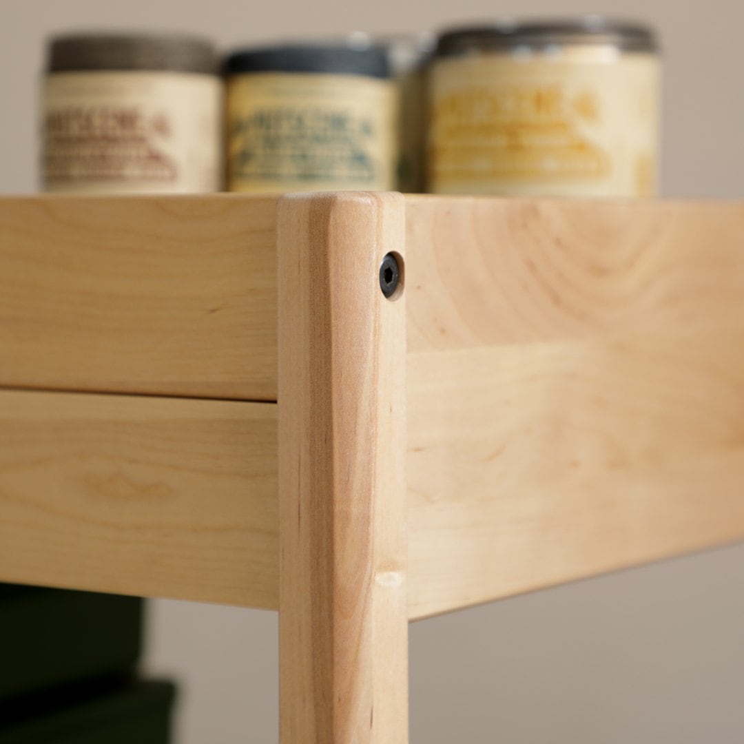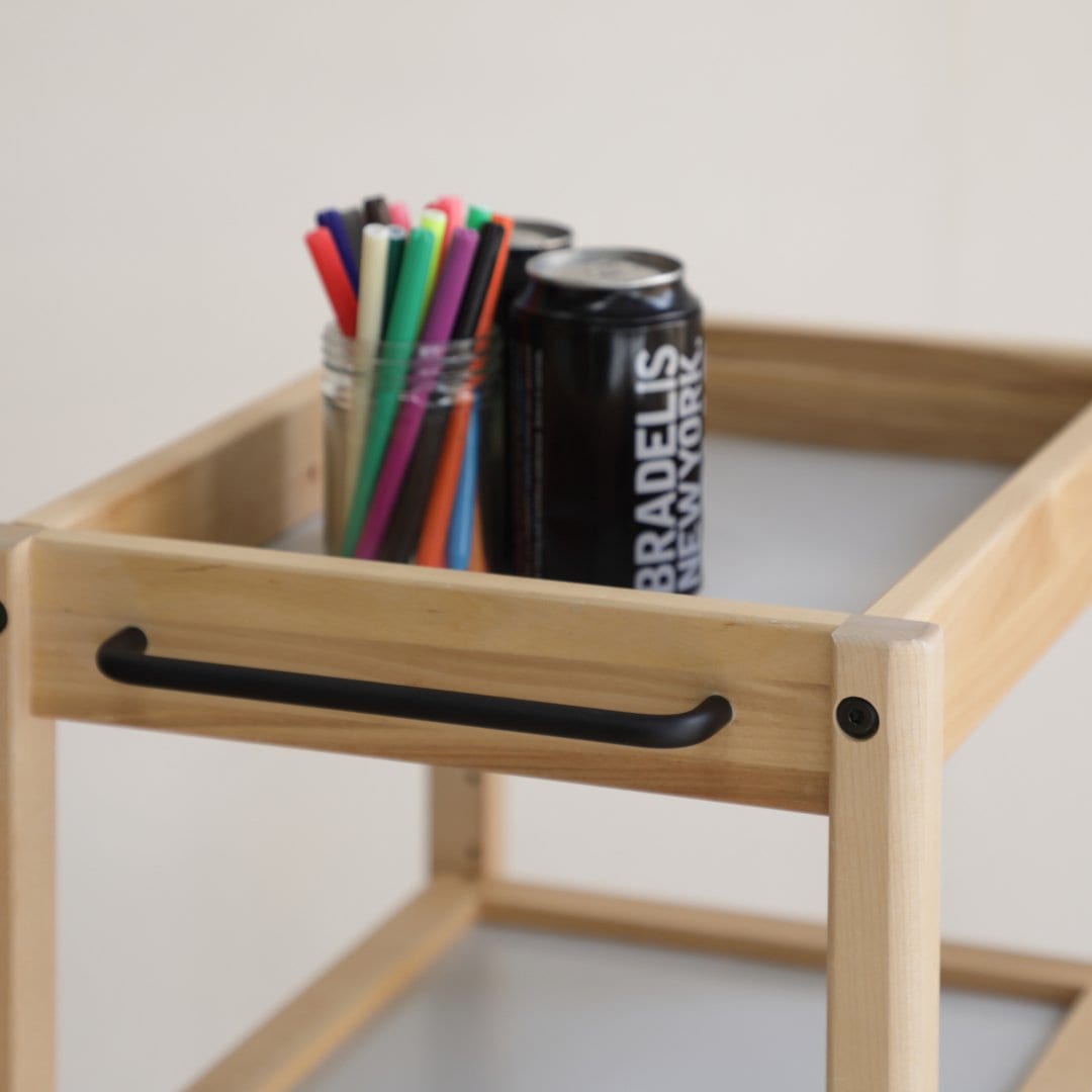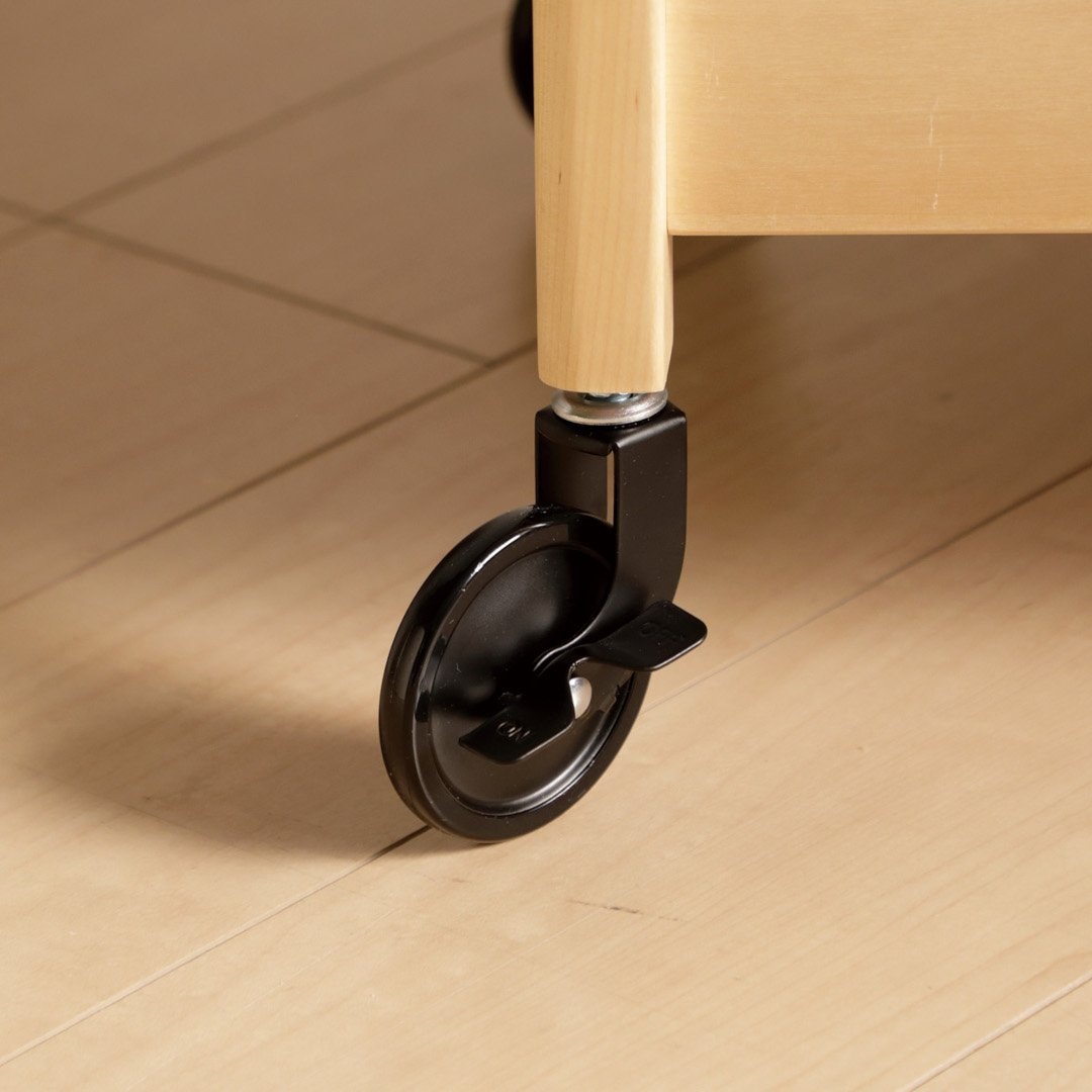 トレーが棚板代わりにもなるキッチンワゴン棚板三段タイプの木製キッチンワゴンです。一段目には半分しか棚板がないので、ワインなど背の高いボトルを置くのにぴったり。一段目のフレームが柵になり、移動時の衝撃でボトルが落下するのを防ぎます。トレーは一段目の左右どちらにでも取り付けられます。上質な空間を演出できる、2色のカラーバリエーションカラーは、天板がホワイト×天然木が白っぽい『ナチュラル』、天板がブラック×天然木が落ち着いた色味の『ブラウン』をご用意しました。キッチンやリビングの雰囲気に合わせてお好みのカラーをお選びください。ずっと触れていたくなる温もりあるワゴン枠手触りの良いさらっとした天然木のワゴンはどんなインテリアのお部屋にもよくなじみ、空間にあたたかみをプラスします。ハンドルはキャスターと同じブラックカラーで統一感も◎。キャスターにはストッパーが付いているので、その場で動かないようにもしておけて安心です。雑然としがちな小物はワゴンへリモコンや雑誌、観葉植物などリビング小物の収納スペースとしてキッチン以外に常駐させるのもOK。二段目は可動式でお好みの高さに調整してご使用いただけます。一段目の棚板がない部分を利用して物を置く際には高めの位置に、キャニスターなど食品のストックを収納するなら低めの位置など。ティーブレイクにはお茶とお供をワゴンに乗せてキッチンでお茶の用意をしたらそのままコロコロキャスターを転がしてリビングへ。ドリンクが乗ったトレーをテーブルに置き、ワゴンはソファ横につけてブレイクタイム。ワゴンの下段には作業中の編み物や、読みかけの本を置いて家事の合間に自分時間を満喫できます。