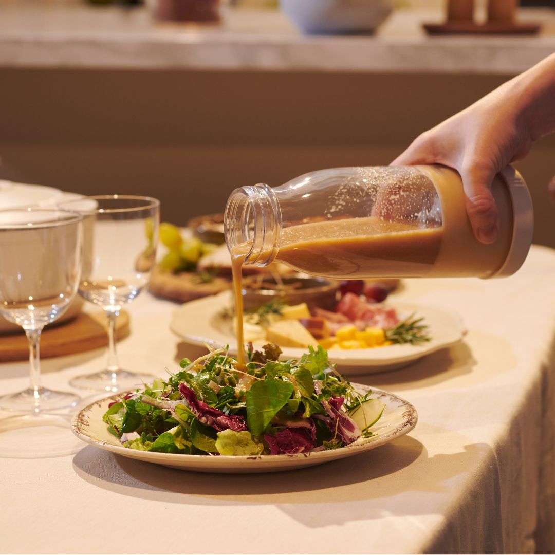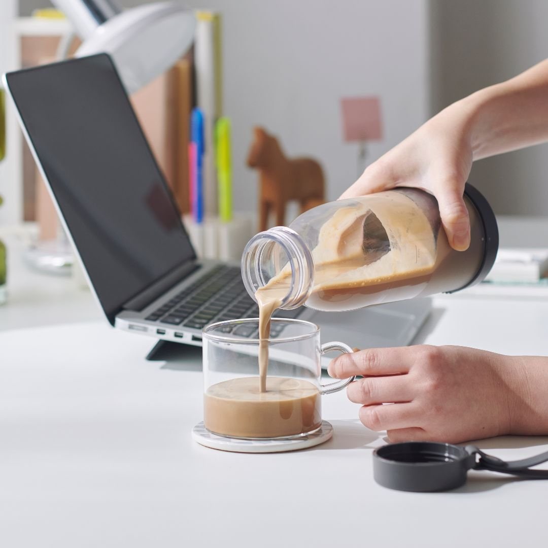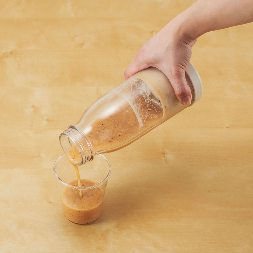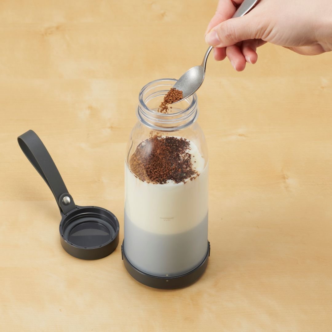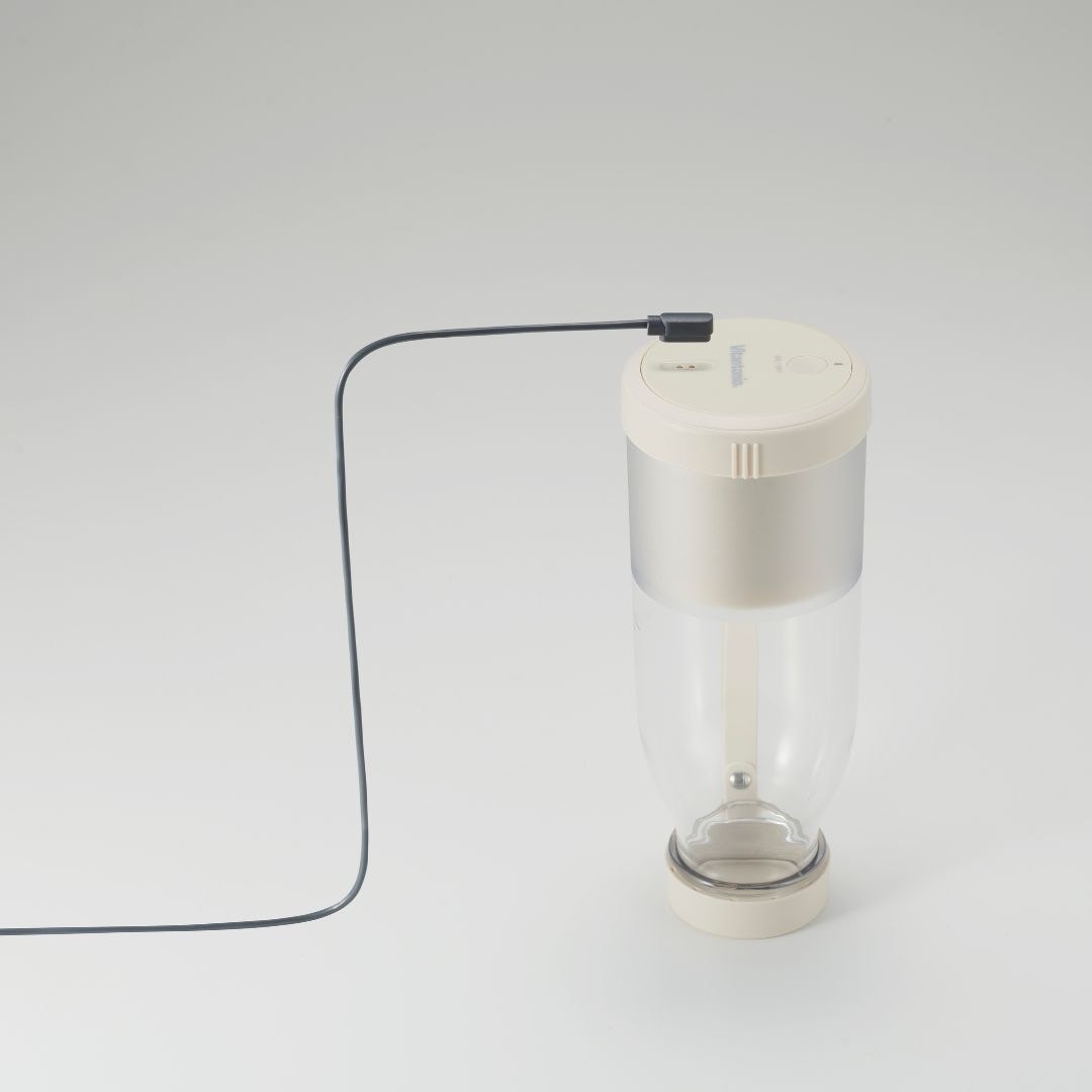 レトロかわいい ミルクボトル型デザイン毎日使うものだから、毎日使いたくなるデザインを。インテリア雑貨のようなレトロかわいい「ミルクボトル型」のコードレスブレンダーです。お好みの野菜やフルーツと水分を入れてブレードをセットし、ボタンを押して逆さにするだけ。3ステップでかんたんにブレンドが可能です。40秒で自動停止するので、つきっきりにならずに済みます。お好みに合わせて選べる、2つのカラーバリエーションカラーは、明るい印象のアイボリー、クールなブラックをご用意しました。どんなキッチンともなじみやすく、持ち歩きにもピッタリなシンプルなカラーリングです。お好みに合わせてお選びいただけます。誤動作を予防する安心設計正しく閉めないと動作しない設計で、かつ2秒長押しで動作する安心設計です。本体とボトルがきちんと閉まっていなくて中身が飛び出してしまったり、持ち歩いている際にバッグの中で誤作動してしまったりなどのトラブルを防ぎます。USB充電式なので、モバイルバッテリーやACアダプターで充電可能。いつでもどこでも新鮮なジュースを楽しむことができます。食材は上下どちらからでも投入OK!調理中にひっくり返して本体を外す手間なく、フタ側からも食材を追加することが可能です。スムージーだけでなく、ドレッシング作りにもおすすめ◎。作りたてのドレッシングをそのままサラダにかけられて、別の容器に移し替えなくても使えるので、洗い物も少なく済みます。※途中で食材を追加する際は、動作(攪拌)を停止させてからフタを開けてください。ギフトにも最適◎レトロかわいいデザインと便利な機能で、ギフトにも最適です。特に健康志向の方や忙しい方へのプレゼントにぴったりです。
