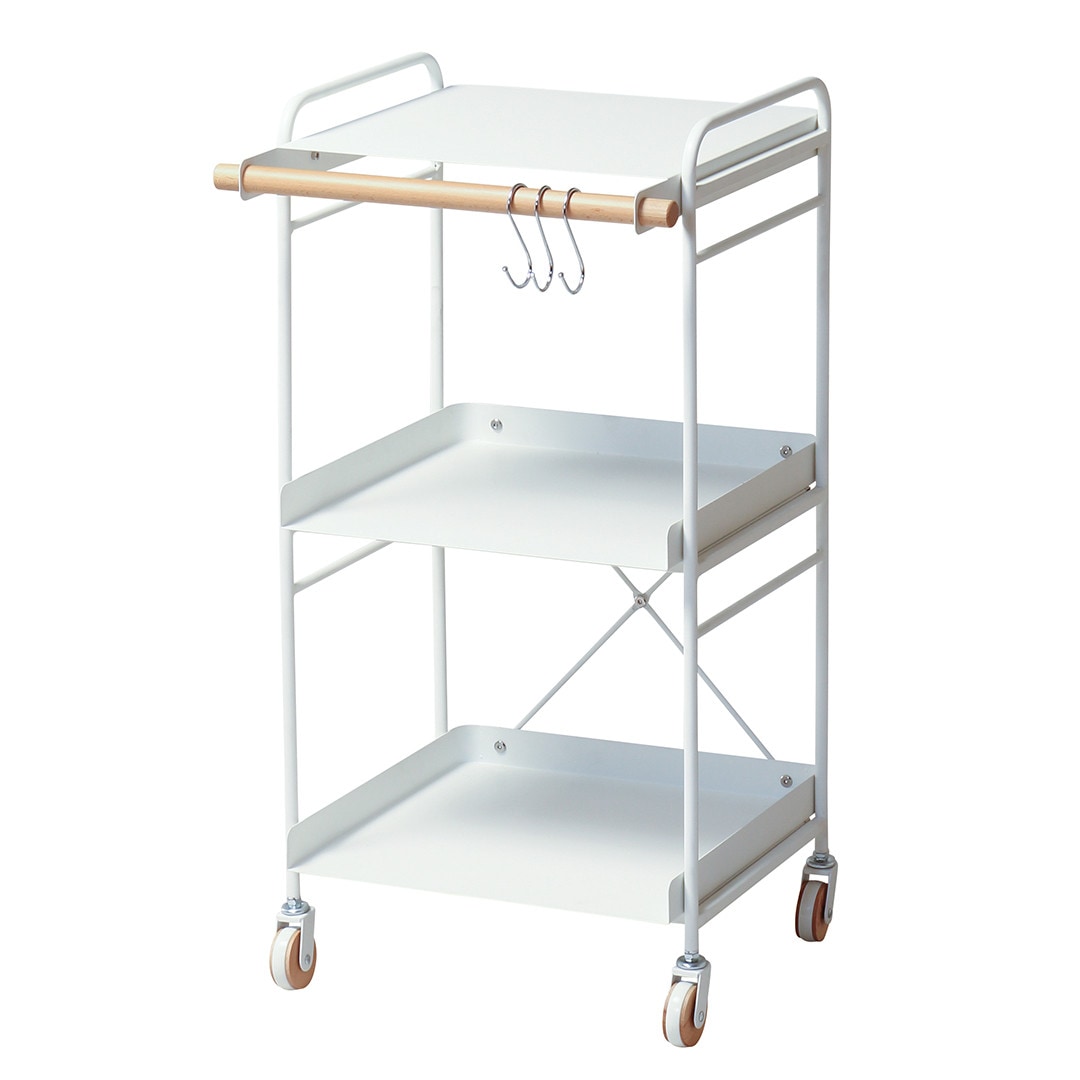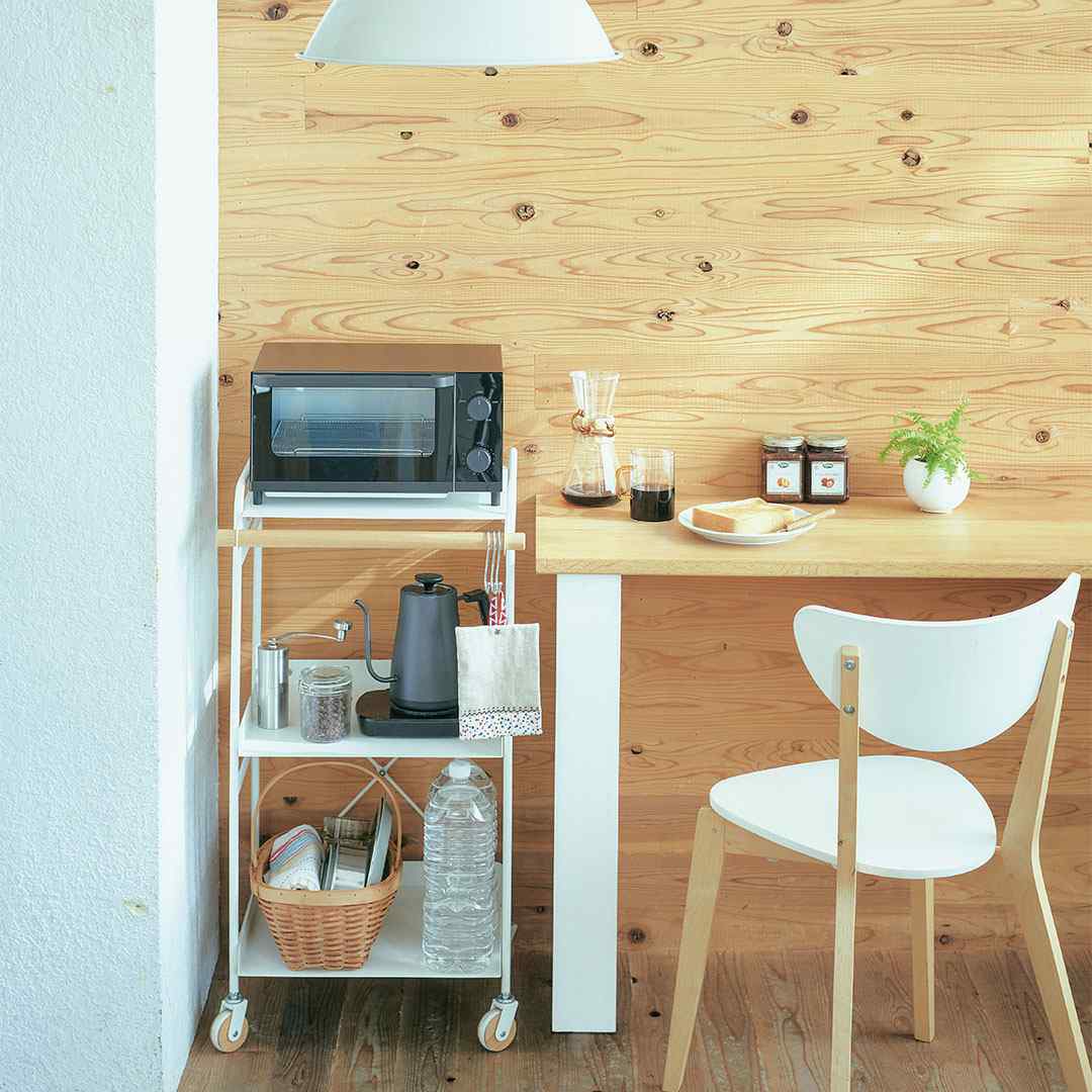 キッチンやダイニングで使える便利なワゴン キッチンやダイニングでは、食器や家電、その他細々としたものがたくさんあります。これらを使い勝手の良いようにワゴンに一つにまとめておくと、日々の料理や食事が楽になります。そこでおすすめなのが、「リヴスチールワゴン」です。トースターや電子レンジなどを置けるよう、耐荷重は棚ごとに5kgとなっています。置き場所に困っているもの、キッチンでもダイニングでも使うことがあるものなどをまとめておくと良いでしょう。キャスターと持ち手付きで自由に設置場所を変えられる こちらワゴンにはキャスターが付いているため、いろいろな場所に移動させたり、置き場所を変えたりすることができます。キャスターが付いているだけでなく、一番上の棚の両側に持ち手が付いているため、この部分を持って移動させれば快適です。少し重たい家電が乗っていても、無理なく動かせるでしょう。棚は全部で3段、一番上の棚正面にはフックをかけられるバーも 棚は全部で3段ついているワゴンなので、家電を置く棚やボトル、瓶などを置く棚、小物をまとめておく収納ケースやバスケットなど、棚ごとにいろいろなものを置くことができます。さらに、一番上の棚の正面には天然木のバーもついています。S字フックをひっかけることで、ミトンや鍋敷き、タオルなども引っかけることができ便利です。側面や背面はものが落ちにくい仕組みになっている 正面にさりげなく付いているバーがアクセントになっているこちらのワゴンは、棚の側面や背面のつくりにもこだわっています。うっかりワゴンの後ろや下にものが落ちてしまわないよう、少し高さのある淵がついているのです。側面にも淵があるため、横からものが落ちるのも予防できます。小さな工夫が、より使いやすくしてくれています。モノトーンカラーがスタイリッシュ 機能性に大満足できる「リヴスチールワゴン」には、モノトーンカラーが登場しています。ホワイトやグレーといったシンプルな色味に天然木のバーがとてもおしゃれで、キッチンやダイニングの空間をすっきりと見せてくれます。