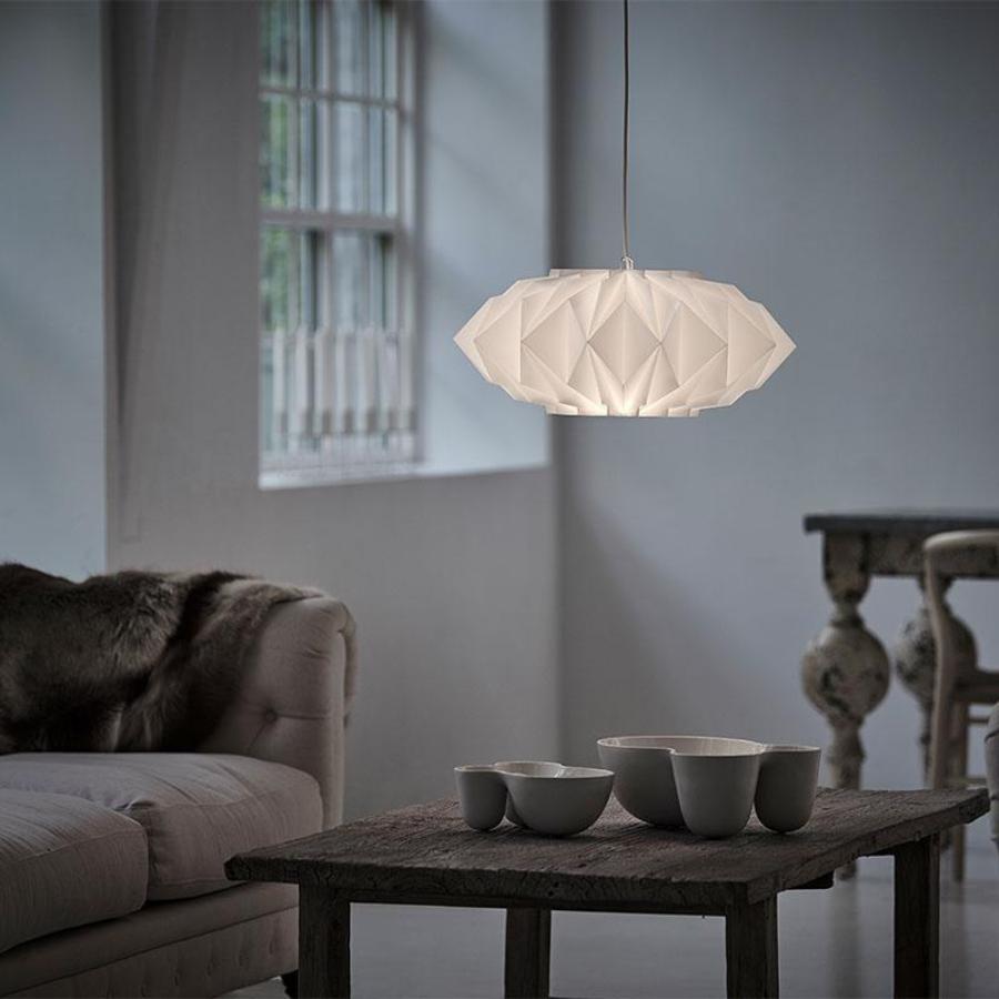クリスタルという別名を持つ軽やかで明快、かつシンプルなペンダントランプです。日本の折り紙をヒントにオイルランプのあかりを調節するためのシェードが特徴です。