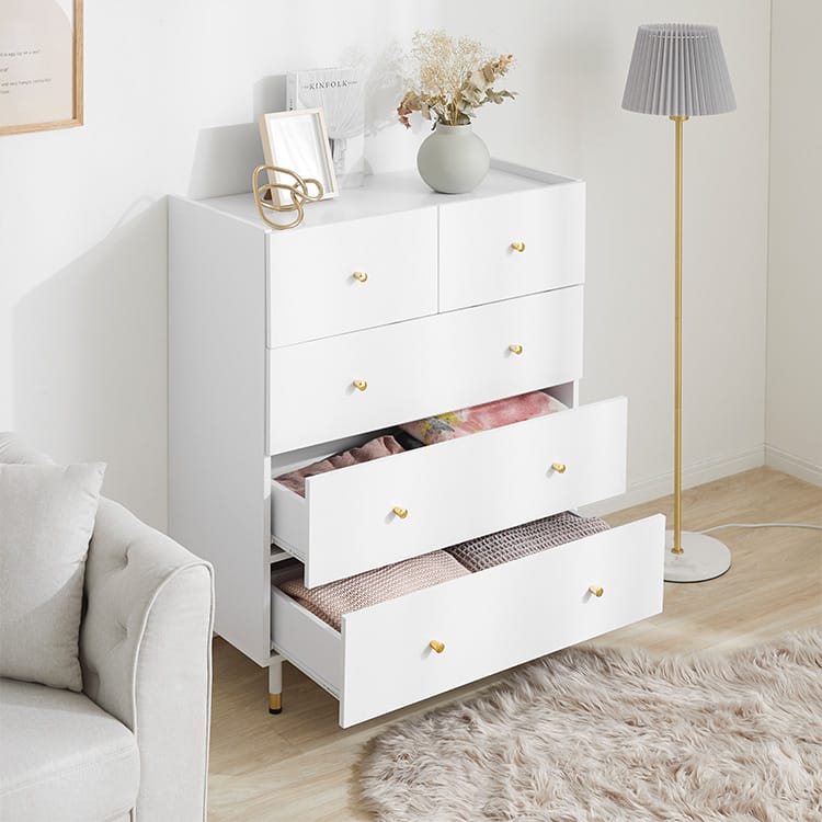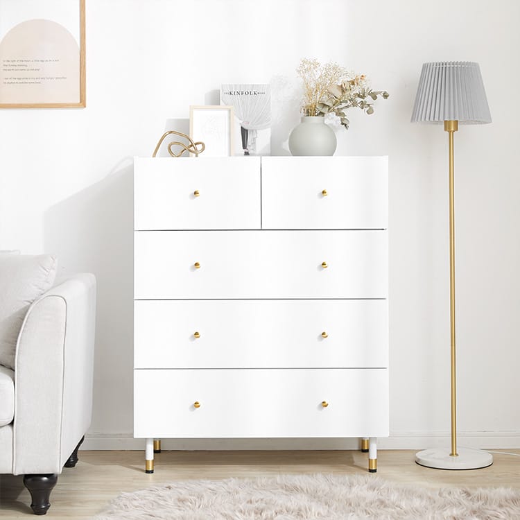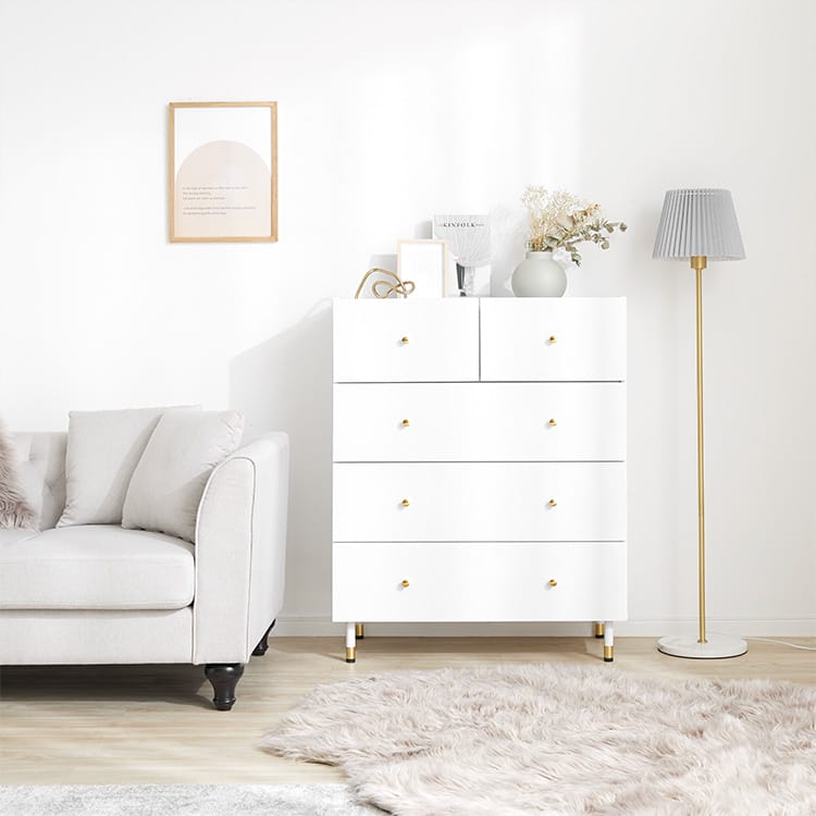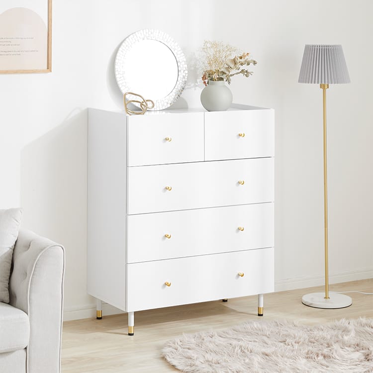 扉付き収納に引き出しを組み合わせた4段チェスト。引き出しだけのチェストより、自由度の高い収納スペースとして活躍します。こちらは当社デザイナーが独自のこだわりをもって完成させたオリジナル商品です。甘くなりすぎない、大人っぽさのあるお部屋をつくります。シンプルでありながら、洗練されたホワイト×ゴールドの組み合わせ!ホワイトにゴールドを取り入れることで、お部屋を高級感のある雰囲気に演出します。ベーシックなホワイトはどんなテイストにも馴染みやすく、合わせやすいカラー。お部屋全体をパッと明るくしてくれます。