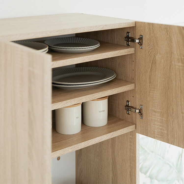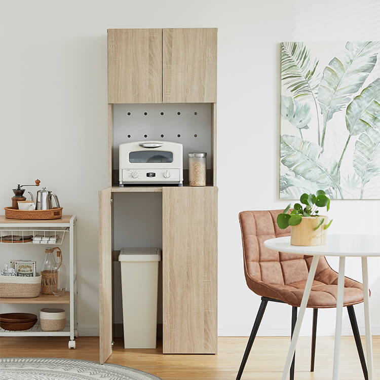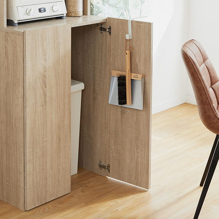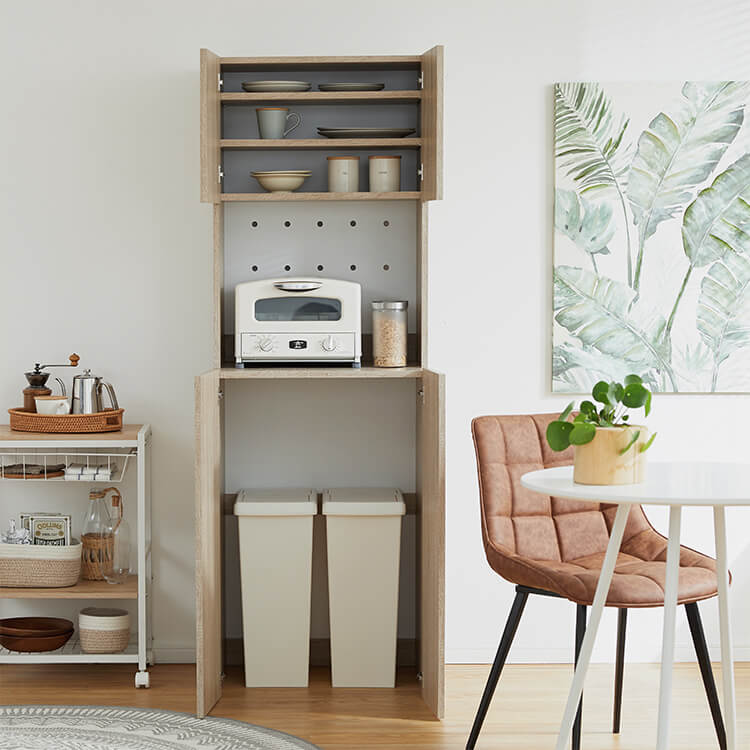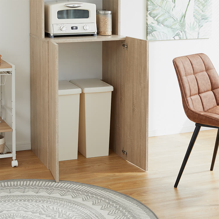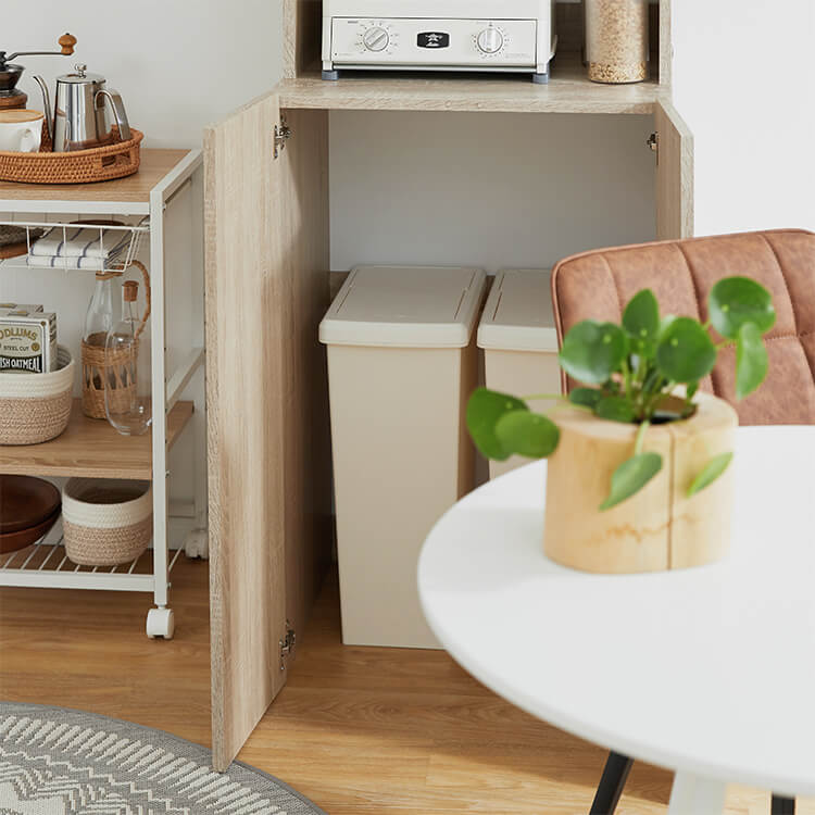ごみ箱を隠しデットスペースさえも有効活用する、ありそうでなかったキッチン収納。生活感漂うごみ箱を収納して、憧れのインテリアへ近づいてみませんか?大容量の収納力と、取っ手を無くした無駄のないシンプルさが、より木目調を引き立ててくれるデザインに!お部屋にも馴染みやすく、落ち着いた印象をプラスしてくれます。お皿に、家電に、ごみ箱に!?扉付きの隠す収納と使い勝手の良いオープン収納とが合わさった、大容量の収納スペース。いつも使うキッチン周りをスッキリ片付けます。入れる物に合わせて好みの高さに調節が可能な、3段の可動棚スペース。よく使う小さなお皿から大きなお皿まで、幅広い物の収納にオススメです。