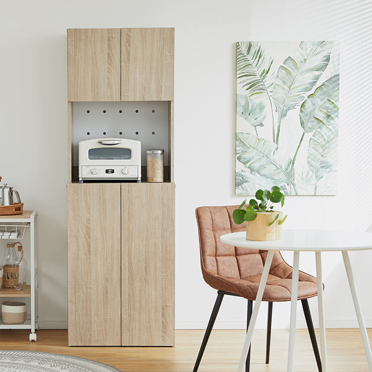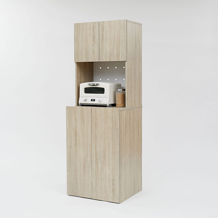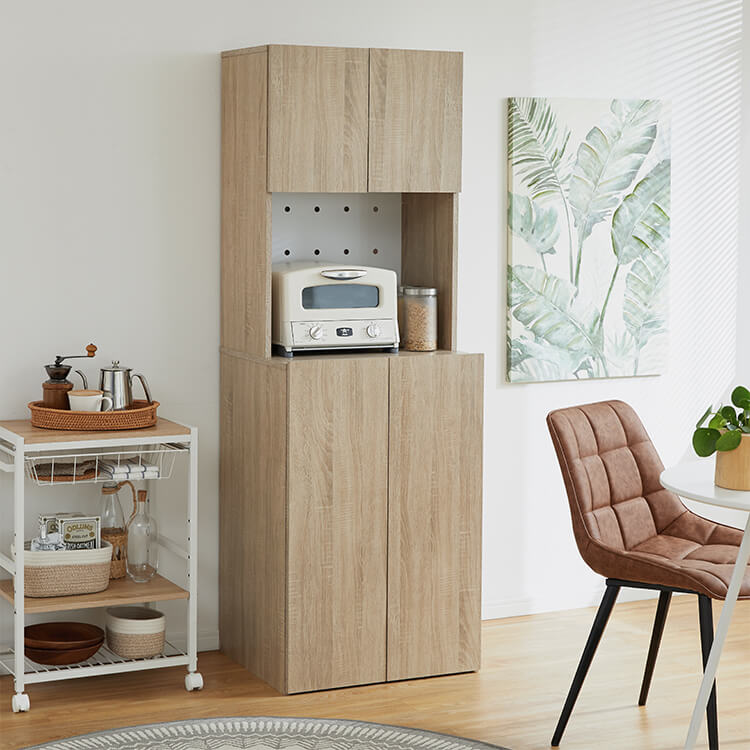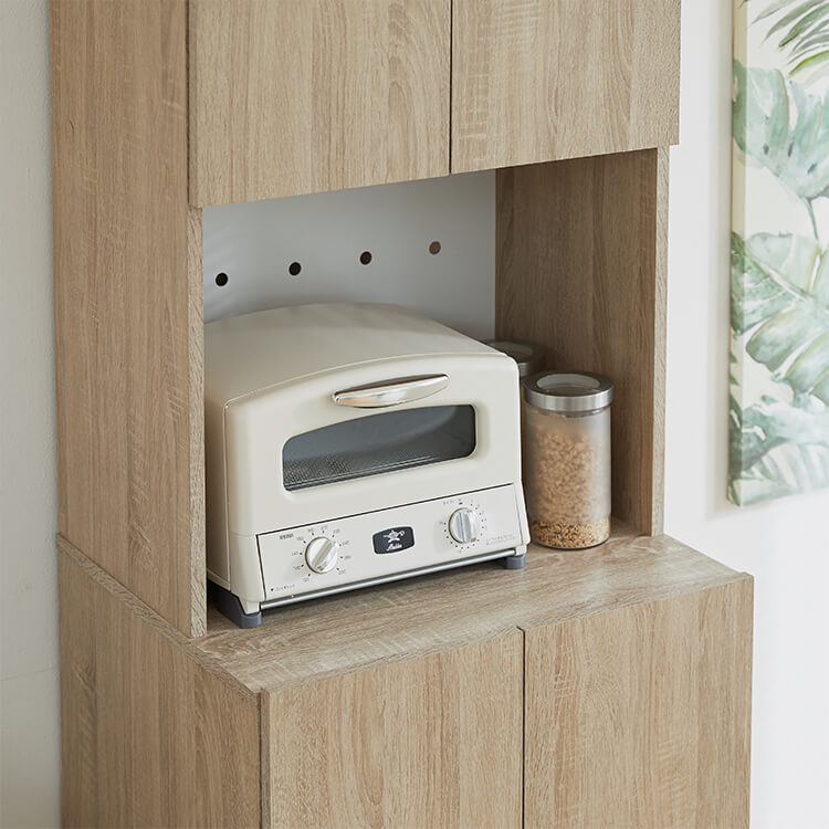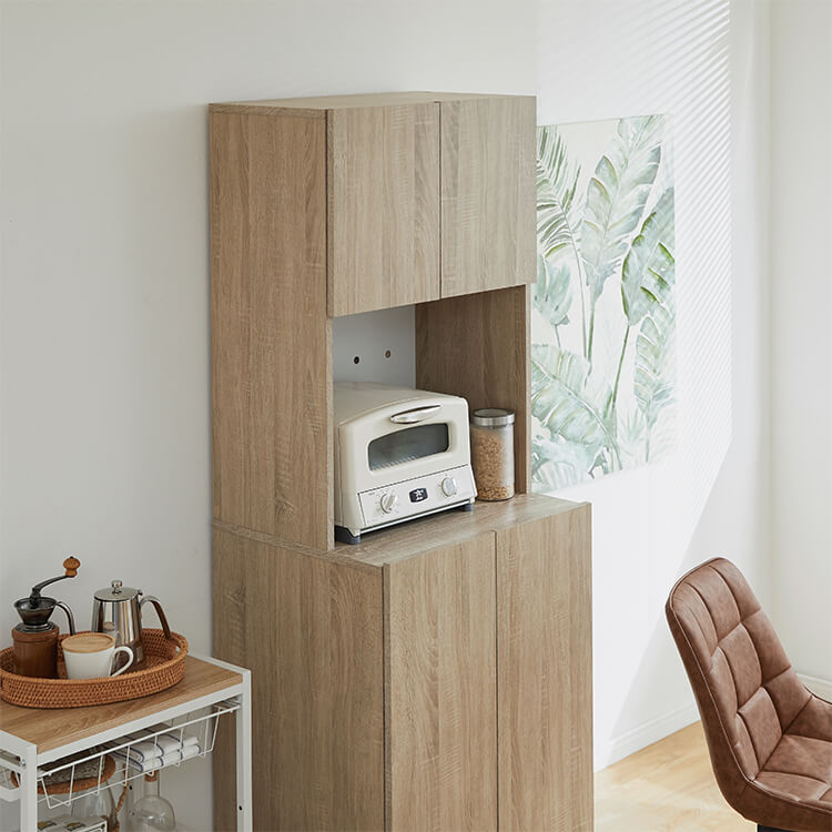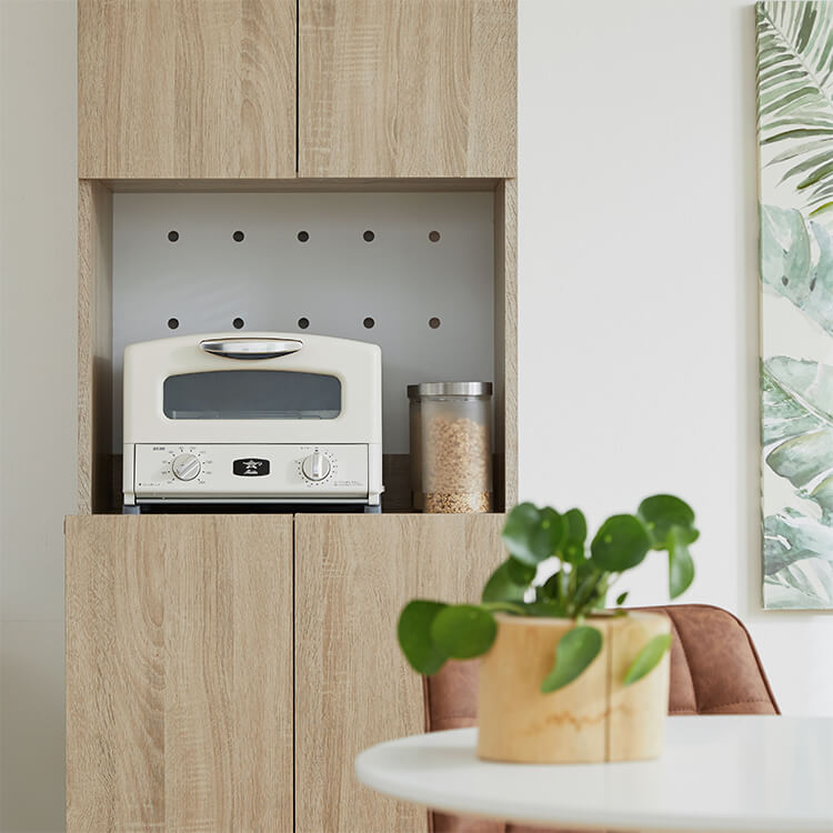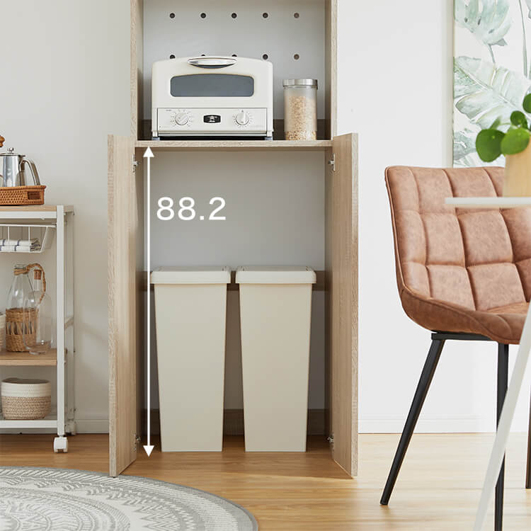ごみ箱を隠しデットスペースさえも有効活用する、ありそうでなかったキッチン収納。生活感漂うごみ箱を収納して、憧れのインテリアへ近づいてみませんか?大容量の収納力と、取っ手を無くした無駄のないシンプルさが、より木目調を引き立ててくれるデザインに!お部屋にも馴染みやすく、落ち着いた印象をプラスしてくれます。お皿に、家電に、ごみ箱に!?扉付きの隠す収納と使い勝手の良いオープン収納とが合わさった、大容量の収納スペース。いつも使うキッチン周りをスッキリ片付けます。入れる物に合わせて好みの高さに調節が可能な、3段の可動棚スペース。よく使う小さなお皿から大きなお皿まで、幅広い物の収納にオススメです。