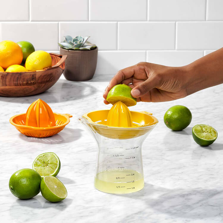 レモンやライムに便利な小さい絞り器と、オレンジやグレープフルーツにピッタリな大きい搾り器の2種類で効率よく簡単に搾ることができるジューサーです。「より多くの人にとって使いやすいデザイン」を意味するユニバーサルデザイン。男女問わず、お年寄りから子供まで、右利きでも左利きでも簡単に使える製品を作るアメリカのブランドです。種や皮が落ちにくい仕様に。絞った後は注ぎ口から果汁をそのまま注ぐだけです。本体容器は、くびれがあり、握りやすく力を入れやすい形状になっています。軽量なのも嬉しいポイントです。