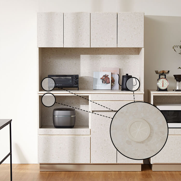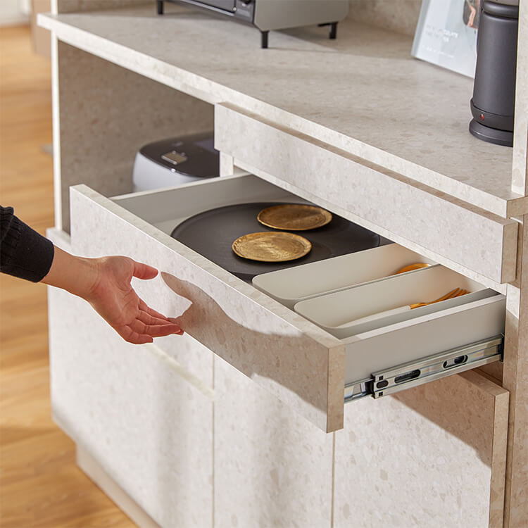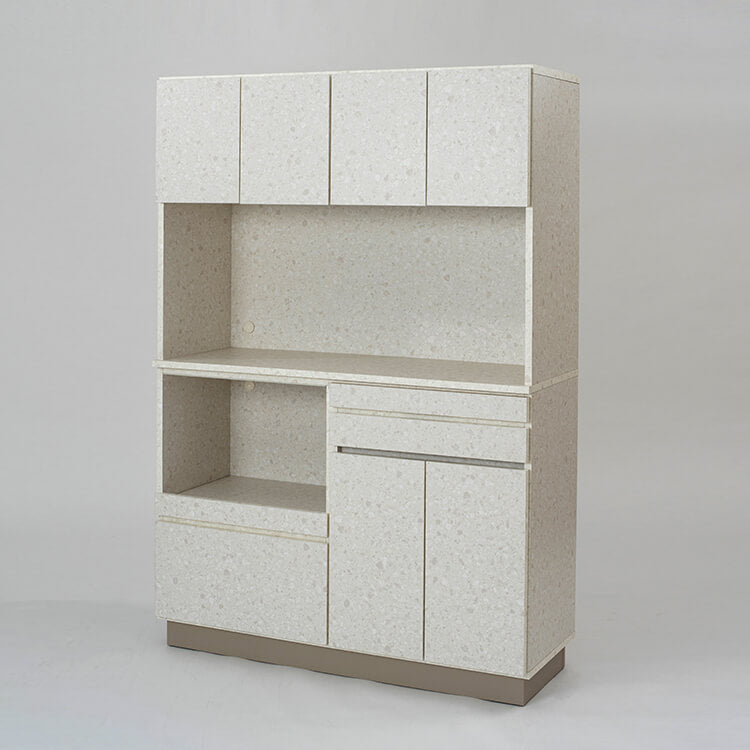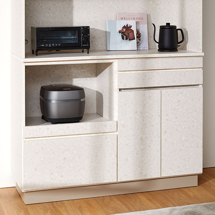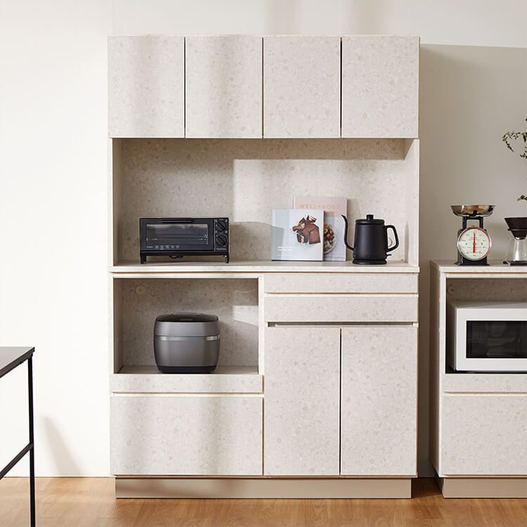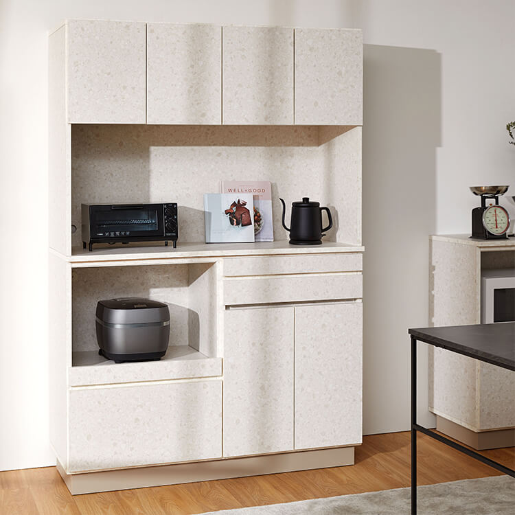 「海外インテリアに憧れるけど、お部屋に合うかわからない……」という方にオススメの、洗練された美しいテラゾー柄キッチンボード。お部屋に置くだけで雰囲気がガラッと変わり、落ち着きのある海外風インテリアが叶います。大理石柄ほど主張しすぎず、色と柄で様々な表情を見せるテラゾー柄シリーズ。海外インテリアのトレンド感を漂わせつつ、お部屋をセンスアップしてくれます。LOWYAオリジナル!細かな石をランダムに散りばめたような風合いで、やわらかな雰囲気を感じさせるワントーンのテラゾー柄。上品でこなれた印象をプラスしてくれます。シリーズで揃えるのもオススメです。テラゾーとは、イタリアの発祥と言われており、アールデコやモダニズムの潮流に乗って使われてきた素材です。最近では建売住宅などに使用されており、目に触れる機会が増えてきています。