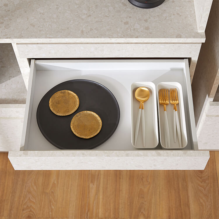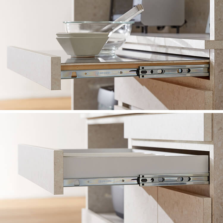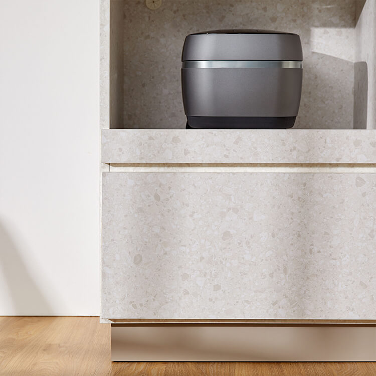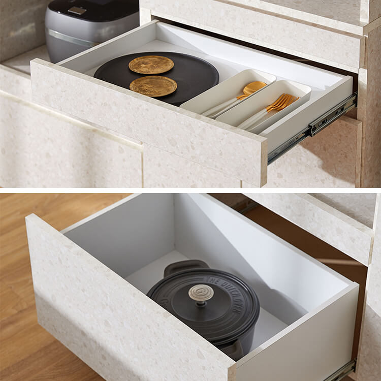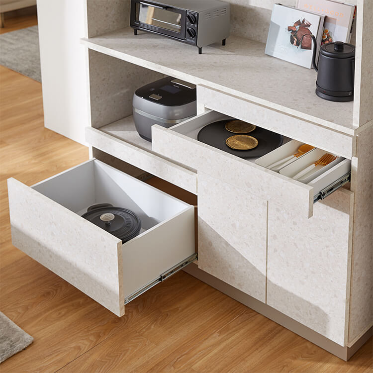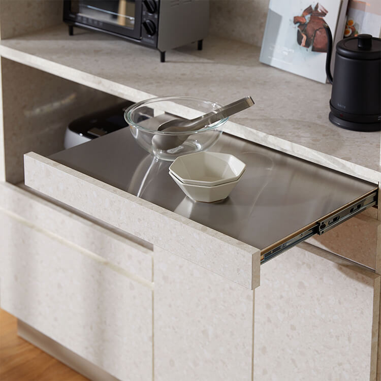 「海外インテリアに憧れるけど、お部屋に合うかわからない……」という方にオススメの、洗練された美しいテラゾー柄キッチンボード。お部屋に置くだけで雰囲気がガラッと変わり、落ち着きのある海外風インテリアが叶います。大理石柄ほど主張しすぎず、色と柄で様々な表情を見せるテラゾー柄シリーズ。海外インテリアのトレンド感を漂わせつつ、お部屋をセンスアップしてくれます。LOWYAオリジナル!細かな石をランダムに散りばめたような風合いで、やわらかな雰囲気を感じさせるワントーンのテラゾー柄。上品でこなれた印象をプラスしてくれます。シリーズで揃えるのもオススメです。テラゾーとは、イタリアの発祥と言われており、アールデコやモダニズムの潮流に乗って使われてきた素材です。最近では建売住宅などに使用されており、目に触れる機会が増えてきています。
