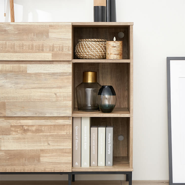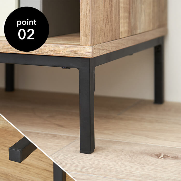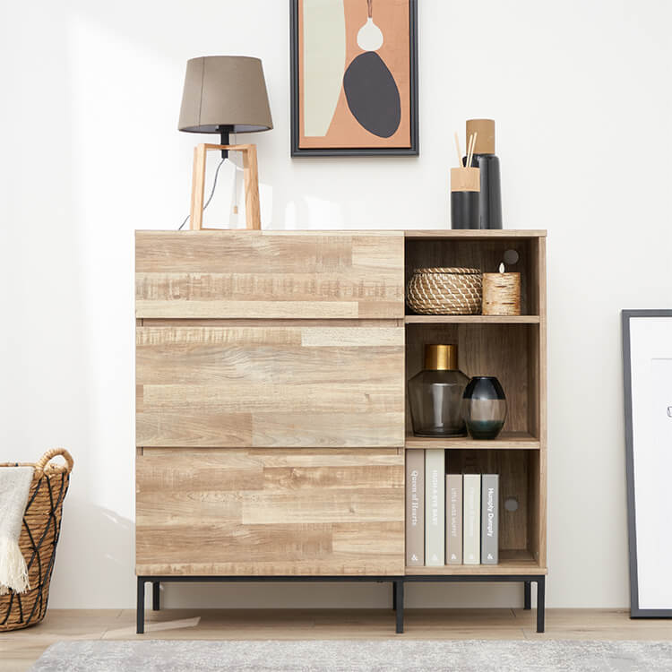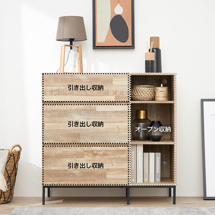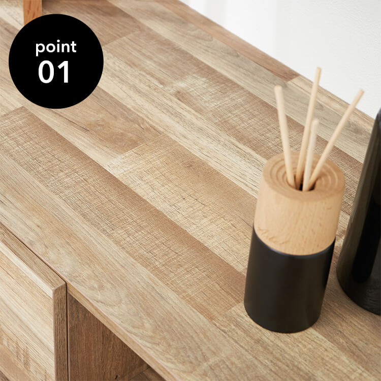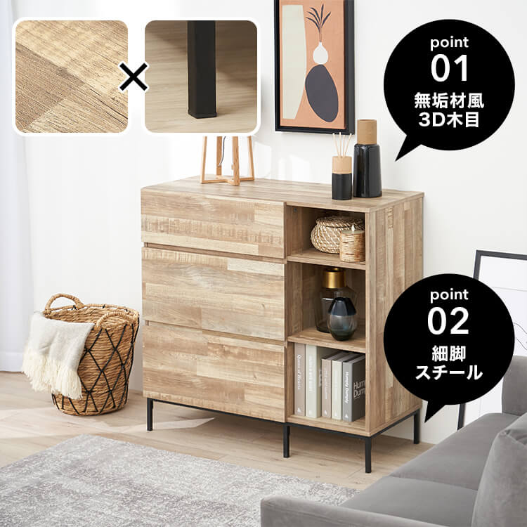 無垢材風の3Dペーパーと細脚スチールの異素材MIXで仕上げ、デザイン性と機能性にこだわったサイドキャビネット[幅90]です。リビング周りを洗練された落ち着きある空間に魅せてくれます。天然木のような優しい手触りで、まるで本物のような質感が楽しめる木目調と、細脚スチールの異素材MIX感が全体の雰囲気を高めてくれます。お部屋に合わせやすく、人とは違うモノを。無垢材風の表面材と細脚スチールの異素材を組み合わせることで、こなれた雰囲気に。置くだけでセンスの良い空間が完成します。本物の無垢材のような手触りの3Dペーパーを使用。3Dペーパーとは、木目に合わせてざらざらと凹凸があるのが特徴です。