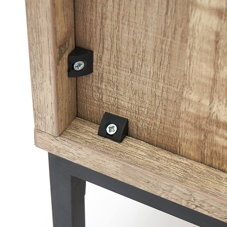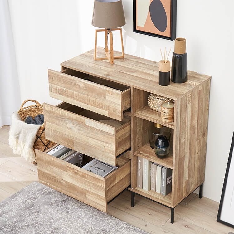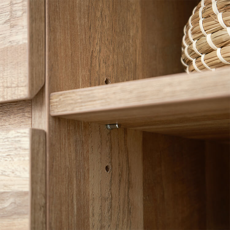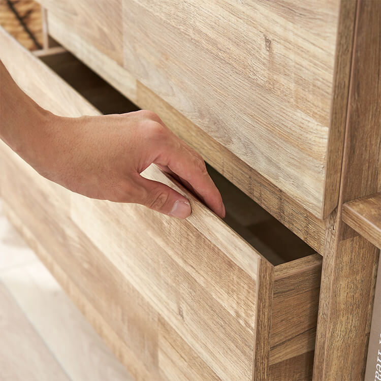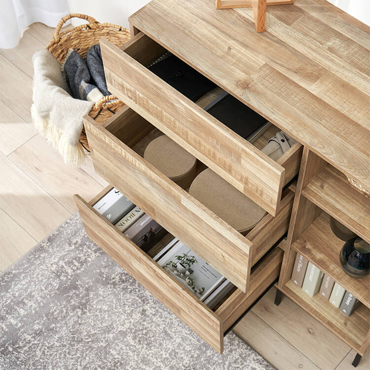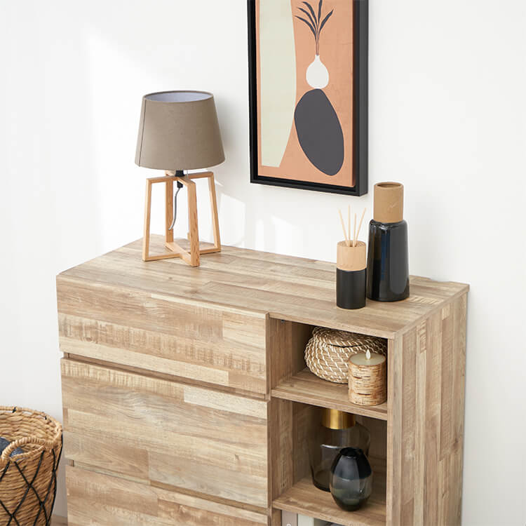 無垢材風の3Dペーパーと細脚スチールの異素材MIXで仕上げ、デザイン性と機能性にこだわったサイドキャビネット[幅90]です。リビング周りを洗練された落ち着きある空間に魅せてくれます。天然木のような優しい手触りで、まるで本物のような質感が楽しめる木目調と、細脚スチールの異素材MIX感が全体の雰囲気を高めてくれます。お部屋に合わせやすく、人とは違うモノを。無垢材風の表面材と細脚スチールの異素材を組み合わせることで、こなれた雰囲気に。置くだけでセンスの良い空間が完成します。本物の無垢材のような手触りの3Dペーパーを使用。3Dペーパーとは、木目に合わせてざらざらと凹凸があるのが特徴です。