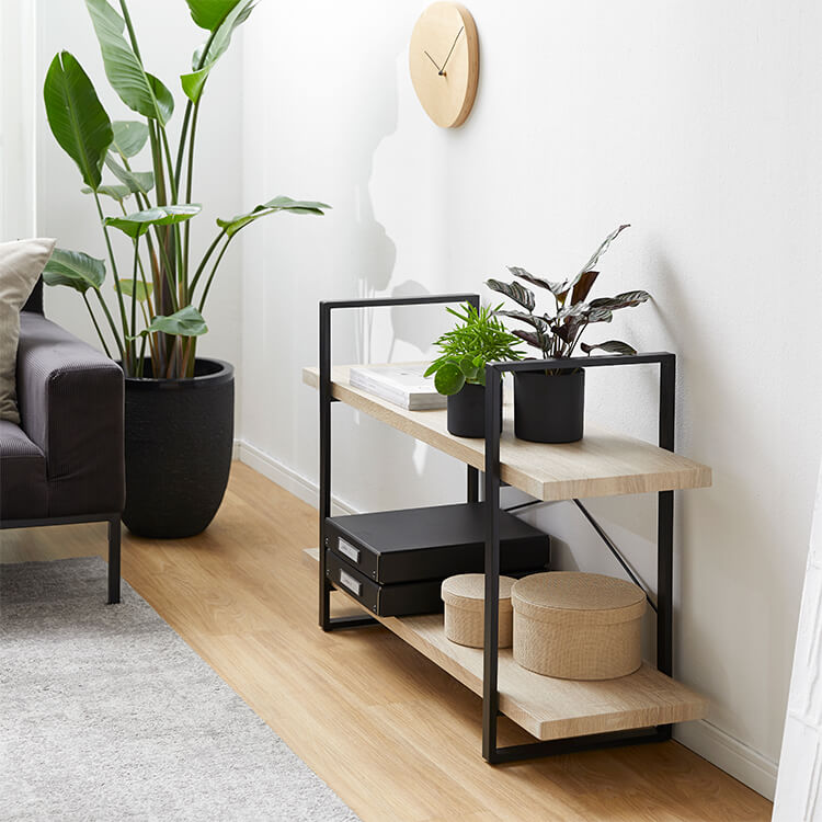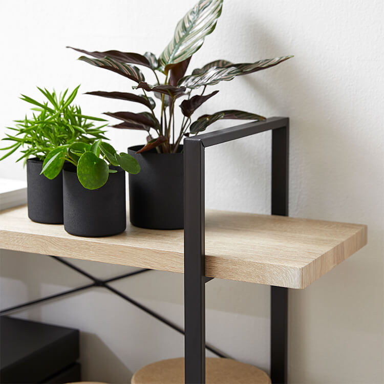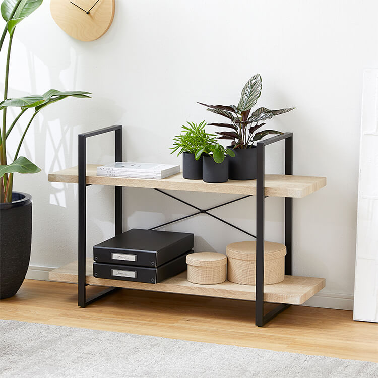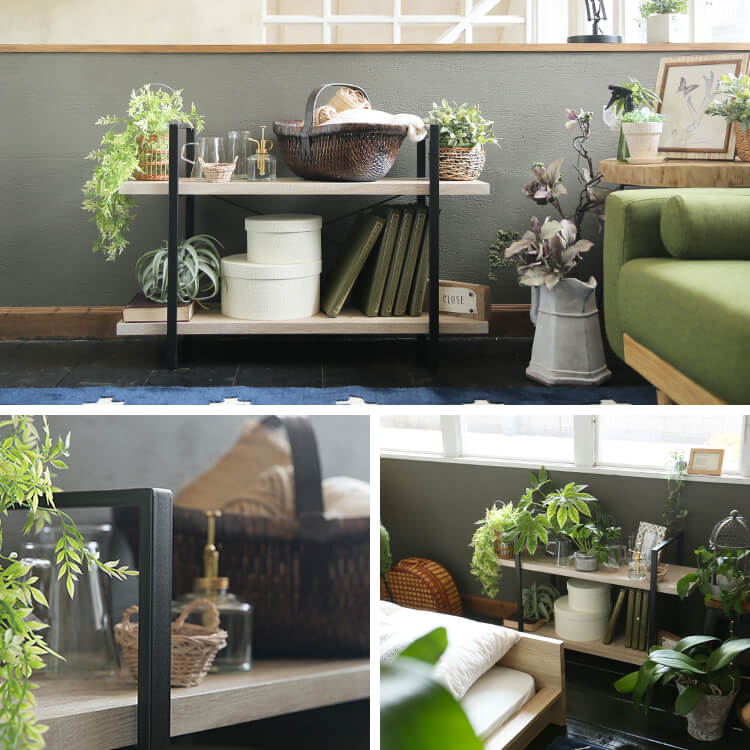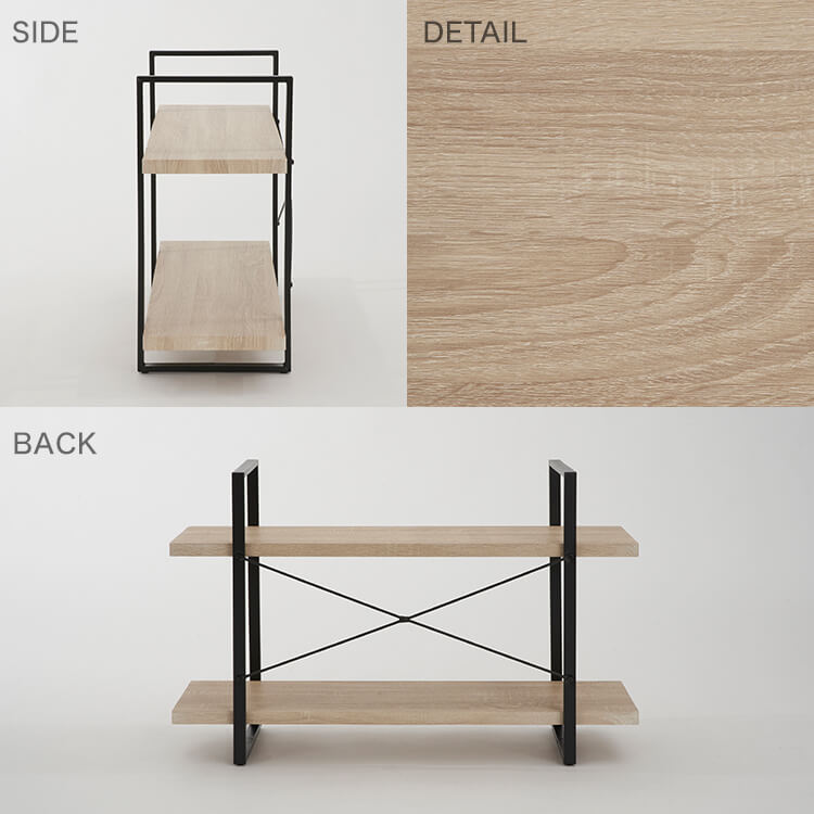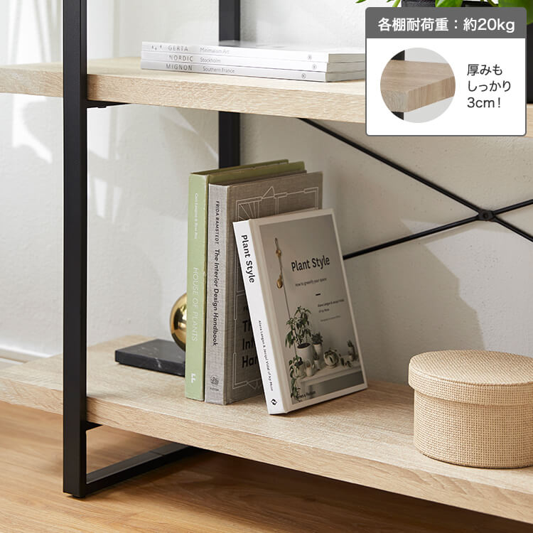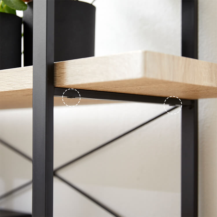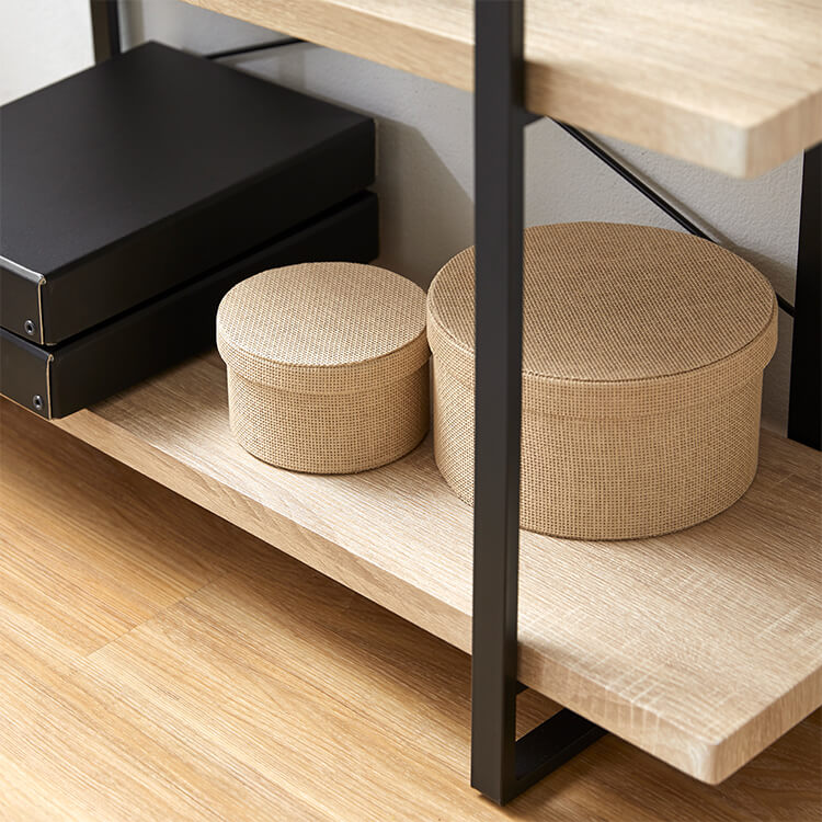 黒いスチールと木目調を組み合わせた、ナチュラルモダンなオープンシェルフ。お気に入りのアイテムを置くだけで、こだわりのディスプレイスペースが完成!シンプルデザインだからこそ、自分らしさが映えるスペースをつくれます◎マットな質感のスチールとナチュラルな木目調の異素材が織りなす、おしゃれなナチュラルモダンテイスト。お部屋にあるだけで、グッとセンスアップした空間を演出します!リアルな木目調がポイント!棚には天然の木目を連想させるナチュラルな色と柄を施し、凹凸がある触り心地にもこだわりました。デザイン性を高めるため、スチール部分を、少し内側に設計し、バランスにこだわりました。表面にはマットな質感が美しい塗装を施しています。シンプルでありながらも、おしゃれなアクセントに!