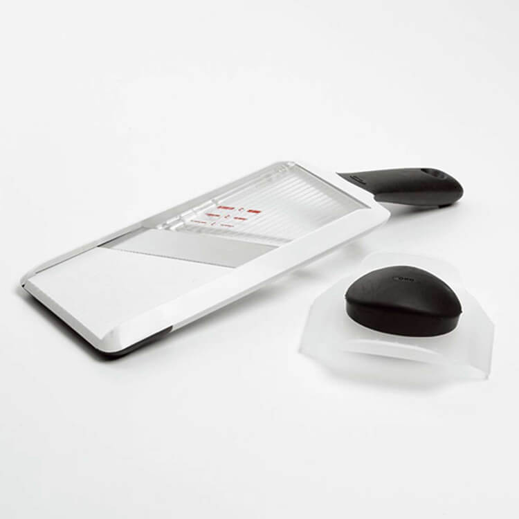 きゅうりのサラダやアップルパイ、ポテトグラタンを作る時に便利なハンディスライサーです。「より多くの人にとって使いやすいデザイン」を意味するユニバーサルデザイン。男女問わず、お年寄りから子供まで、右利きでも左利きでも簡単に使える製品を作るアメリカのブランドです。3段階に厚さを調整でき、食材をステンレスの刃にスライドさせれば、きれいな均一のスライスができます。使用しないときには刃をロックでき、プロテクターでカバーもできます。