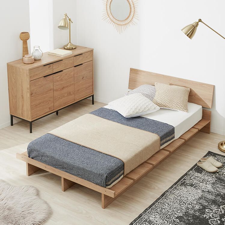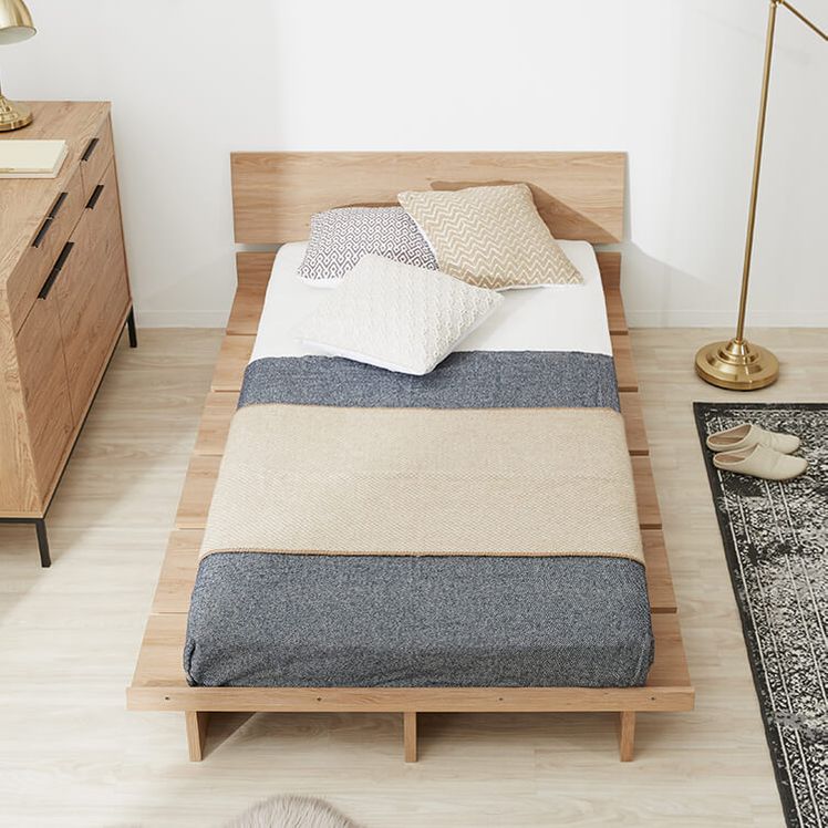 優しい木目調がお部屋を心安らぐナチュラルムードに染め上げるベッドフレームです。シンプルで飽きの来ないデザインは、北欧のモノづくりの心から学び、冬の長い間をおうちで過ごす北欧では、毎日使う家具に飽きが来ないよう、無駄のないシンプルな家具を生み出しました。