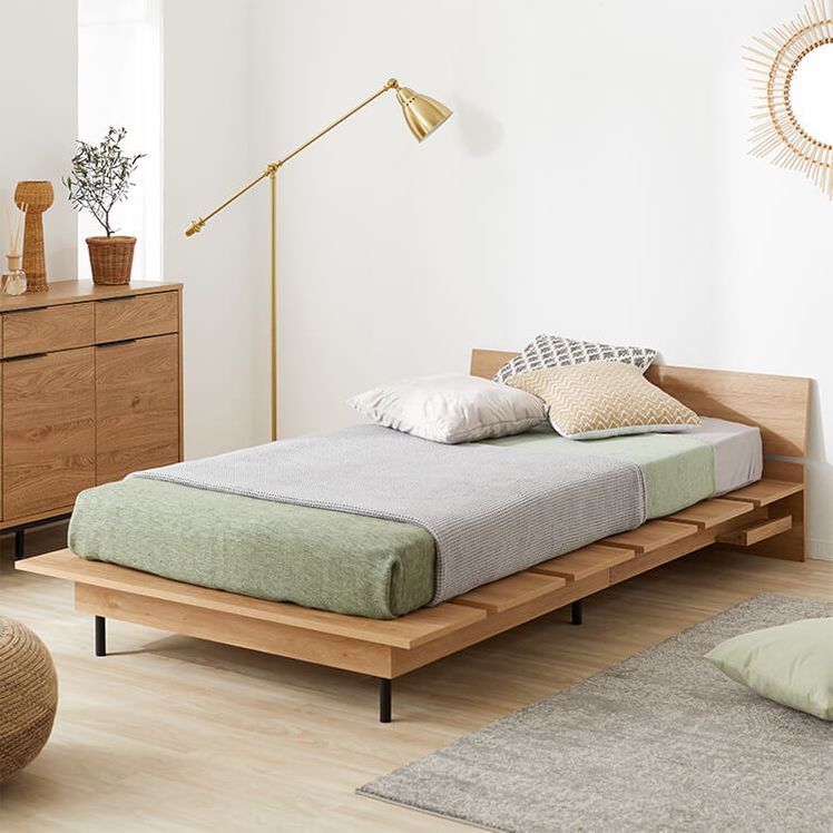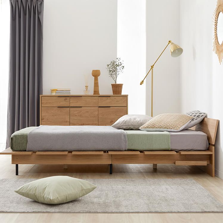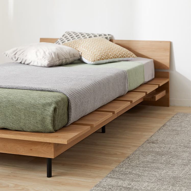 お部屋のスタイルを選ばない木目柄×スチールの組み合わせのローベッドフレームです。2つの異素材が生み出す落ち着いた雰囲気が、空間をさらにスタイリッシュで居心地の良いお部屋にしてくれます。狭く窮屈な印象になりがちな寝室も、ベッドの高さを低くすることで天井が高く見え、ゆとりある空間を演出することができます。