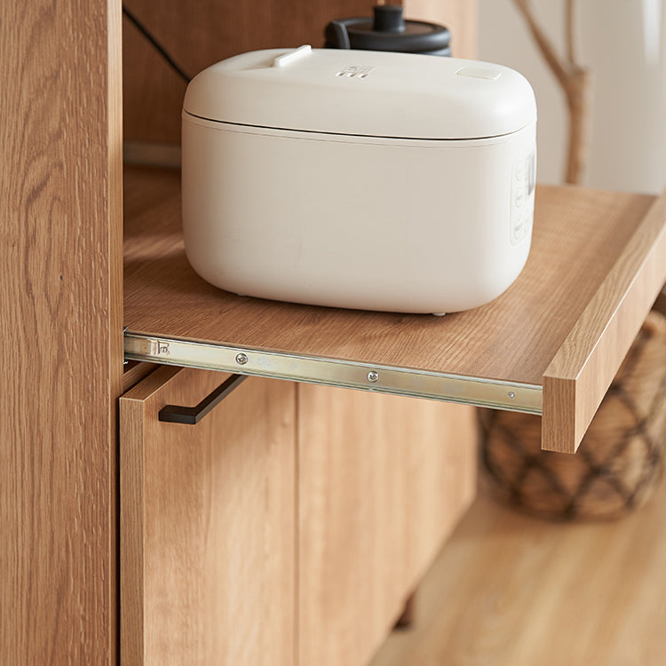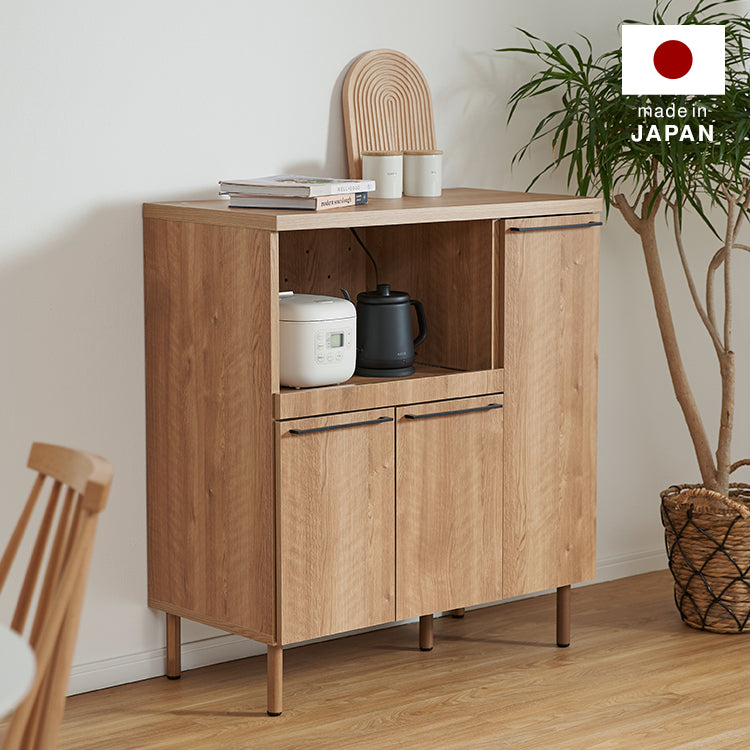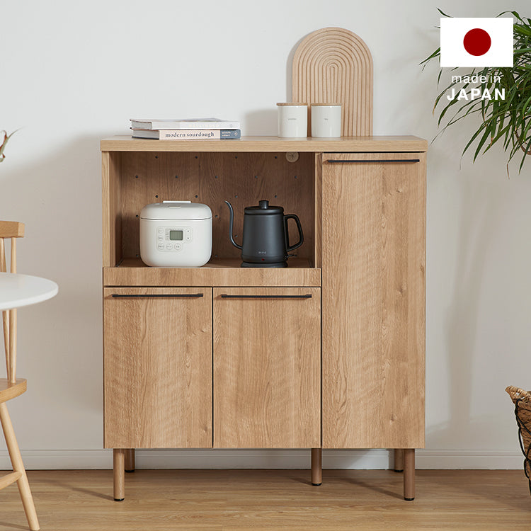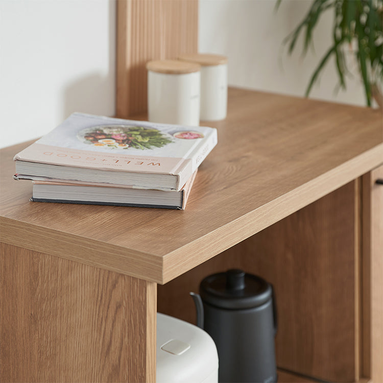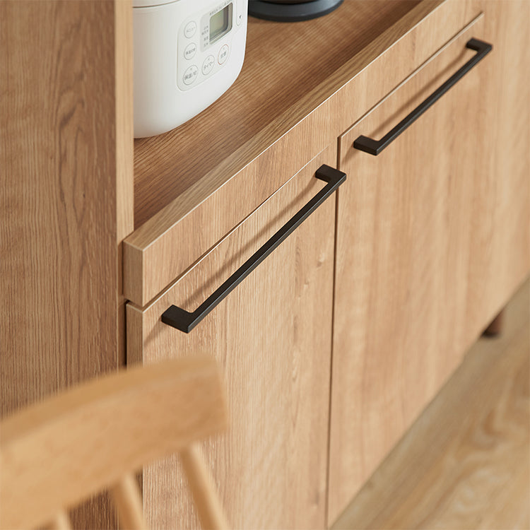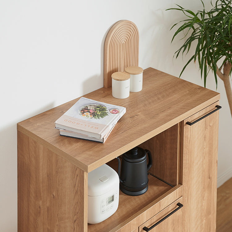 リアルな木目調とシンプルなデザインが、キッチンをオシャレに演出してくれる日本製キッチンカウンター。収納力と使いやすさを考えたハイタイプ設計が魅力です。このハイカウンターの高さは約100cm。キッチンカウンターをハイタイプにすることで、一般的なカウンターよりも天板下の収納スペースが広くなり、電子レンジなどの家電もかがまずに扱いやすくなります。木目調の質感を遮らないよう、シンプルなデザインに仕上げました。ヴィンテージテイストの取っ手が、さりげないアクセントになり全体の雰囲気を引き締めてくれます。家電製品や食器類、食材ストックなど、キッチンには沢山のものがあふれがち。すっきりキレイに見せられるように、充実の収納スペースを設けました。