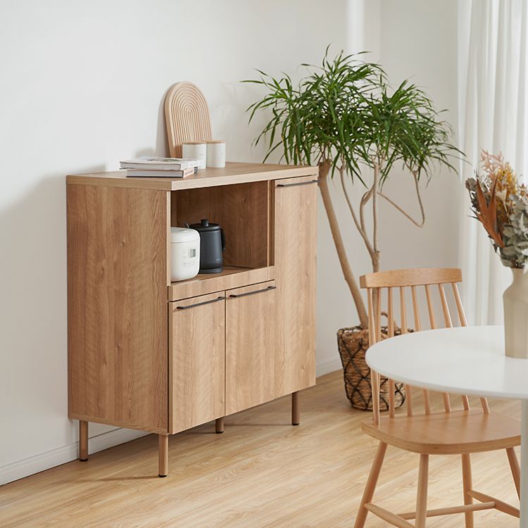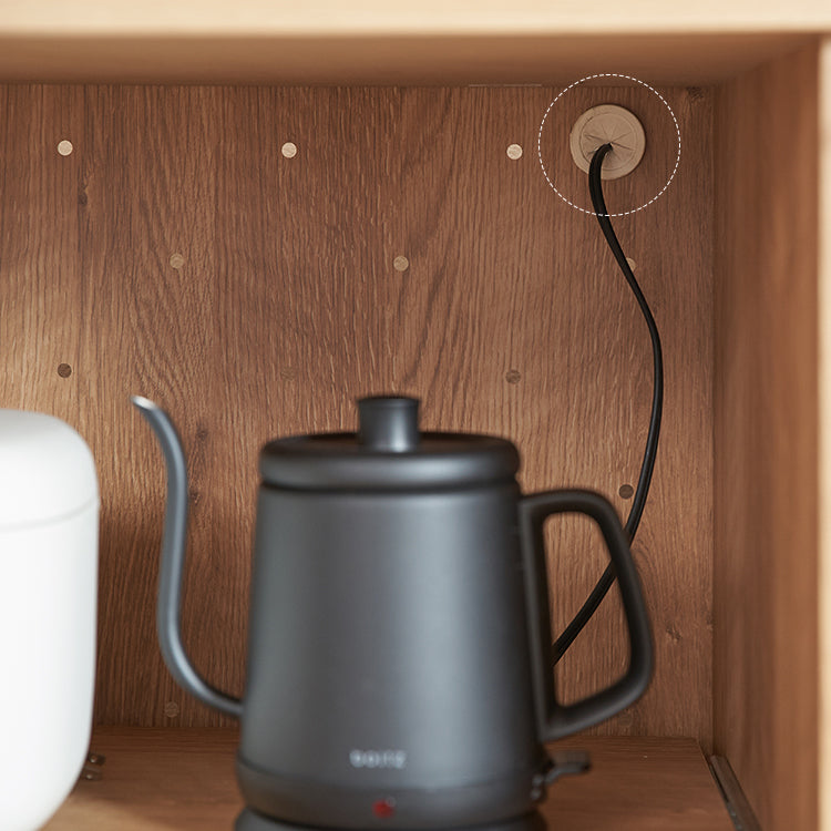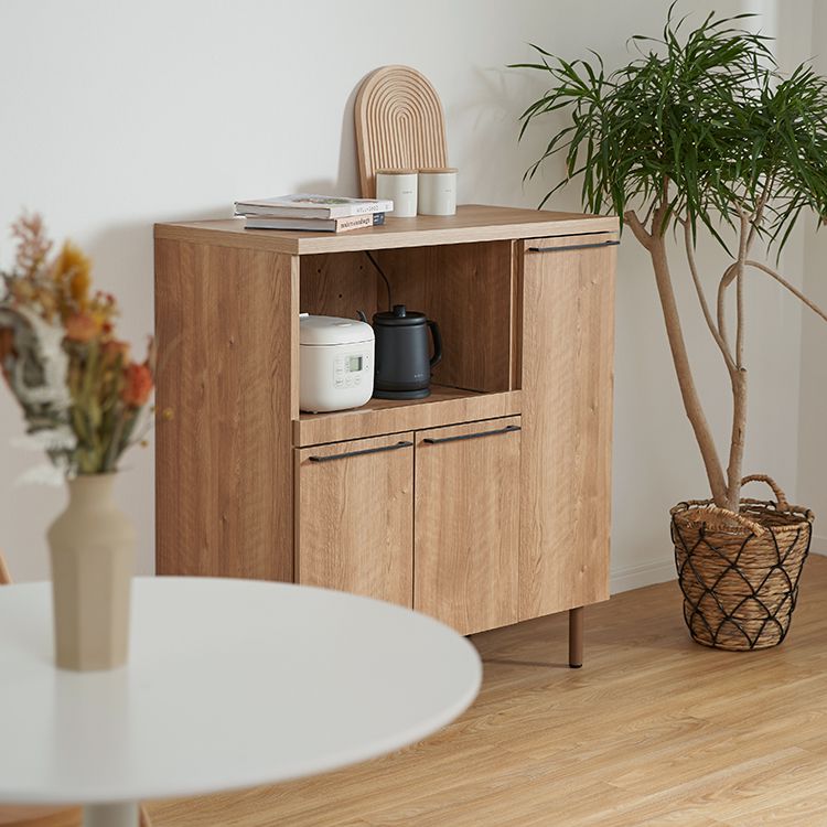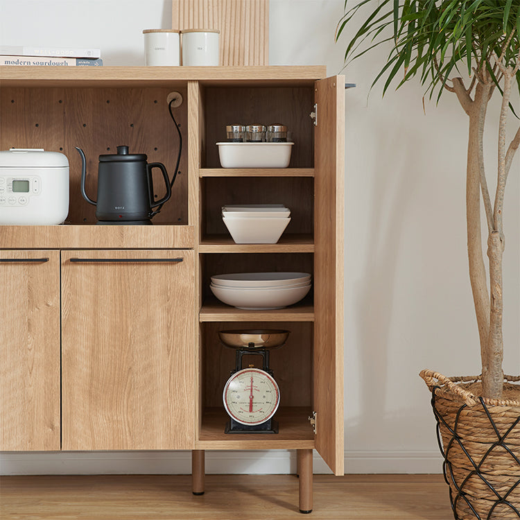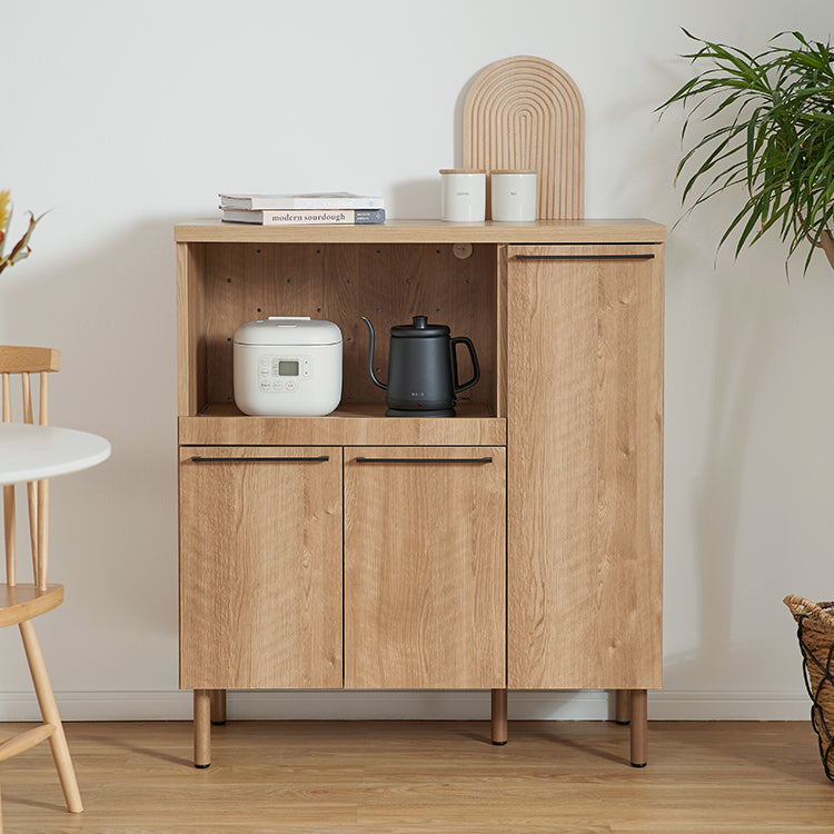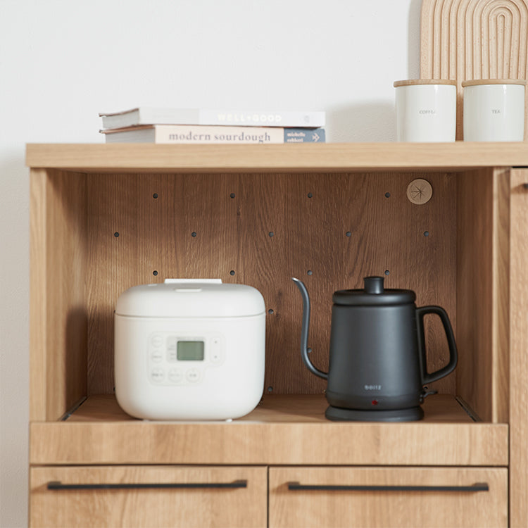 リアルな木目調とシンプルなデザインが、キッチンをオシャレに演出してくれる日本製キッチンカウンター。収納力と使いやすさを考えたハイタイプ設計が魅力です。このハイカウンターの高さは約100cm。キッチンカウンターをハイタイプにすることで、一般的なカウンターよりも天板下の収納スペースが広くなり、電子レンジなどの家電もかがまずに扱いやすくなります。木目調の質感を遮らないよう、シンプルなデザインに仕上げました。ヴィンテージテイストの取っ手が、さりげないアクセントになり全体の雰囲気を引き締めてくれます。家電製品や食器類、食材ストックなど、キッチンには沢山のものがあふれがち。すっきりキレイに見せられるように、充実の収納スペースを設けました。