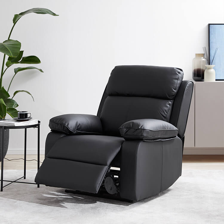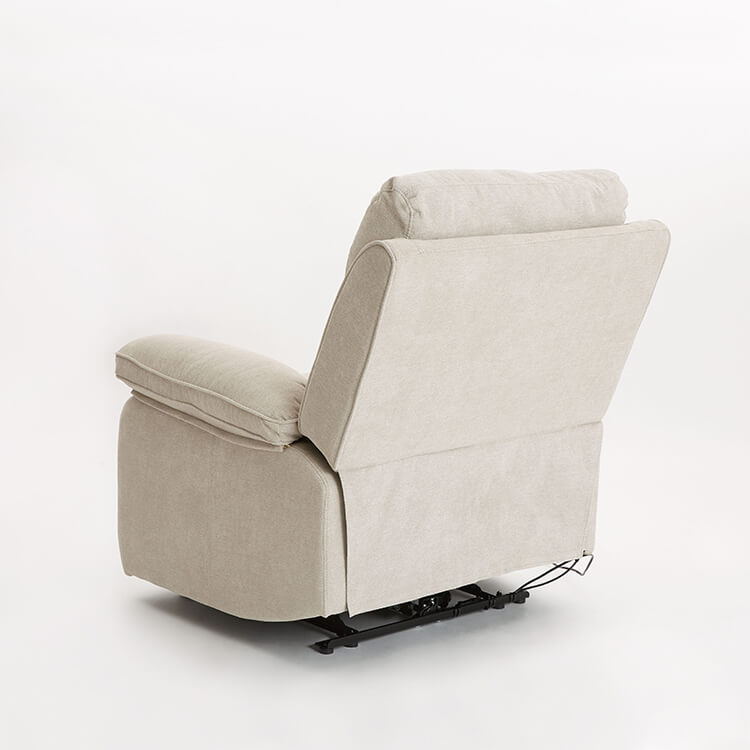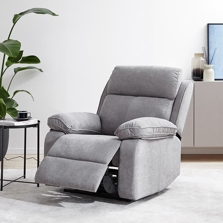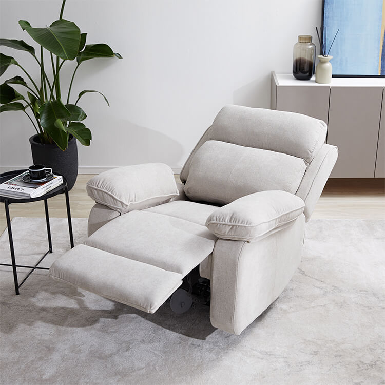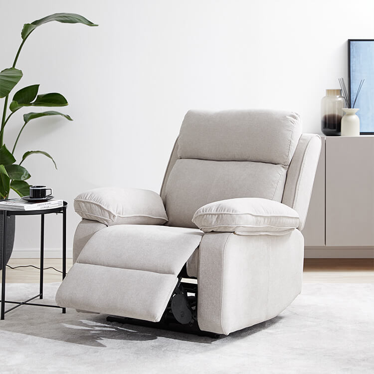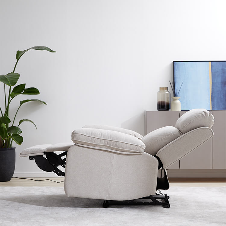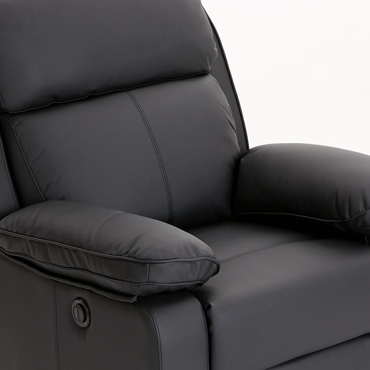 ボリュームクッションで身体を包み込みリラックスタイムを優雅な時間へと変えてくれる電動ソファ。頭から足元まで全身がやさしくホールドされるこの感覚を実際に体感してみてください。ゆったりと時が流れる幸せな休日はリラックスして過ごしたい。そんなあなたに使って欲しいのが、どんなくつろぎシーンでも活躍できる頼もしいリクライニングソファ。贅沢な時間をごゆるりとお過ごしください。座面サイドのボタンを押すだけだから老若男女問わず気軽にお使いいただけます。「レバーが重い・硬い」など、操作性の不便を感じさせないこだわりです。リクライニング角度は、「約140度」。ゴロンと横になるような角度は、本気で眠ってしまうかもしれません。