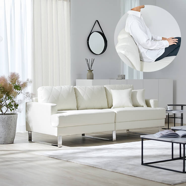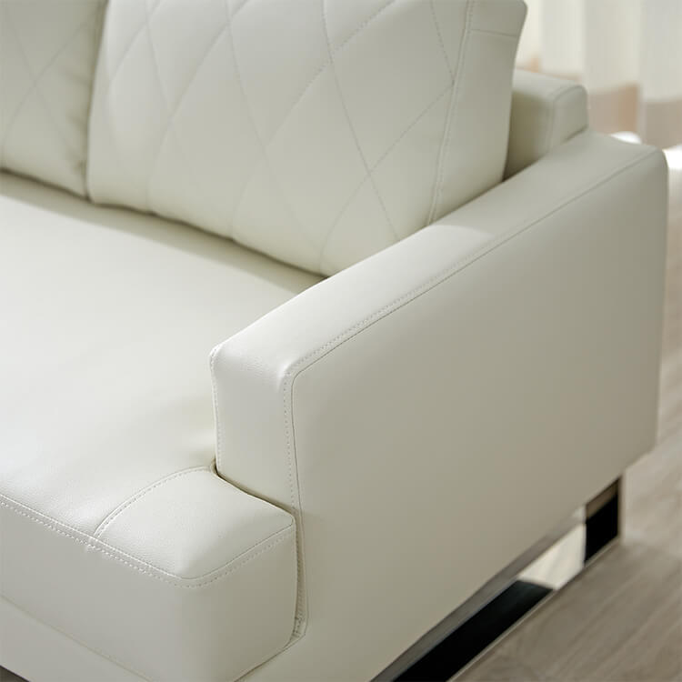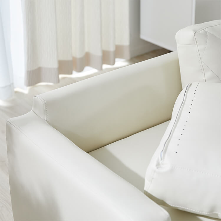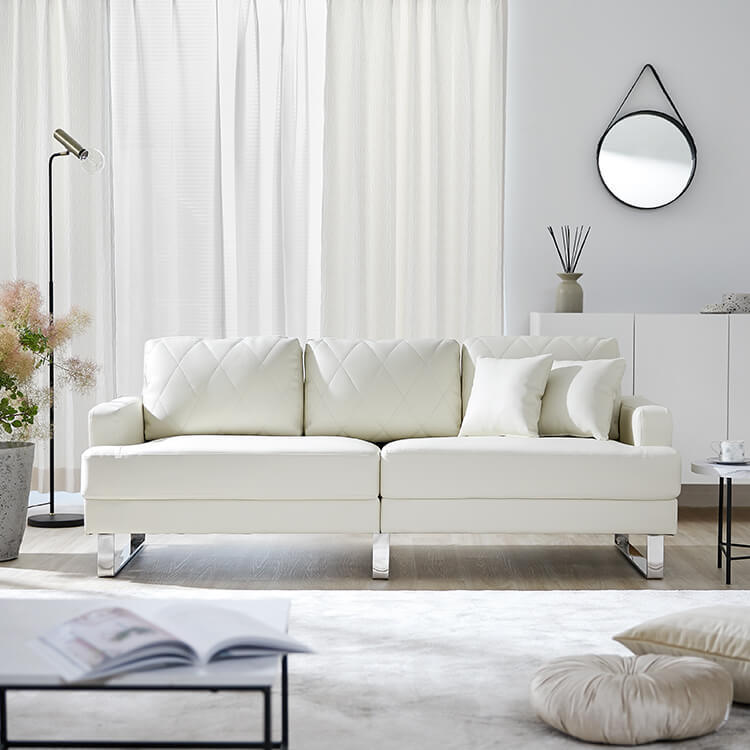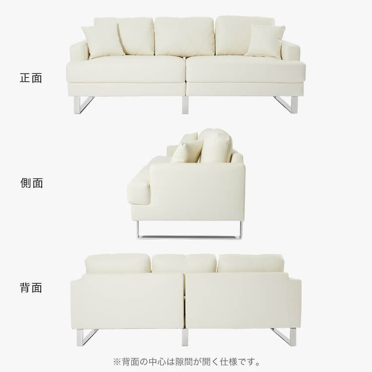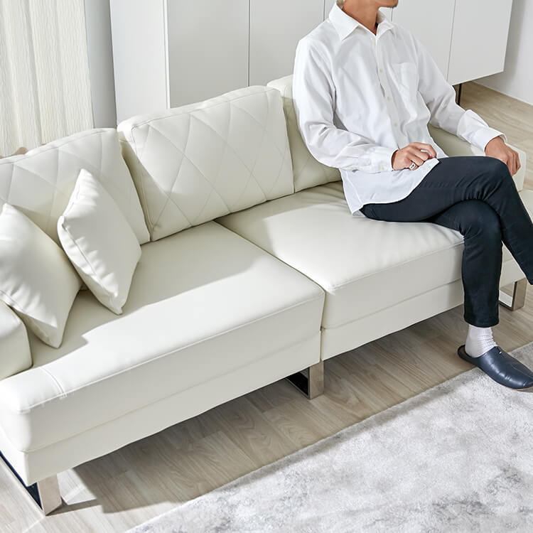清楚なホワイトをベースにした合皮のソファ。上品さを高めるダイヤモンド柄のステッチと、スチール脚のデザインが、しとやかで気品のあるモダンなリビングを演出します。当社で大人気のカウチソファを、3人掛けソファにリメイク!「ゆったりな寛ぎ」はそのままで、省スペースに置けるサイズ感とおしゃれなデザインになりました。「優雅な暮らしのスタイルをつくりたい」その思いから、置くだけで落ち着いたムードをつくるデザインを追求し、他には無い優雅なシンプルモダンのソファをカタチに。背もたれには、ムードを惹きたてる「ダイヤモンド柄」キルトを採用。ステッチを斜めに入れることで、シンプルながらもデザイン性の高いソファに仕上がりました。