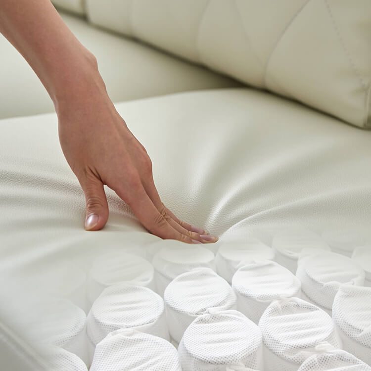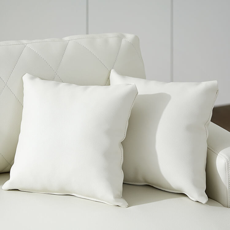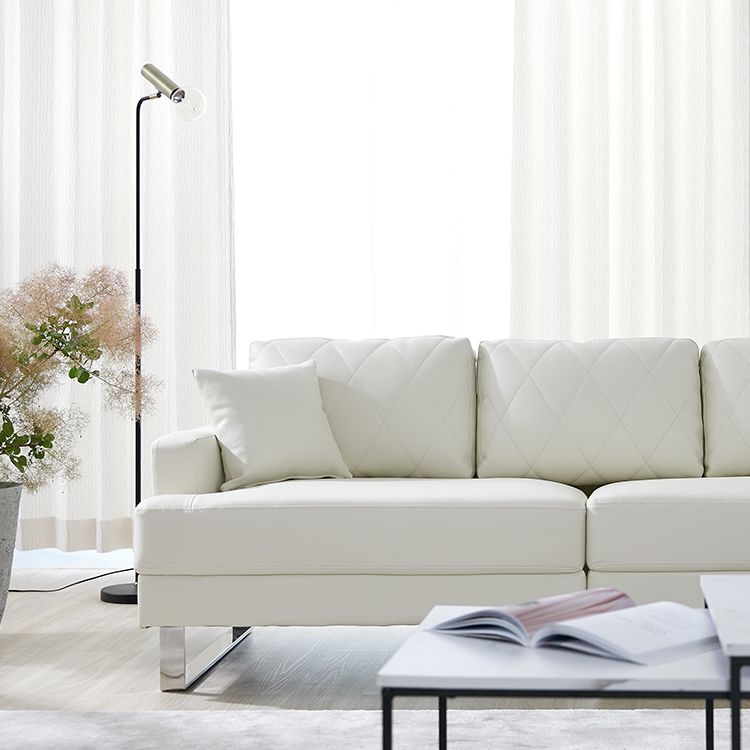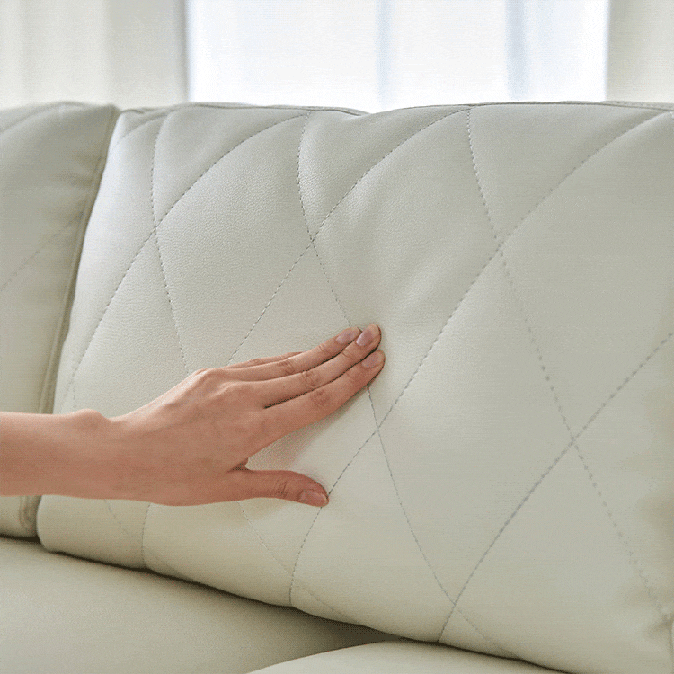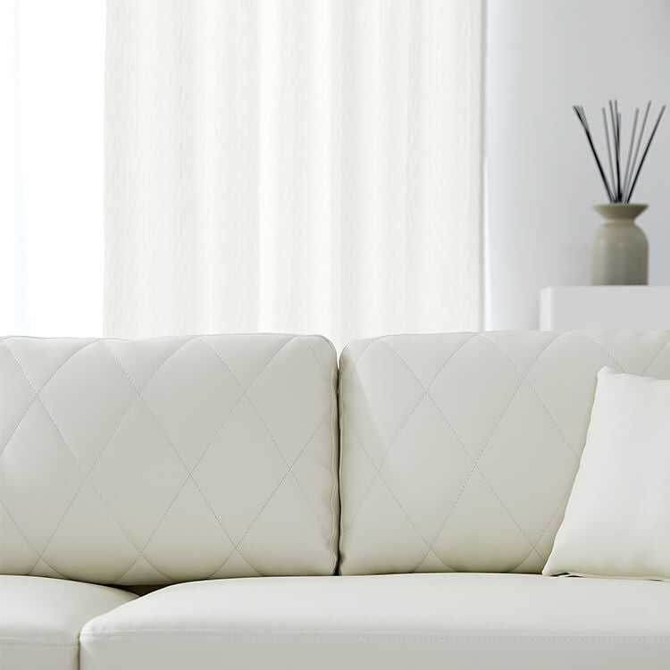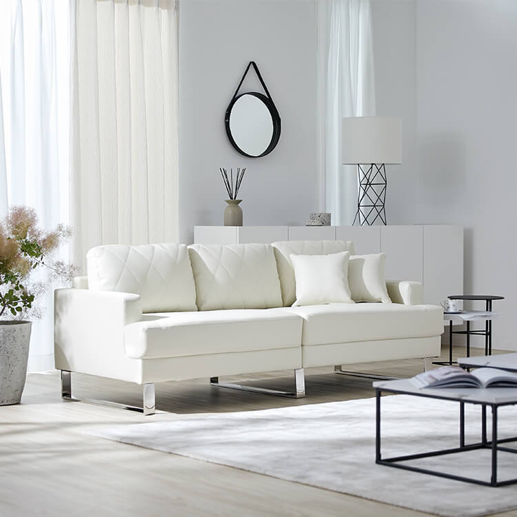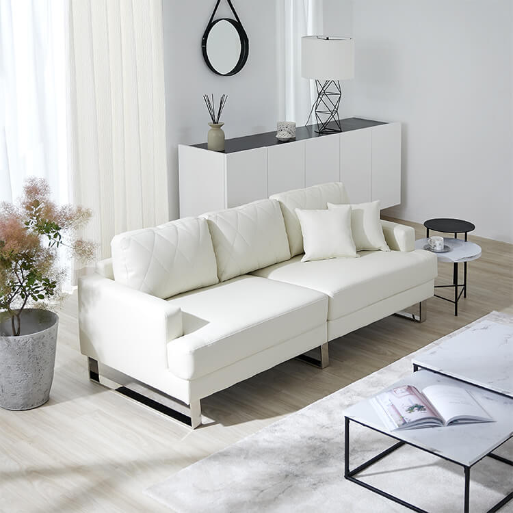 清楚なホワイトをベースにした合皮のソファ。上品さを高めるダイヤモンド柄のステッチと、スチール脚のデザインが、しとやかで気品のあるモダンなリビングを演出します。当社で大人気のカウチソファを、3人掛けソファにリメイク!「ゆったりな寛ぎ」はそのままで、省スペースに置けるサイズ感とおしゃれなデザインになりました。「優雅な暮らしのスタイルをつくりたい」その思いから、置くだけで落ち着いたムードをつくるデザインを追求し、他には無い優雅なシンプルモダンのソファをカタチに。背もたれには、ムードを惹きたてる「ダイヤモンド柄」キルトを採用。ステッチを斜めに入れることで、シンプルながらもデザイン性の高いソファに仕上がりました。
