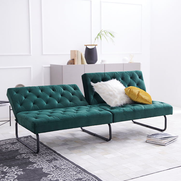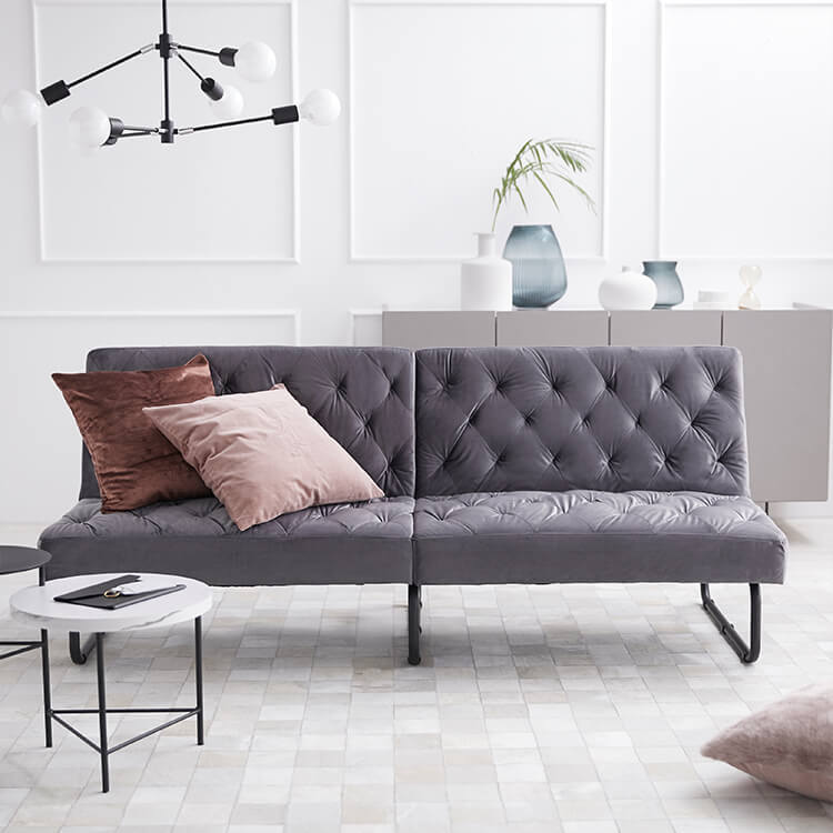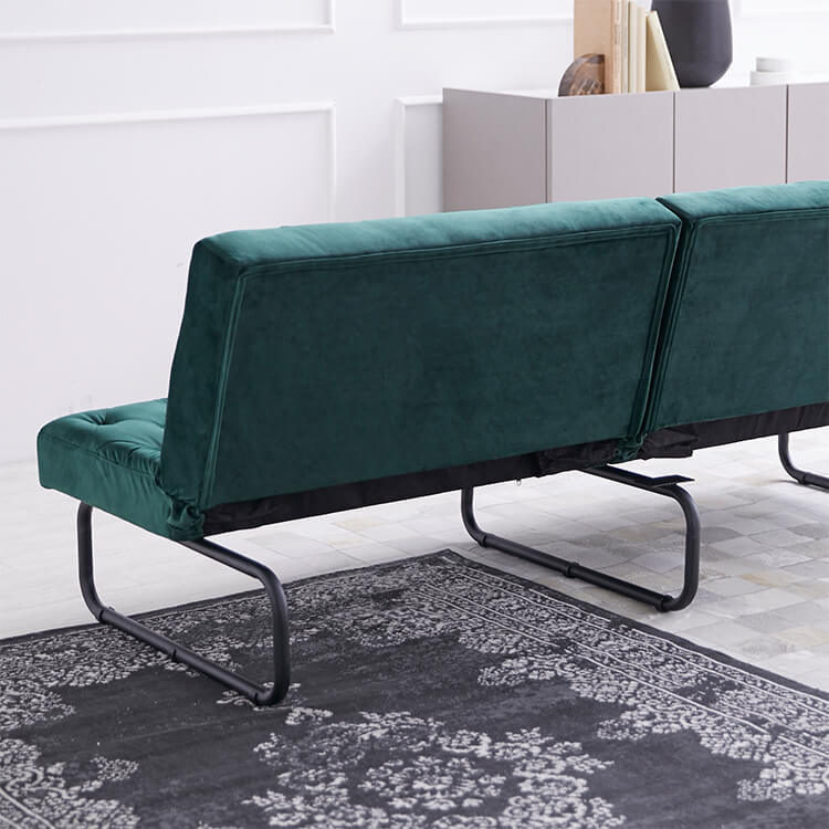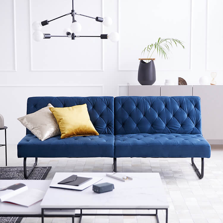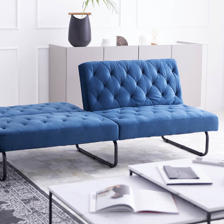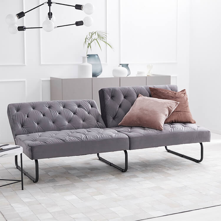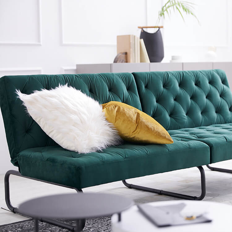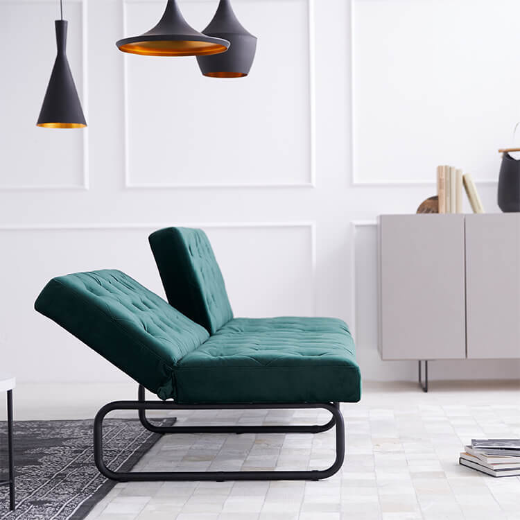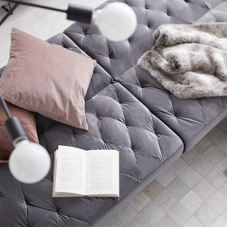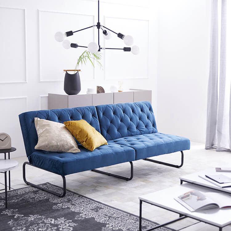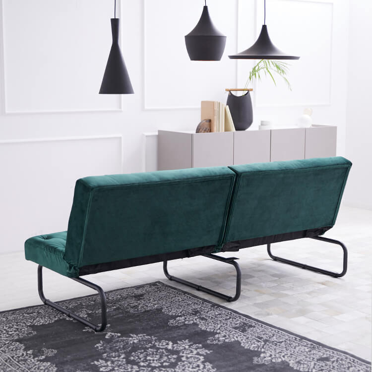 ベルベット調の生地とスチール脚の組み合わせがおしゃれな3.5人掛けソファ。2か所の背もたれは、片方だけ倒せば2人でそれぞれくつろげて、両方倒せばシングル相当のソファベッドに。様々なシーンに合わせて変えることができる贅沢ソファです。ゆったりとくつろげる3人掛けワイドサイズでも、お部屋に圧迫感を与えないバランスのとれたデザイン。空間に余裕があることで、より深いリラックスタイムをお過ごしいただけます。落ち着いた色味と美しい光沢が、優雅で高級感を漂わせる「ベルベット調の生地」を使用。見た目や手触りが良いだけでなく、毛玉ができにくいのも特徴です。ソファの全体に施された絞り加工のデザインが、高級感漂うの魅力をさらに高めています。絞り加工によくあるボタンを付けていないので、座ったり横になった時も、心地よく身体を受け止めてくれます。