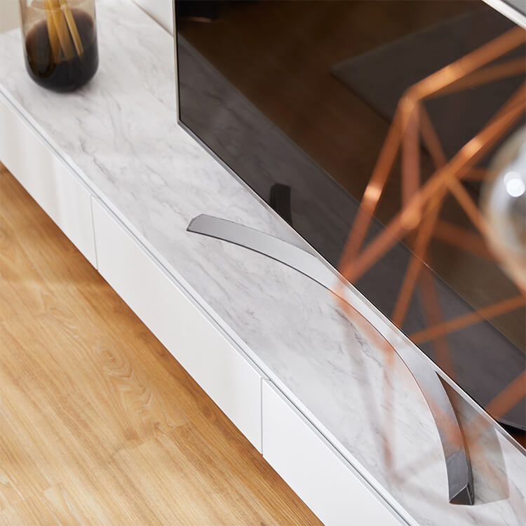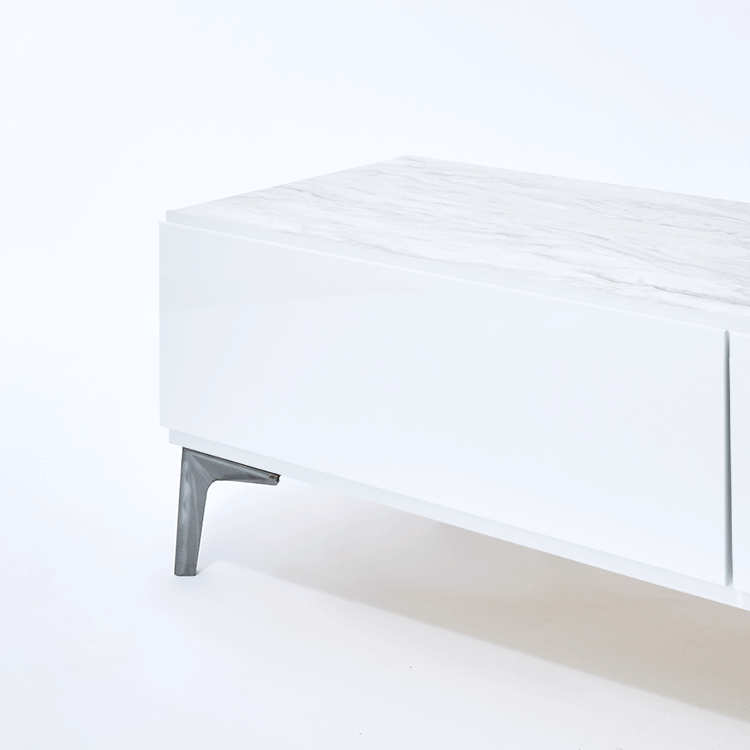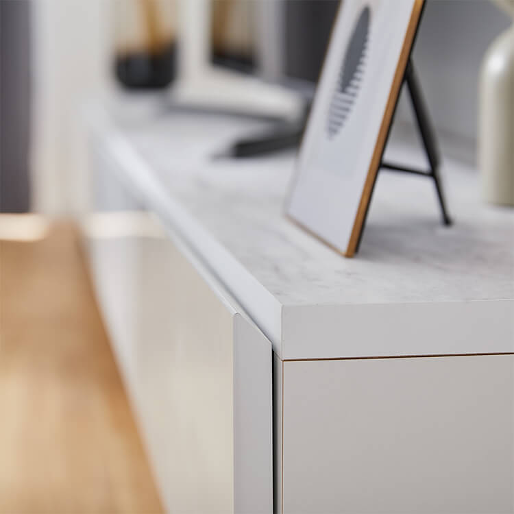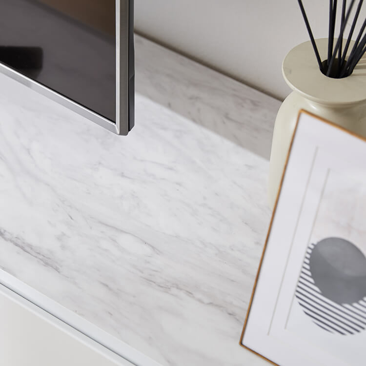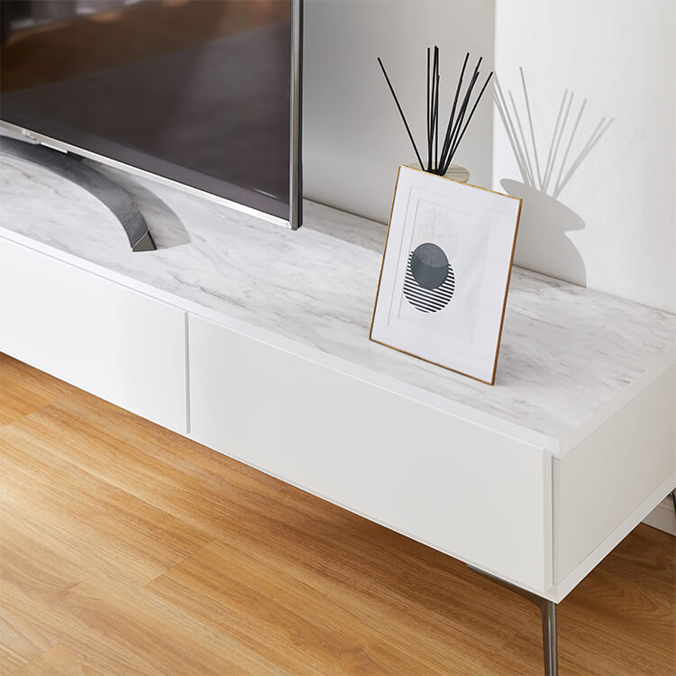 つやのあるホワイト前扉と、大理石柄の天板、そしてすっきりとしたスチール脚。置くだけでお部屋をたちまちラグジュアリーな空間へ。大型サイズのテレビやスピーカーなどを一緒に置けて、収納スペースも充実のワイドサイズのTV台です。ホワイトの扉と、大理石柄の天板を美しく惹き立てる、無駄のない洗練されたデザイン。どんなインテリアにもスッと馴染み高級感のある空間へ。天板には、本物のようなリアルさと高級感が感じられるホワイト大理石柄を採用。置くものをお洒落に魅せ、こなれた雰囲気を演出します。本体の高さは35cmと、通常のTVボードと比較しても低めの作りになっています。空間を圧迫しないので、お部屋をスッキリと見せてくれます。