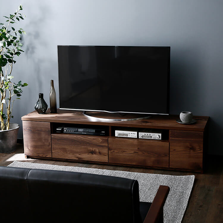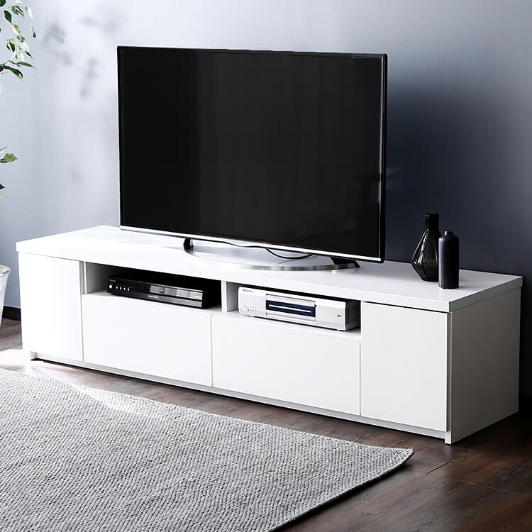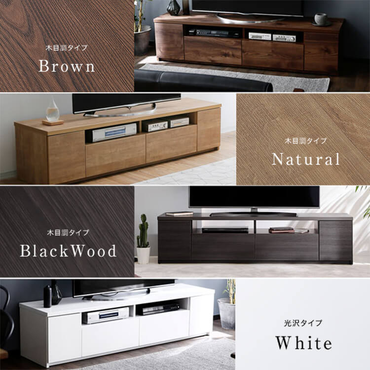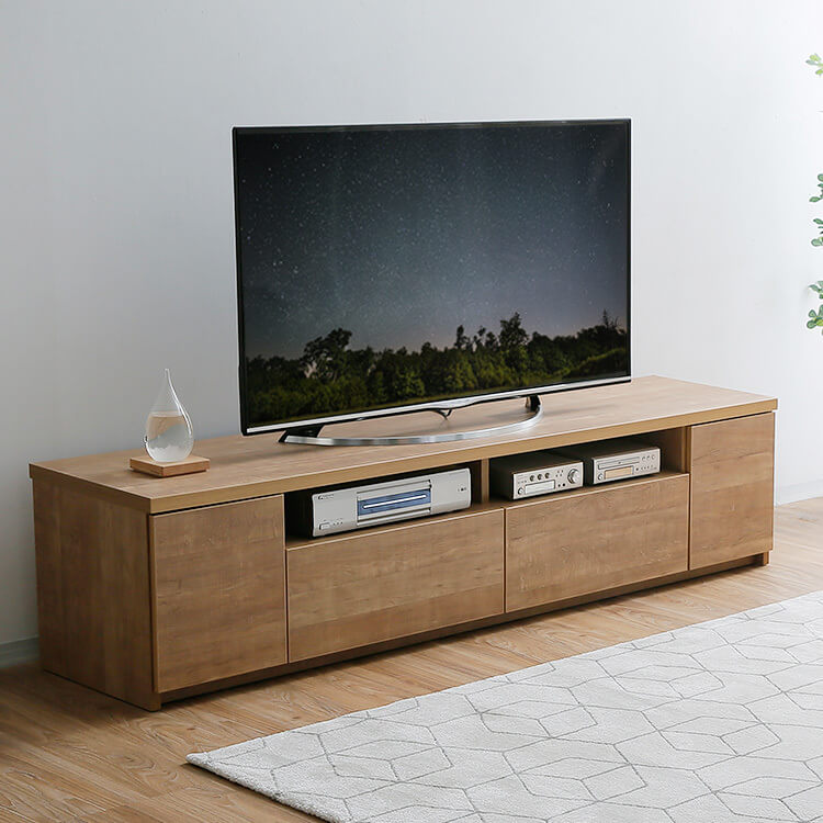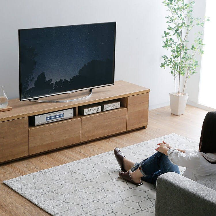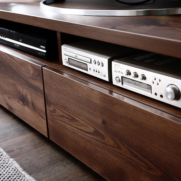 無駄をそぎ落としたシンプルでフラットなデザインは、お部屋にスッと溶け込む美しさ。いろんなテイストのお部屋にしっくり馴染み、落ち着いたリビングのムードを演出します。使いやすさ、デザイン性にこだわった、日本製のテレビボードです。本物の木のような木目の「木目調タイプ」と、ツヤ感が美しい「光沢タイプ」の選べる2つのタイプをご用意しました。木目調タイプには繊細なエンボス加工が施されており、触れても本物の木のような凹凸感とサラリとした手触りを感じることができます。高さ12センチのAV機器スペースは、レコーダーやゲーム機など、横に2台並べて使えるからとても便利。真ん中2つの引き出しは、DVDや本も大量に収納できます。リビングにある小物類も、引き出しに収納してしまえば閉めるだけで、お部屋がサッと片付きます。